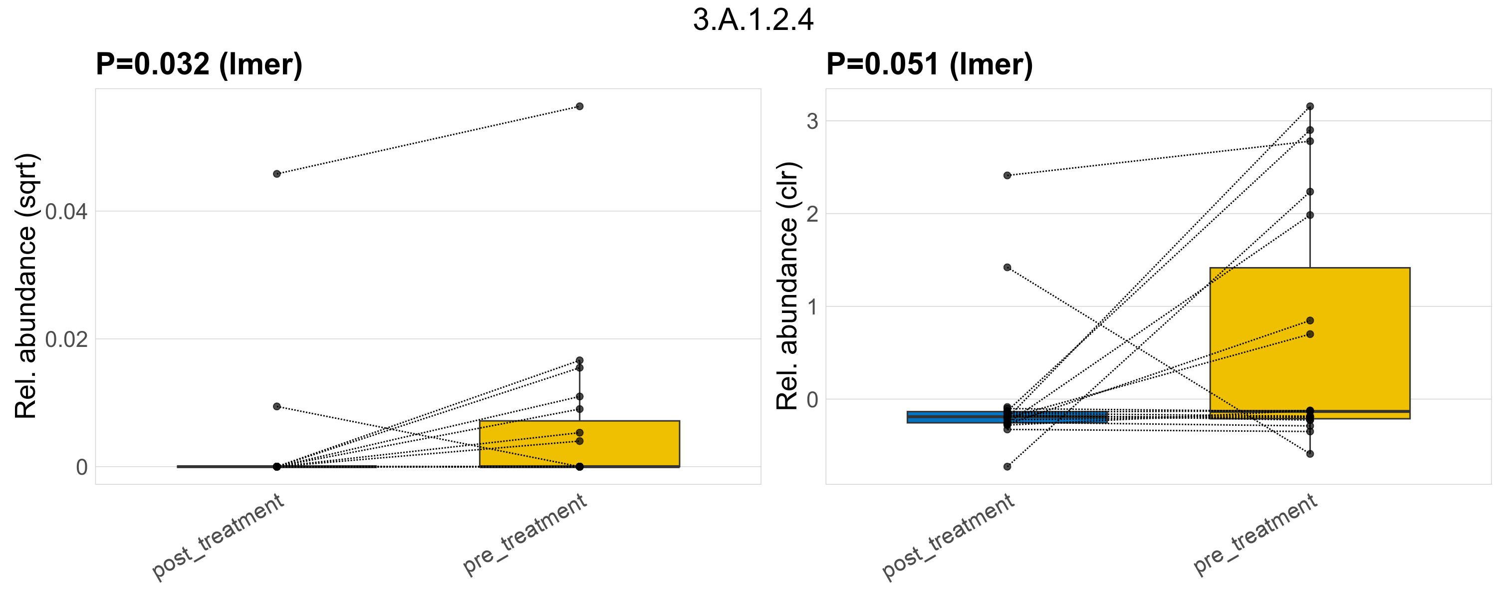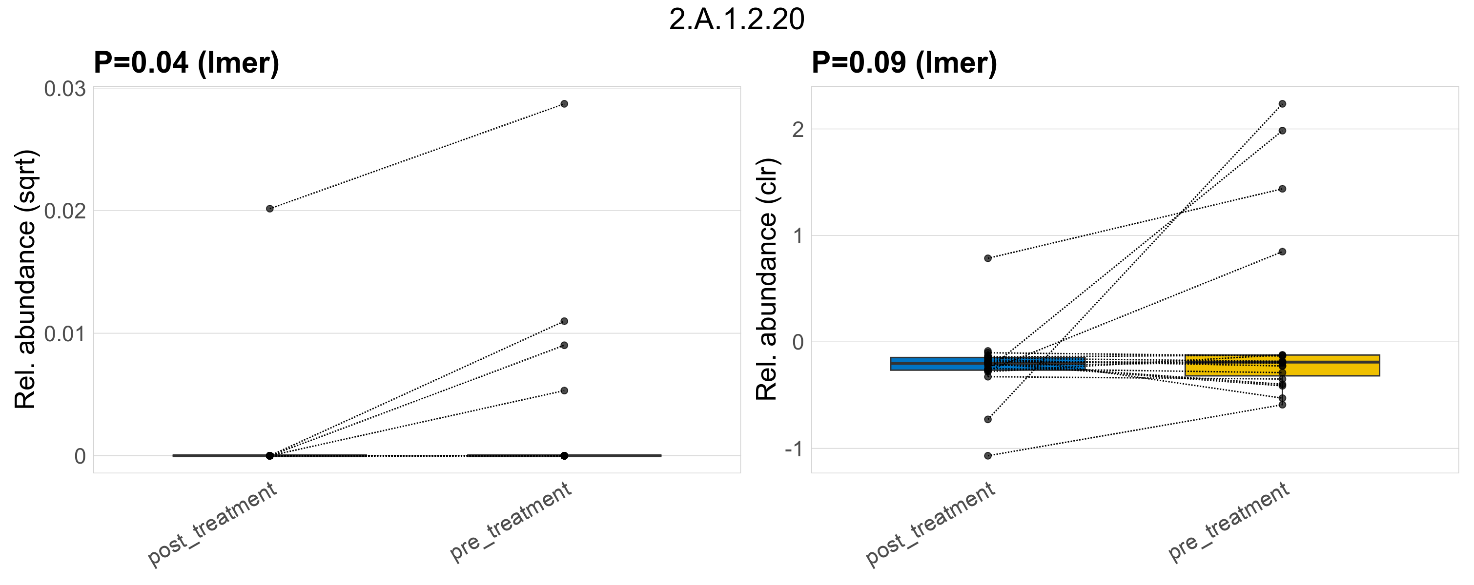 | Function | Annotation | P lmer condition effect (sqrt) | FDR lmer condition effect (sqrt) | Pbonf lmer condition effect (sqrt) | P lmer condition effect (clr) | FDR lmer condition effect (clr) | Pbonf lmer condition effect (clr) | Mean Pos | Mean Abundance | Median Abundance | Mean Treatmentpost_treatment | Median Treatmentpost_treatment | SD Treatmentpost_treatment | Mean Treatmentpre_treatment | Median Treatmentpre_treatment | SD Treatmentpre_treatment | Fold Change Log2(Treatmentpre_treatment/Treatmentpost_treatment) | Positive samples | Positive Treatmentpost_treatment | Positive Treatmentpre_treatment | Positive_Treatmentpost_treatment_percent | Positive_Treatmentpre_treatment_percent |