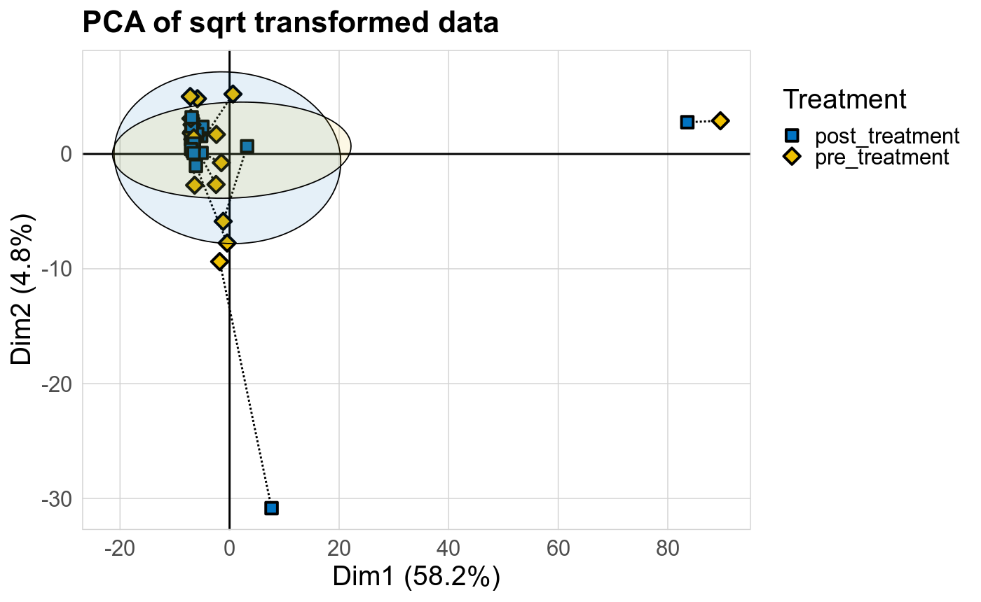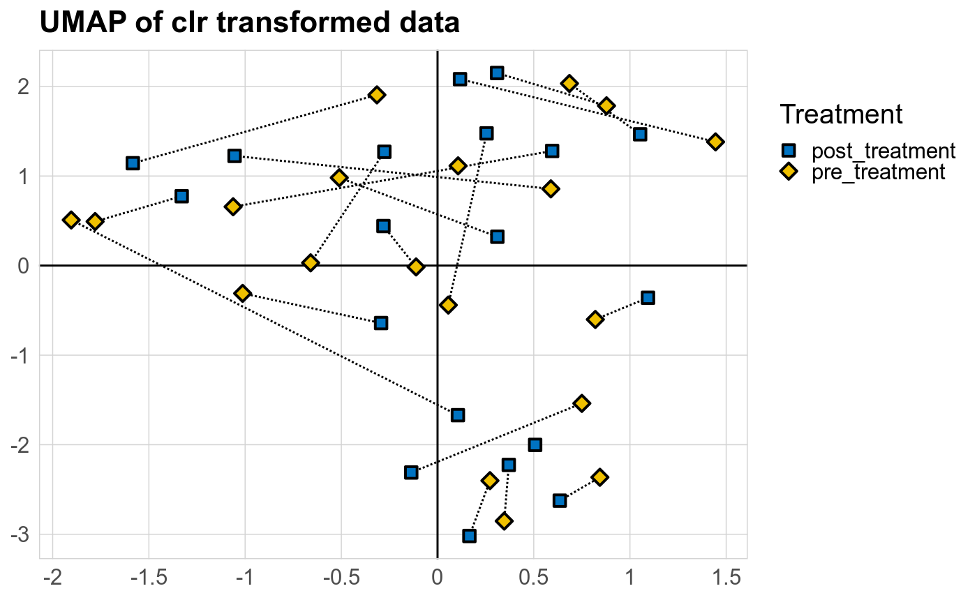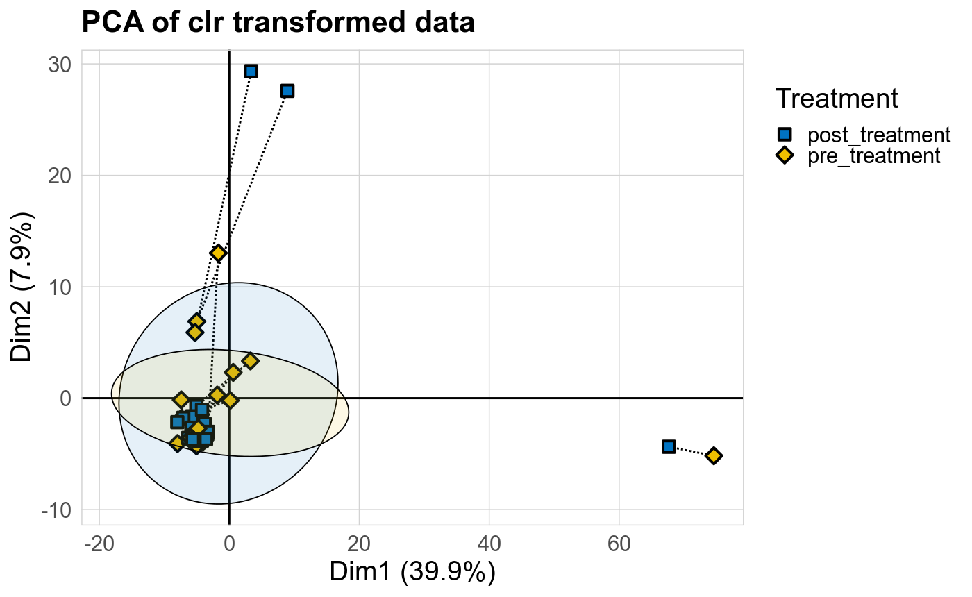 Microbial functions were analyzed using supervised and unsupervised multivariate techniques. Functional profiles were ordinated using the unsupervised methods Principal Coordinates Analysis (PCoA), Non-Metric Multidimensional Scaling (NMDS) and Principal Component Analysis (PCA). The supervised methods Adonis and Redundancy analysis (RDA) were used to assess if variance in the functional profiles was significantly associated with the study condition. A guide explaining these methods can be found here. Sparse Partial Least Square Discriminant Analysis (sPLS-DA) from the MixMc package was additionaly used to extract features associated with the condition of interest.