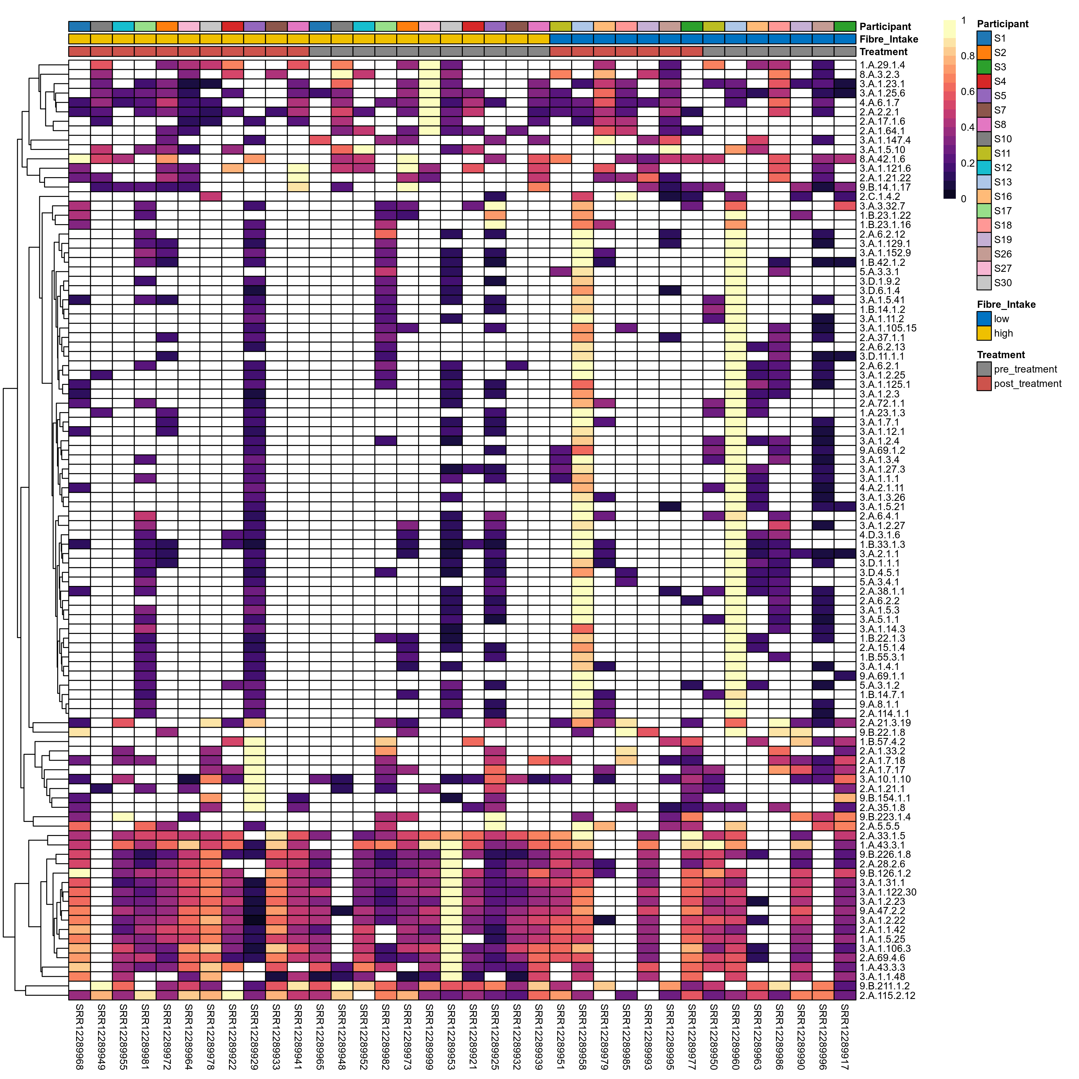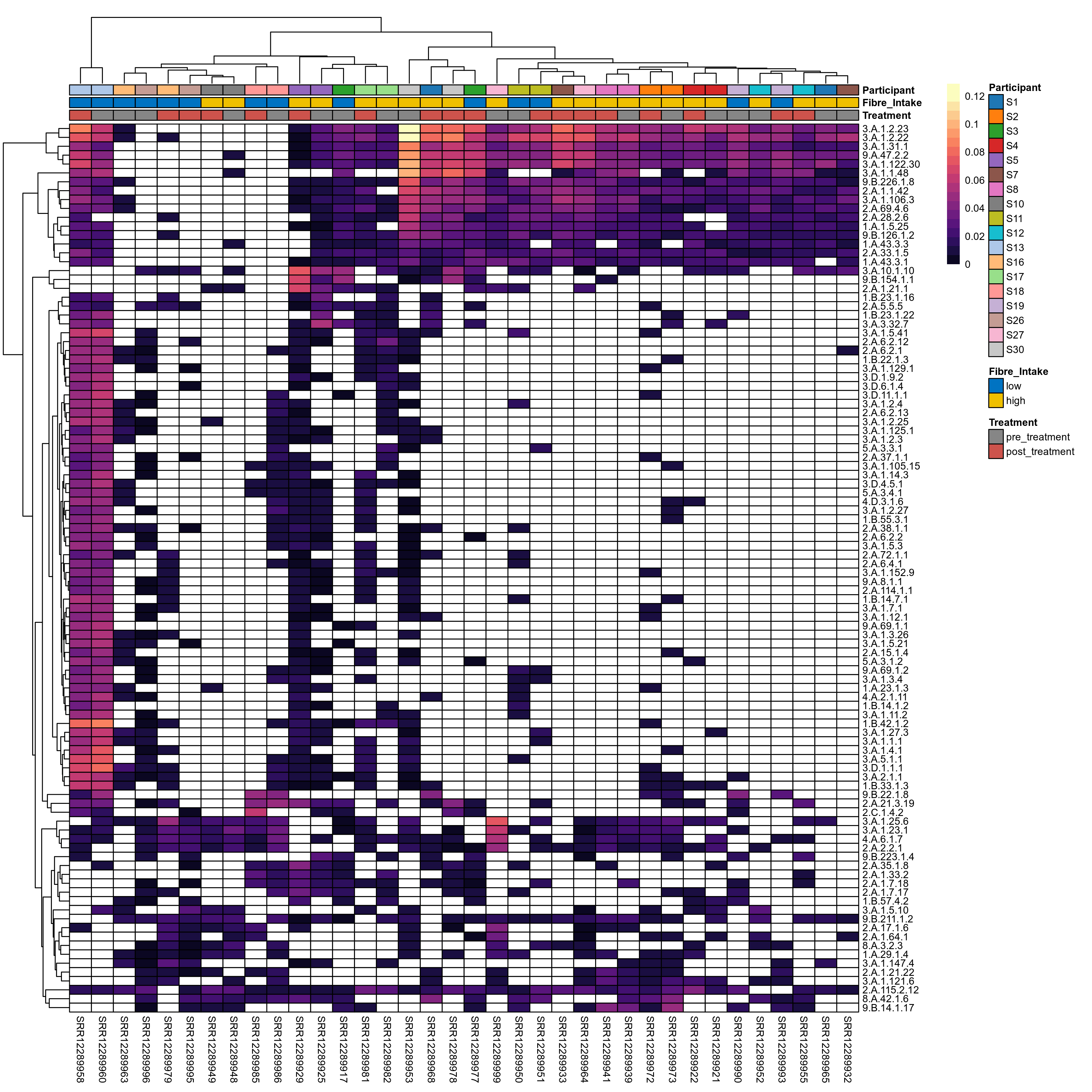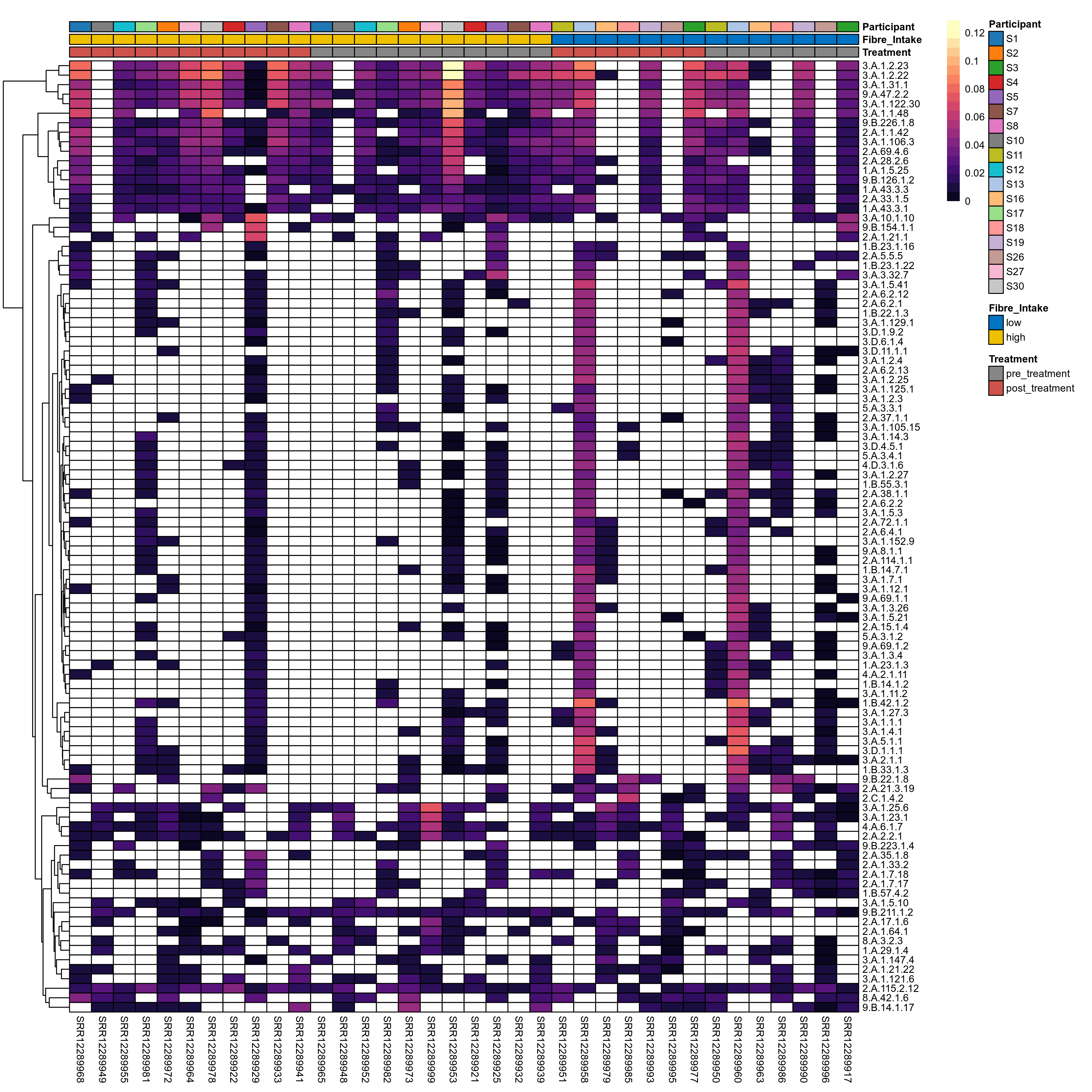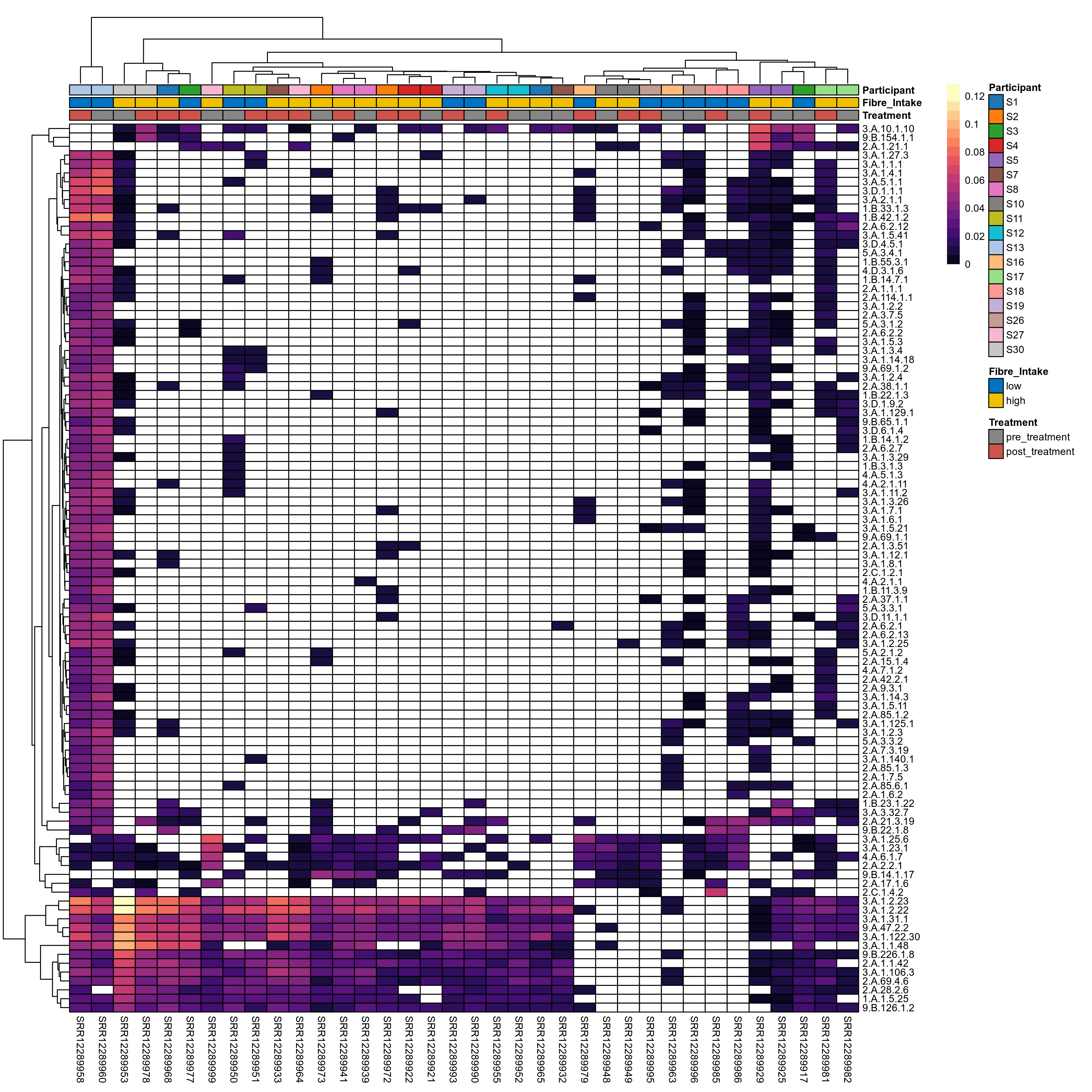 | Index | rarefiedTo | P lmer treatment effect (interaction) | Mean Pos | Mean Abundance | Median Abundance | Mean Fibre_Intakelow:Treatmentpre_treatment | Median Fibre_Intakelow:Treatmentpre_treatment | SD Fibre_Intakelow:Treatmentpre_treatment | Mean Fibre_Intakelow:Treatmentpost_treatment | Median Fibre_Intakelow:Treatmentpost_treatment | SD Fibre_Intakelow:Treatmentpost_treatment | Fold Change Log2(Fibre_Intakelow:Treatmentpost_treatment/Fibre_Intakelow:Treatmentpre_treatment) | Positive samples | Positive Fibre_Intakelow:Treatmentpre_treatment | Positive Fibre_Intakelow:Treatmentpost_treatment | Positive_Fibre_Intakelow:Treatmentpre_treatment_percent | Positive_Fibre_Intakelow:Treatmentpost_treatment_percent | Mean Fibre_Intakehigh:Treatmentpre_treatment | Median Fibre_Intakehigh:Treatmentpre_treatment | SD Fibre_Intakehigh:Treatmentpre_treatment | Mean Fibre_Intakehigh:Treatmentpost_treatment | Median Fibre_Intakehigh:Treatmentpost_treatment | SD Fibre_Intakehigh:Treatmentpost_treatment | Fold Change Log2(Fibre_Intakehigh:Treatmentpost_treatment/Fibre_Intakehigh:Treatmentpre_treatment) | Positive Fibre_Intakehigh:Treatmentpre_treatment | Positive Fibre_Intakehigh:Treatmentpost_treatment | Positive_Fibre_Intakehigh:Treatmentpre_treatment_percent | Positive_Fibre_Intakehigh:Treatmentpost_treatment_percent |