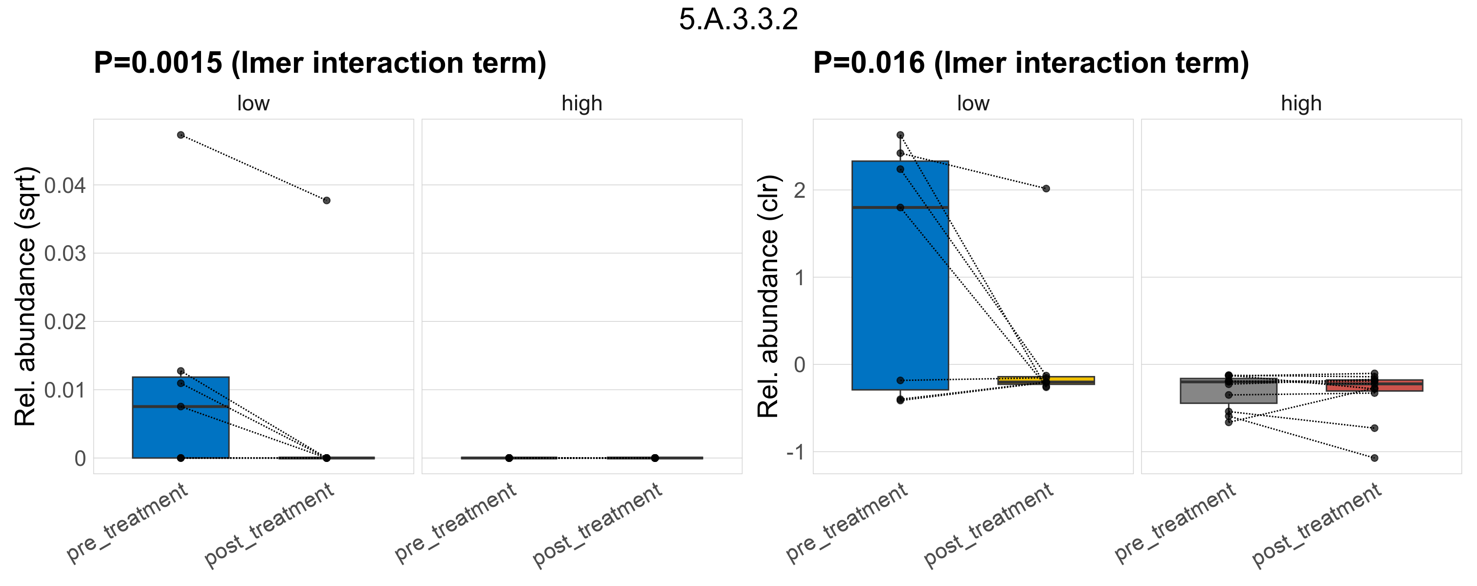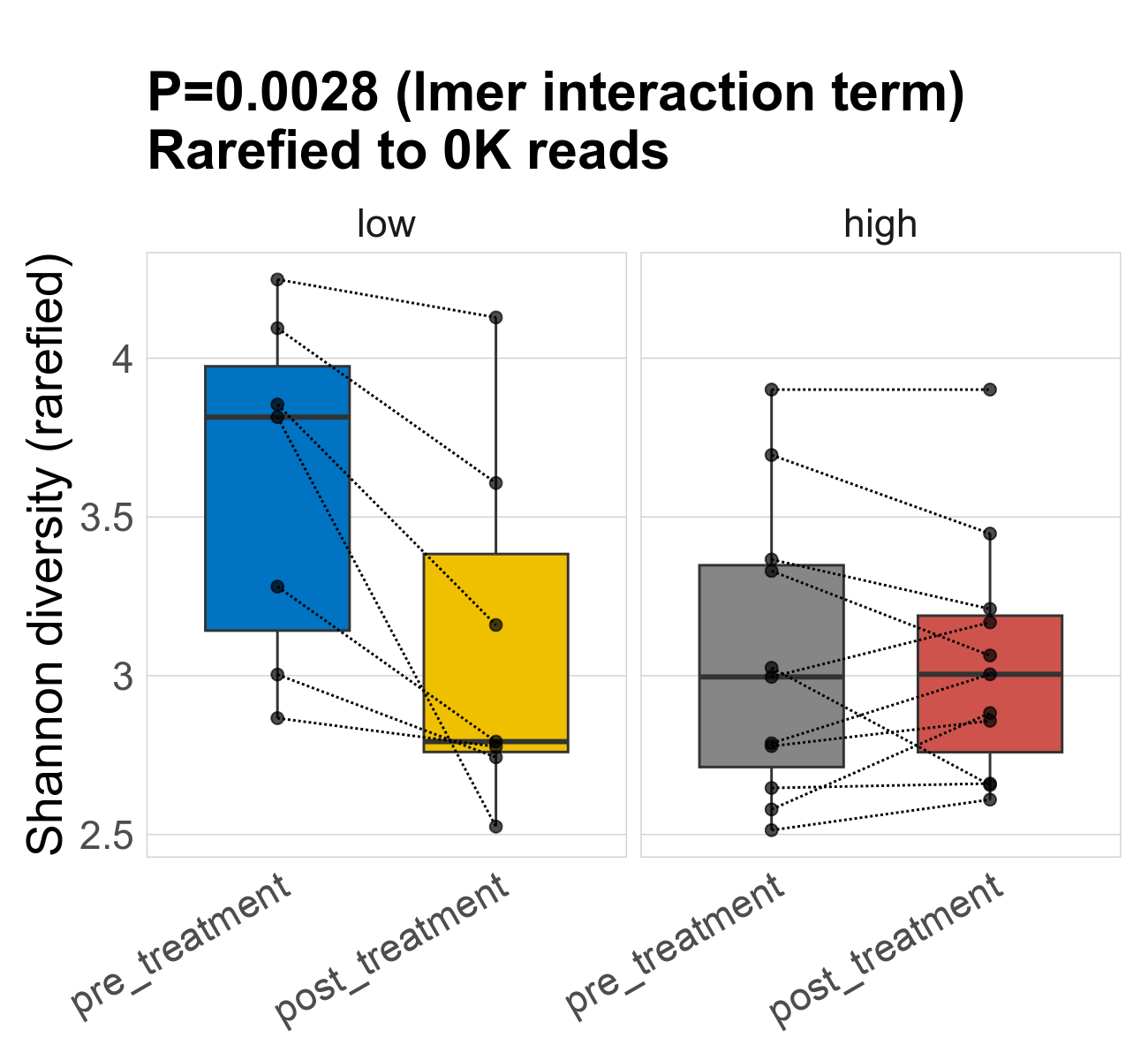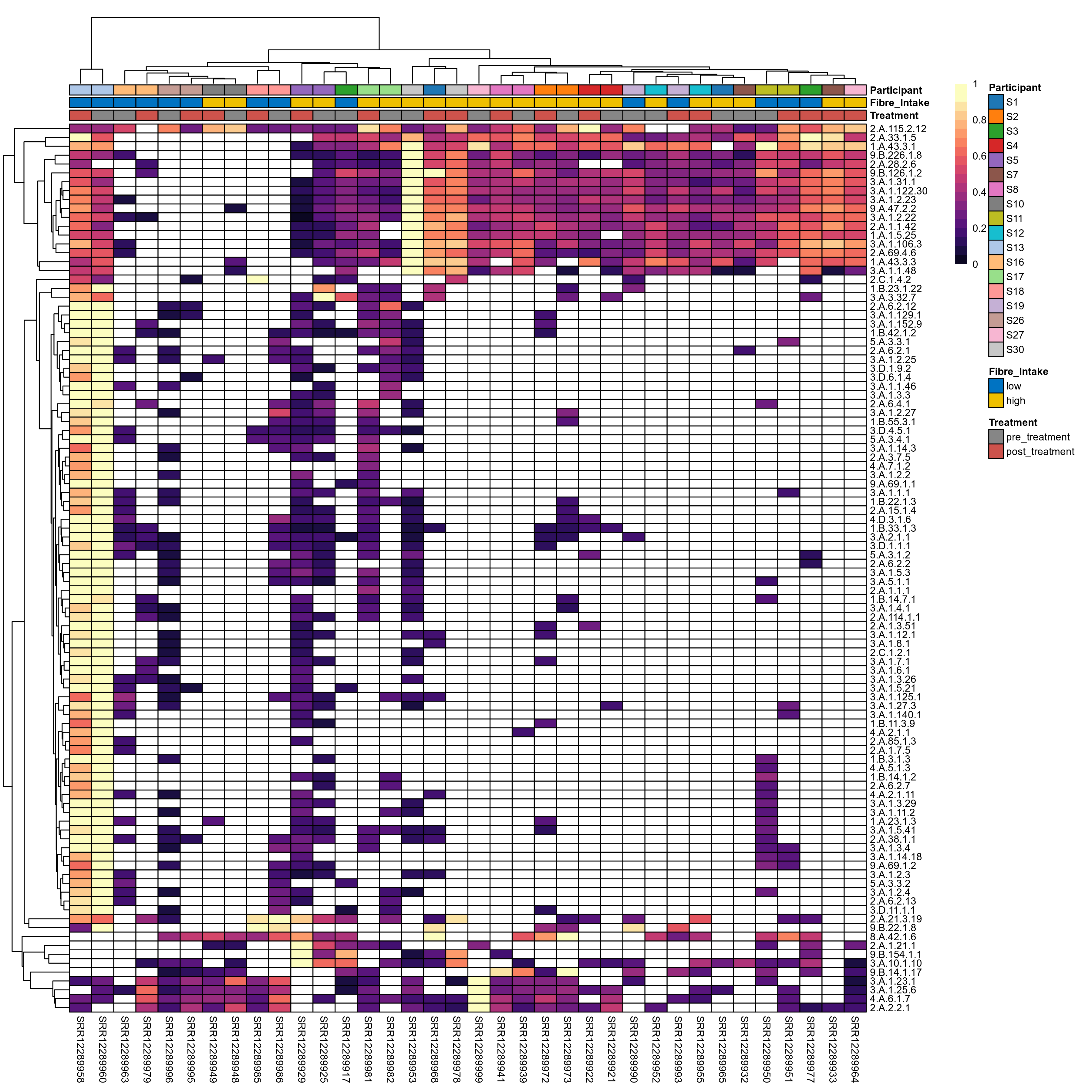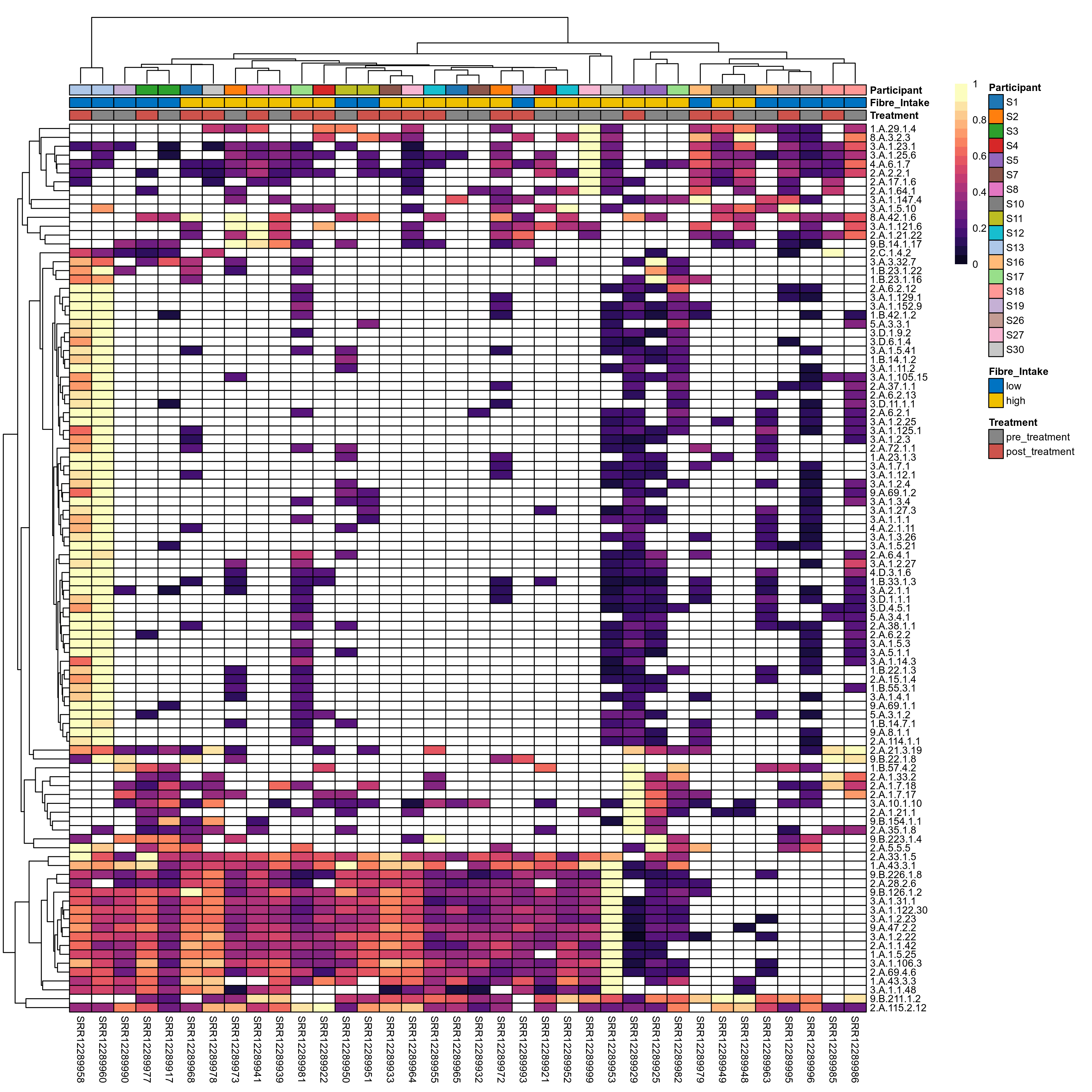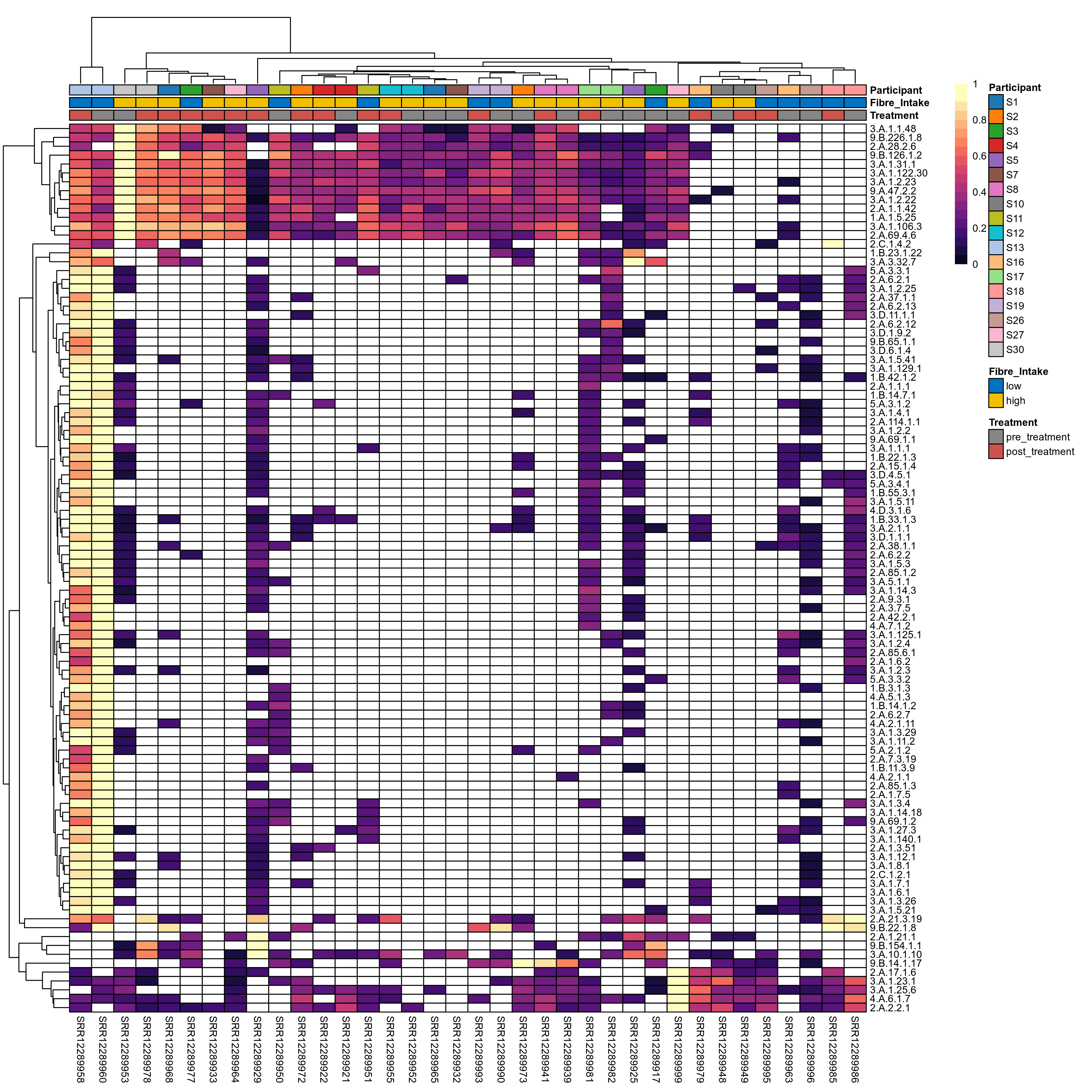 | Index | rarefiedTo | P lmer treatment effect (interaction) | Mean Pos | Mean Abundance | Median Abundance | Mean Fibre_Intakelow:Treatmentpre_treatment | Median Fibre_Intakelow:Treatmentpre_treatment | SD Fibre_Intakelow:Treatmentpre_treatment | Mean Fibre_Intakelow:Treatmentpost_treatment | Median Fibre_Intakelow:Treatmentpost_treatment | SD Fibre_Intakelow:Treatmentpost_treatment | Fold Change Log2(Fibre_Intakelow:Treatmentpost_treatment/Fibre_Intakelow:Treatmentpre_treatment) | Positive samples | Positive Fibre_Intakelow:Treatmentpre_treatment | Positive Fibre_Intakelow:Treatmentpost_treatment | Positive_Fibre_Intakelow:Treatmentpre_treatment_percent | Positive_Fibre_Intakelow:Treatmentpost_treatment_percent | Mean Fibre_Intakehigh:Treatmentpre_treatment | Median Fibre_Intakehigh:Treatmentpre_treatment | SD Fibre_Intakehigh:Treatmentpre_treatment | Mean Fibre_Intakehigh:Treatmentpost_treatment | Median Fibre_Intakehigh:Treatmentpost_treatment | SD Fibre_Intakehigh:Treatmentpost_treatment | Fold Change Log2(Fibre_Intakehigh:Treatmentpost_treatment/Fibre_Intakehigh:Treatmentpre_treatment) | Positive Fibre_Intakehigh:Treatmentpre_treatment | Positive Fibre_Intakehigh:Treatmentpost_treatment | Positive_Fibre_Intakehigh:Treatmentpre_treatment_percent | Positive_Fibre_Intakehigh:Treatmentpost_treatment_percent |