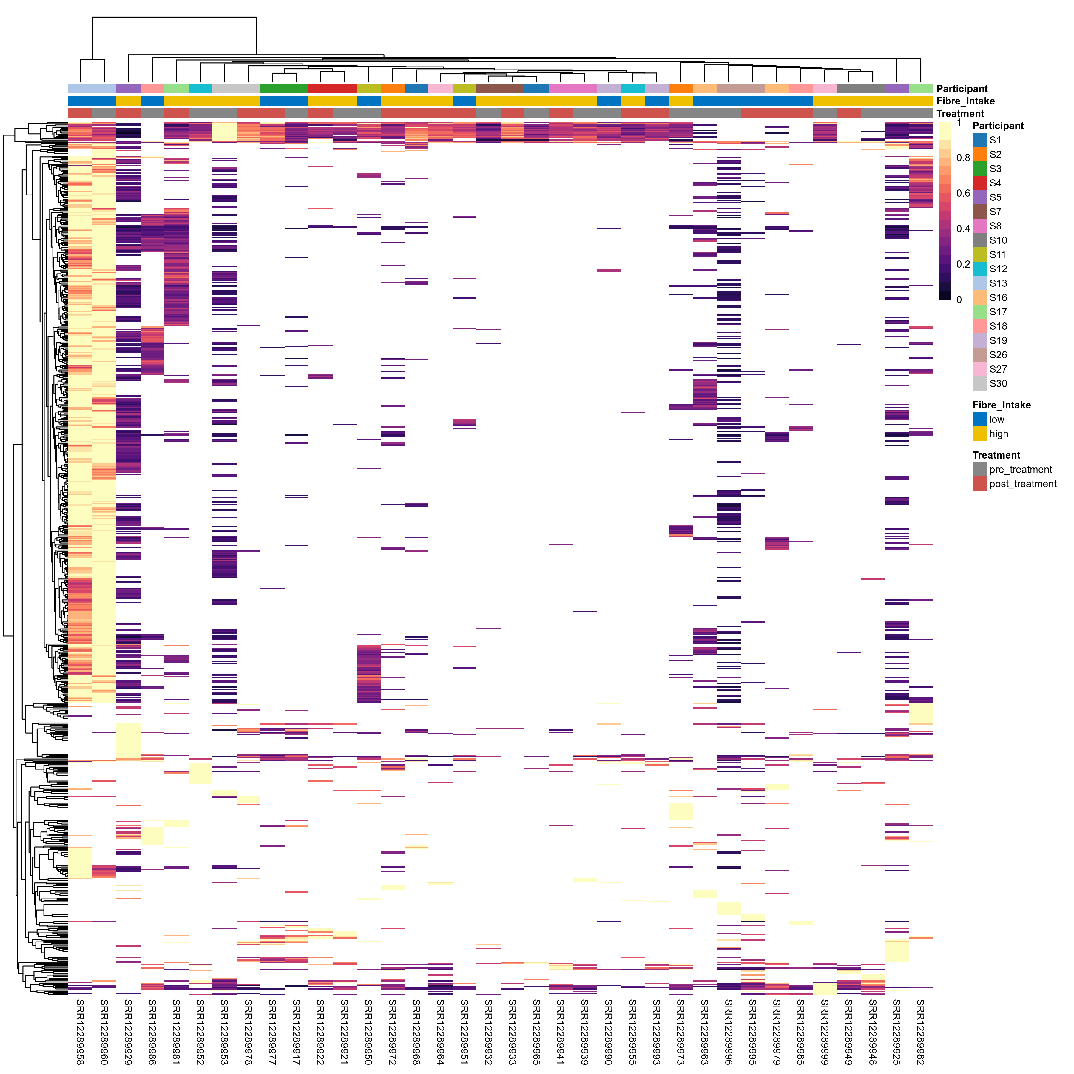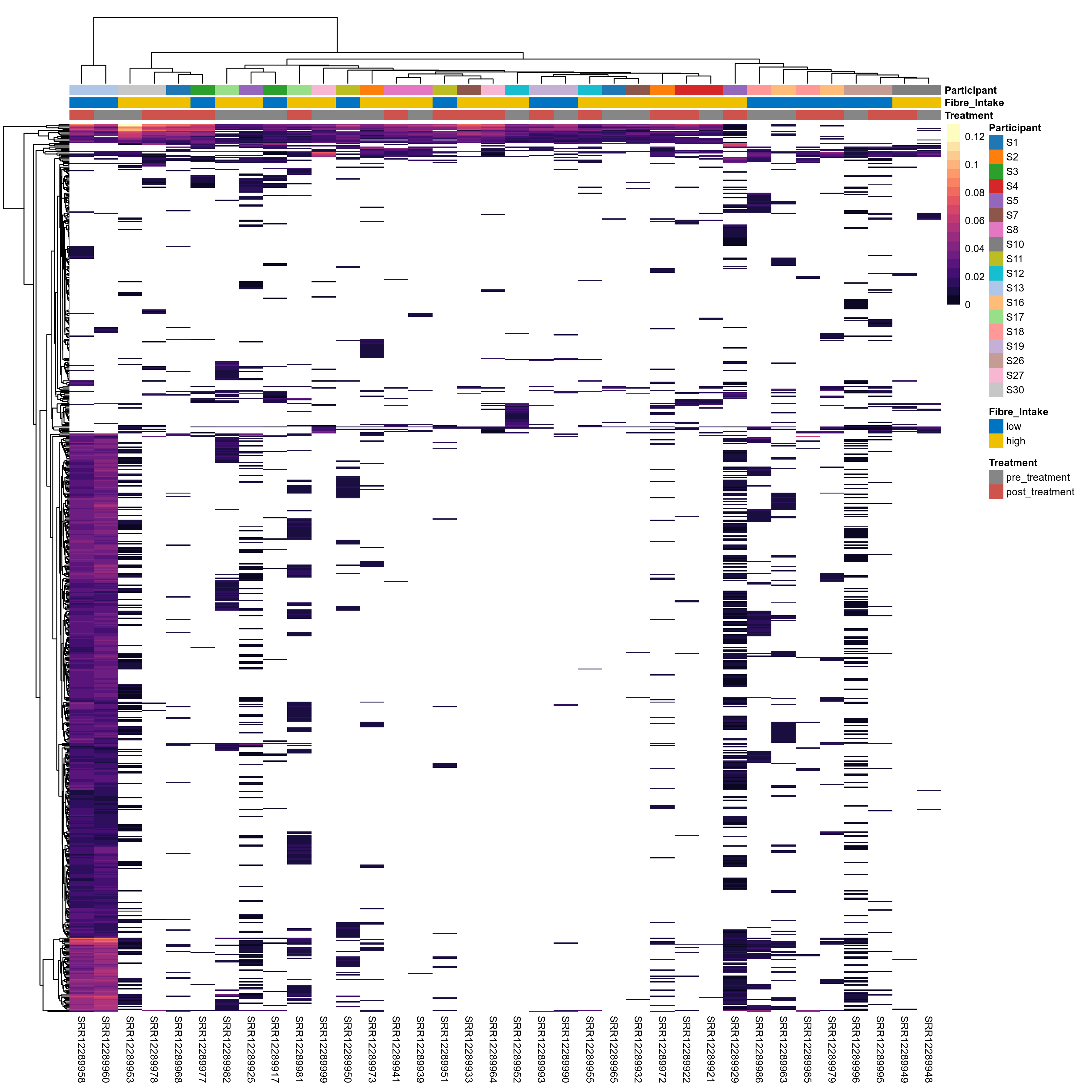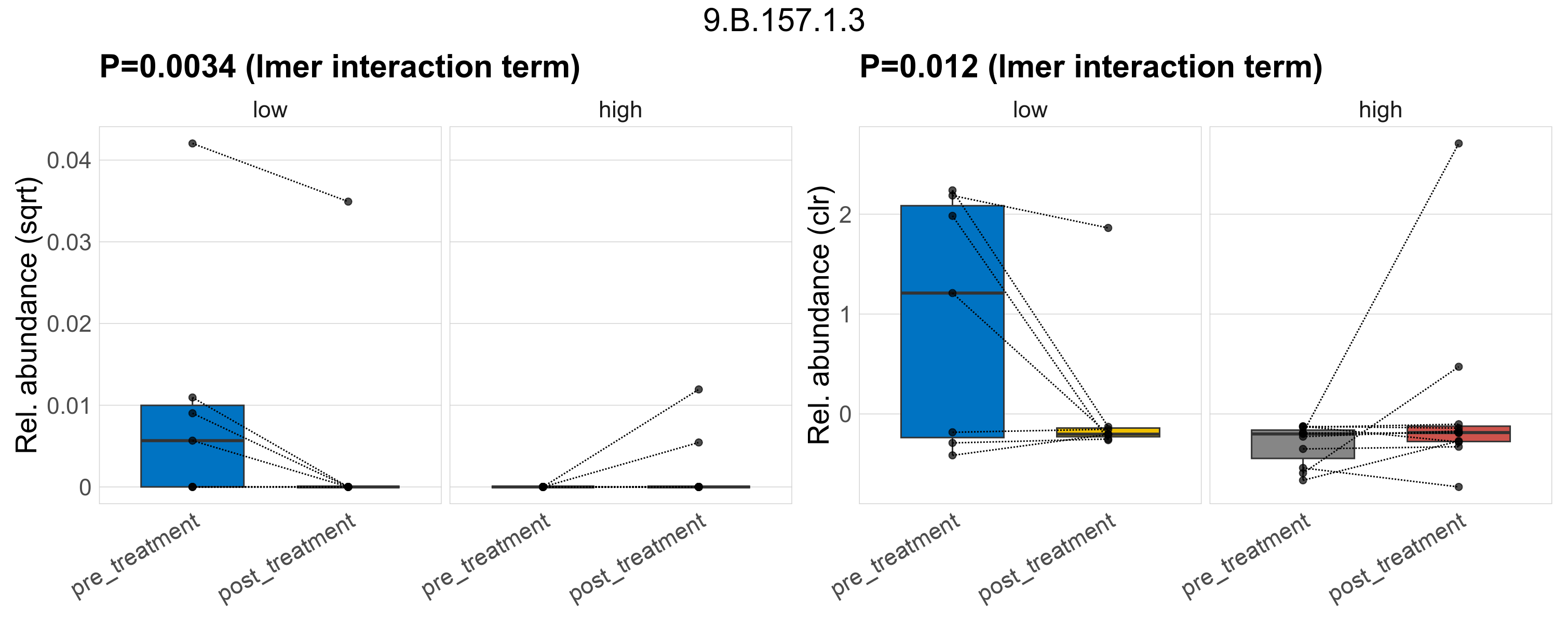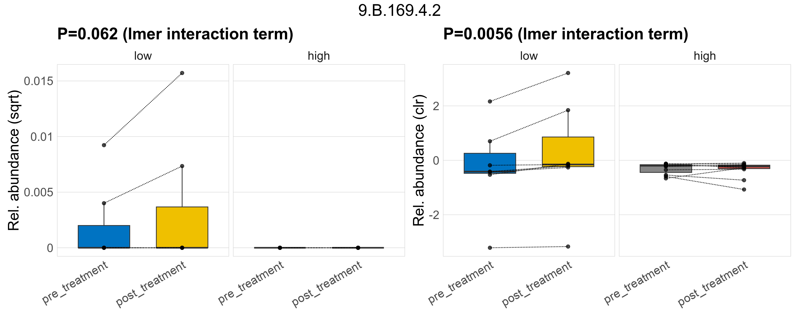 | Index | rarefiedTo | P lmer treatment effect (interaction) | Mean Pos | Mean Abundance | Median Abundance | Mean Fibre_Intakelow:Treatmentpre_treatment | Median Fibre_Intakelow:Treatmentpre_treatment | SD Fibre_Intakelow:Treatmentpre_treatment | Mean Fibre_Intakelow:Treatmentpost_treatment | Median Fibre_Intakelow:Treatmentpost_treatment | SD Fibre_Intakelow:Treatmentpost_treatment | Fold Change Log2(Fibre_Intakelow:Treatmentpost_treatment/Fibre_Intakelow:Treatmentpre_treatment) | Positive samples | Positive Fibre_Intakelow:Treatmentpre_treatment | Positive Fibre_Intakelow:Treatmentpost_treatment | Positive_Fibre_Intakelow:Treatmentpre_treatment_percent | Positive_Fibre_Intakelow:Treatmentpost_treatment_percent | Mean Fibre_Intakehigh:Treatmentpre_treatment | Median Fibre_Intakehigh:Treatmentpre_treatment | SD Fibre_Intakehigh:Treatmentpre_treatment | Mean Fibre_Intakehigh:Treatmentpost_treatment | Median Fibre_Intakehigh:Treatmentpost_treatment | SD Fibre_Intakehigh:Treatmentpost_treatment | Fold Change Log2(Fibre_Intakehigh:Treatmentpost_treatment/Fibre_Intakehigh:Treatmentpre_treatment) | Positive Fibre_Intakehigh:Treatmentpre_treatment | Positive Fibre_Intakehigh:Treatmentpost_treatment | Positive_Fibre_Intakehigh:Treatmentpre_treatment_percent | Positive_Fibre_Intakehigh:Treatmentpost_treatment_percent |