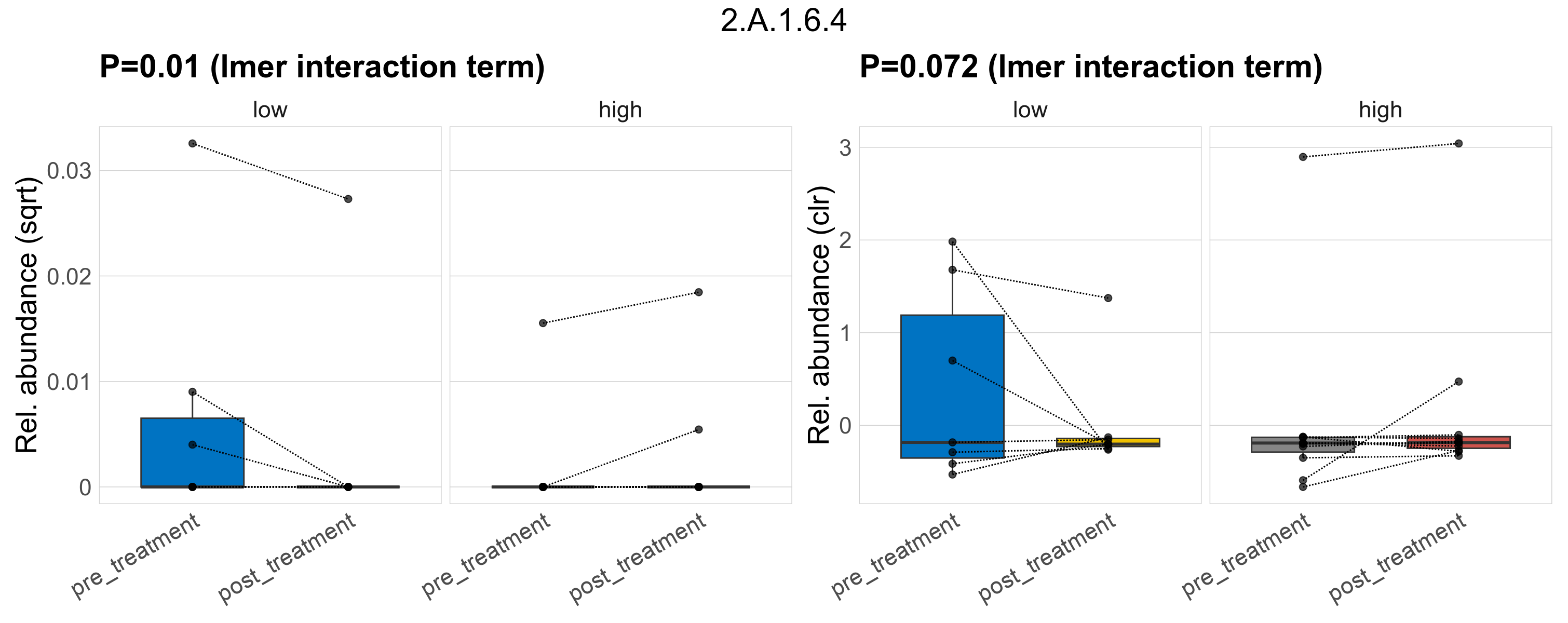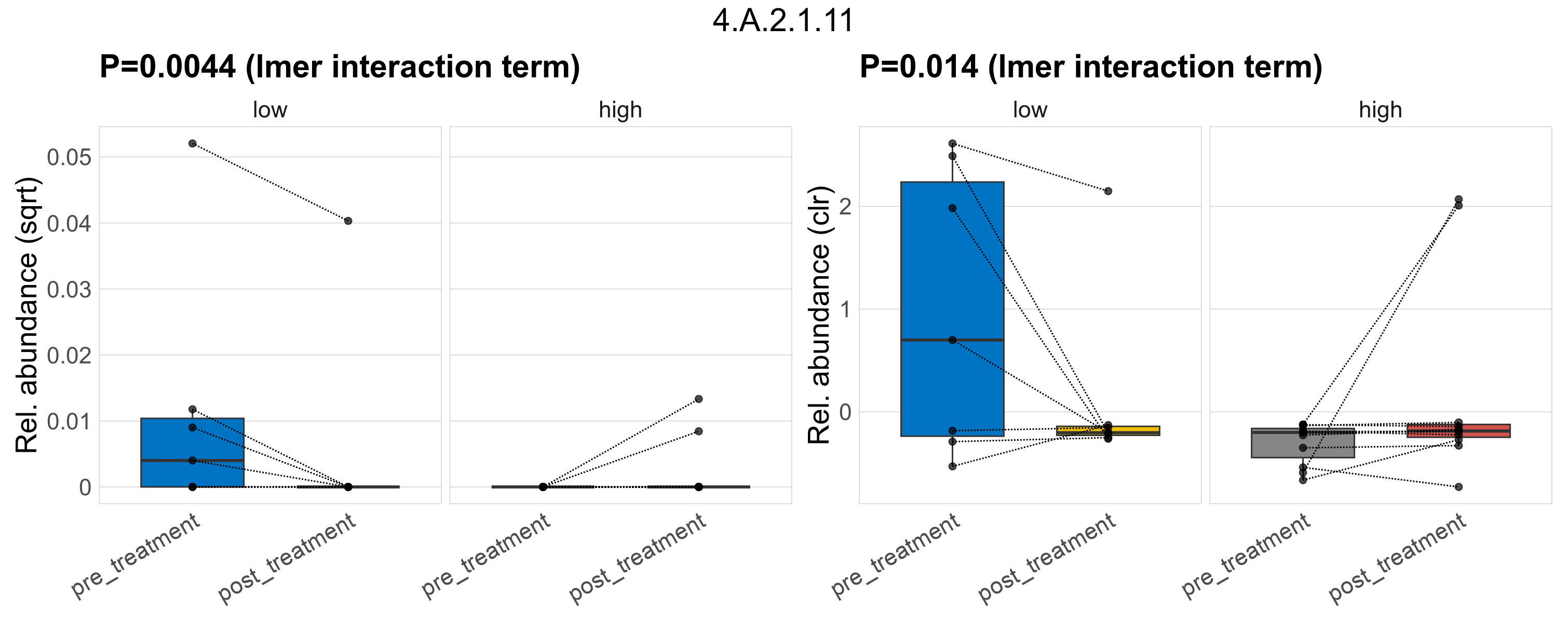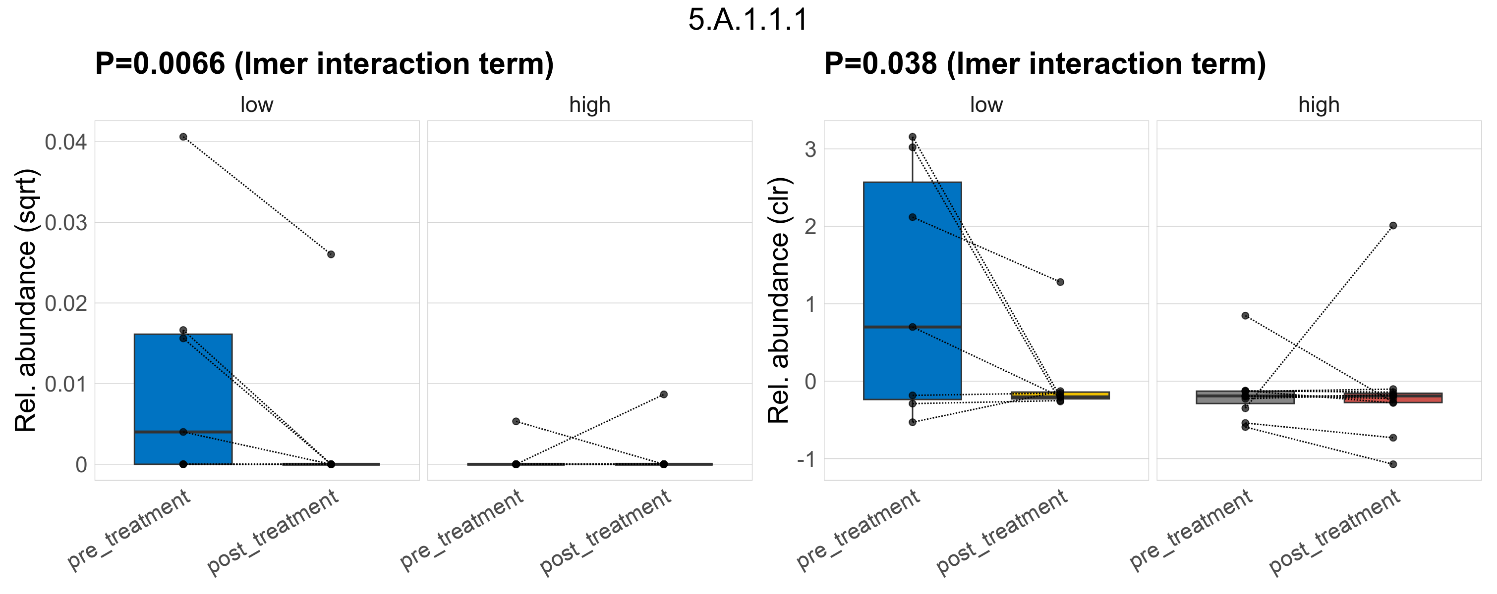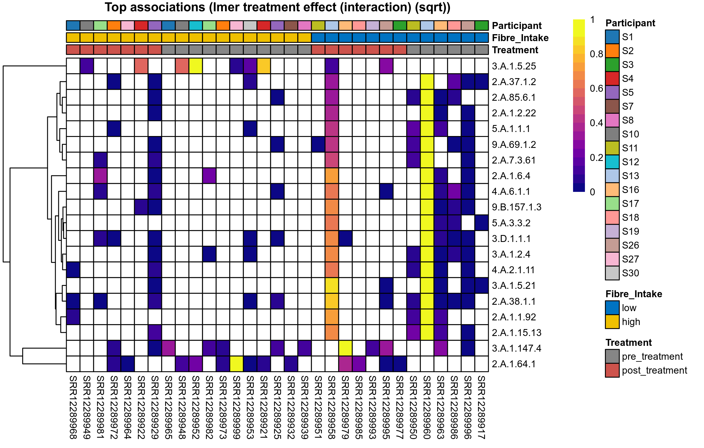 P lmer treatment effect (interaction) (sqrt): Differentially abundant functions were identified by linear mixed effect regression without confounders. Random effects: Participant (intercept). Fixed effects: Fibre_Intake, Treatment, Fibre_Intake vs Treatment. Effect tested: Fibre_Intake vs Treatment.