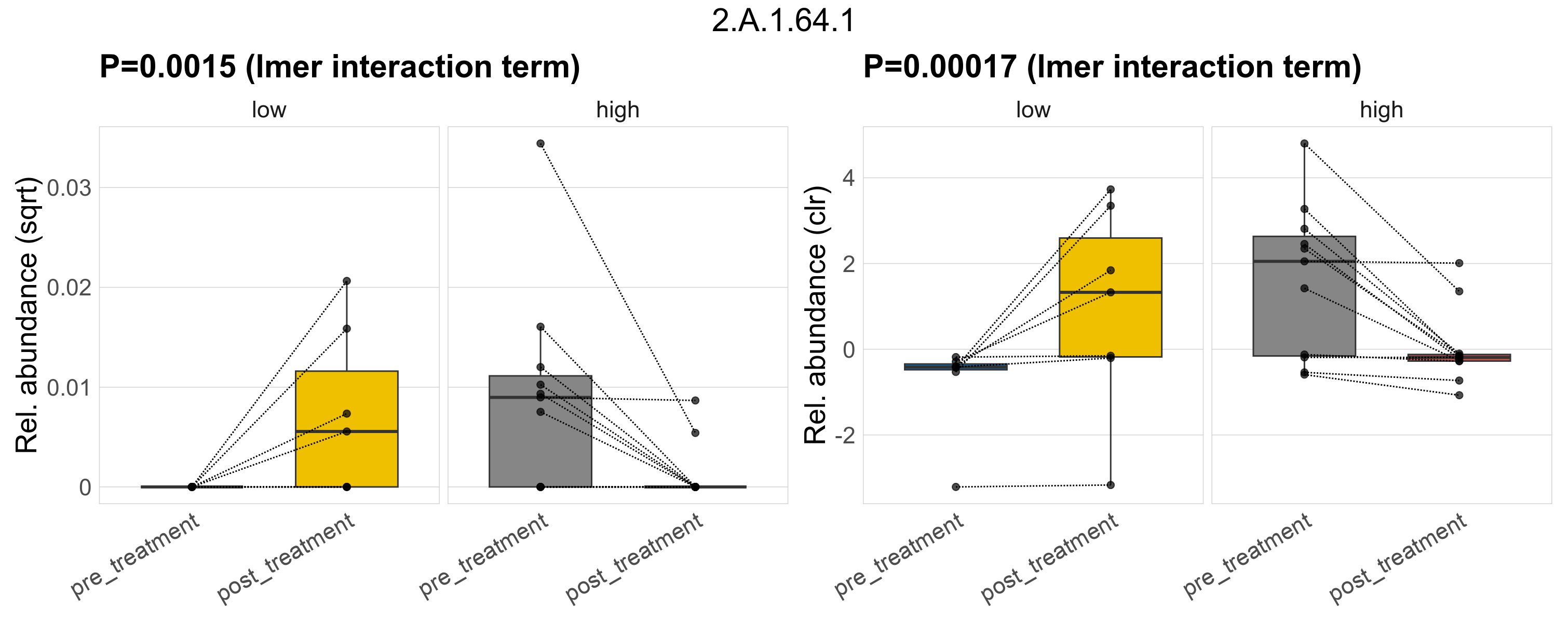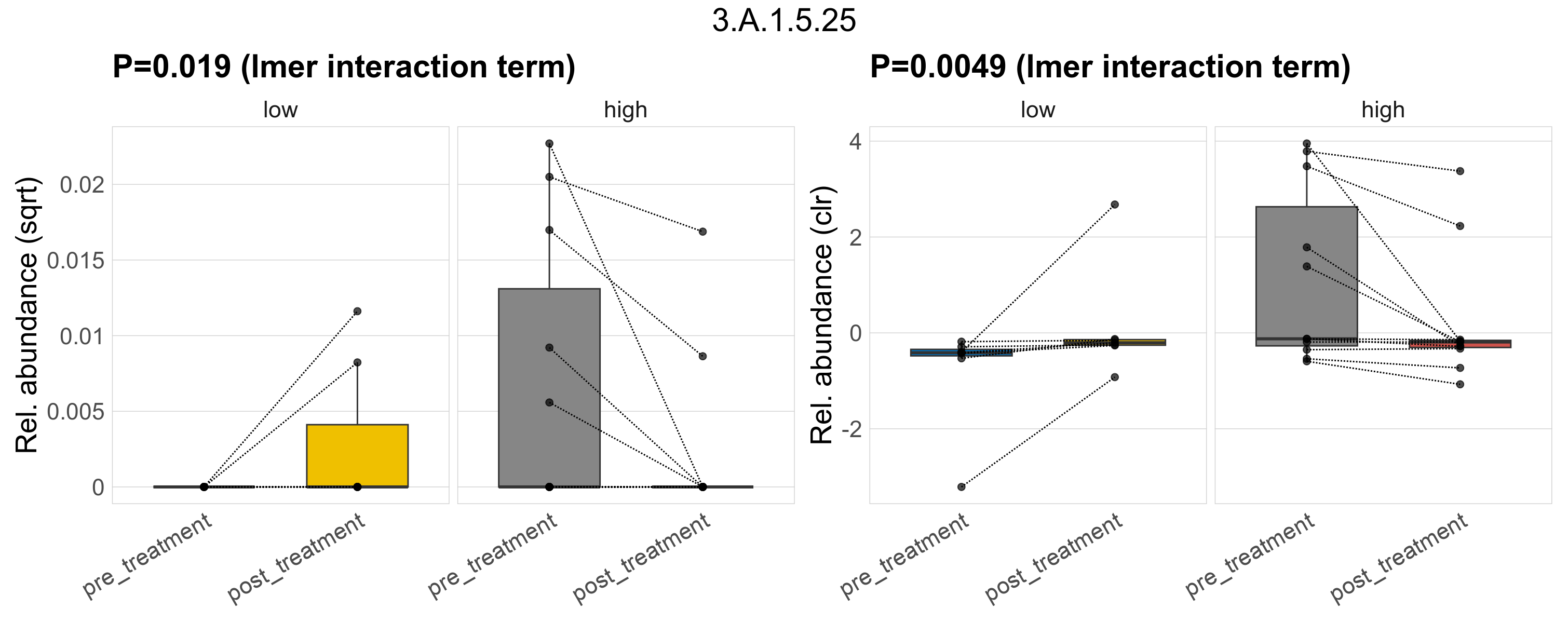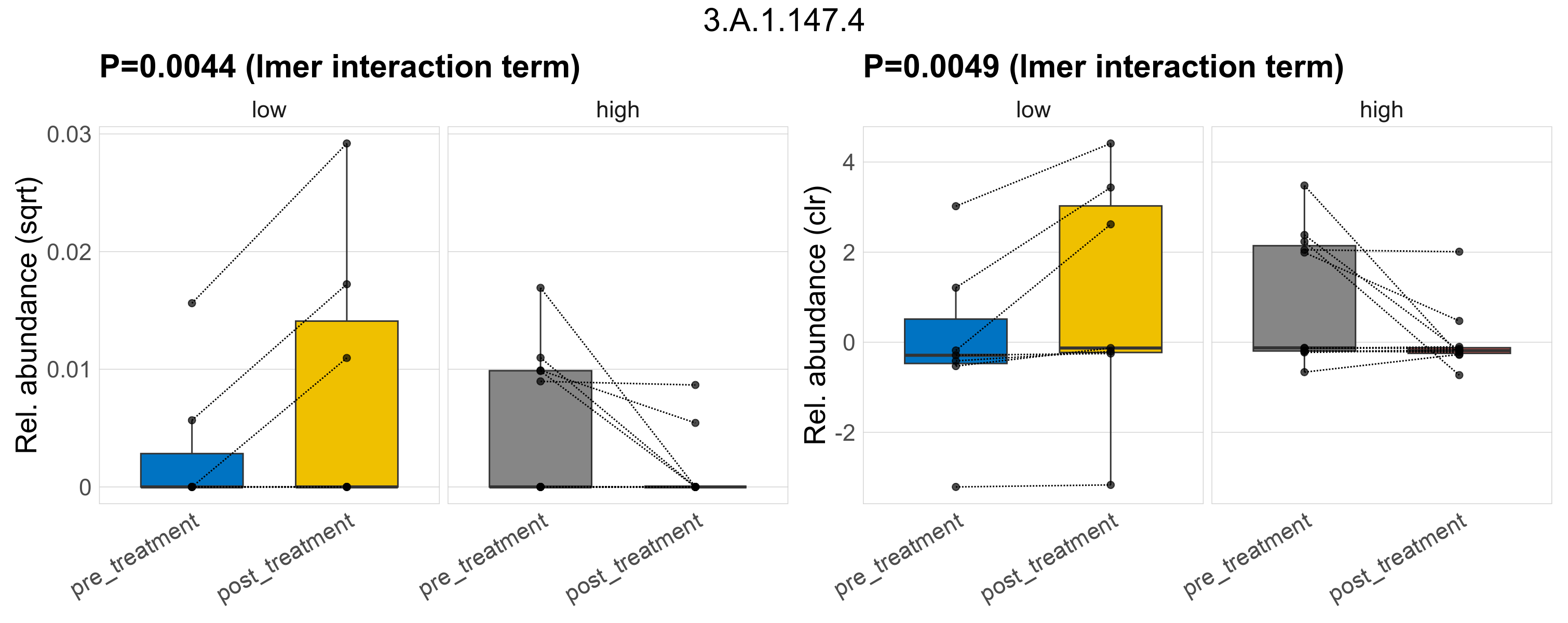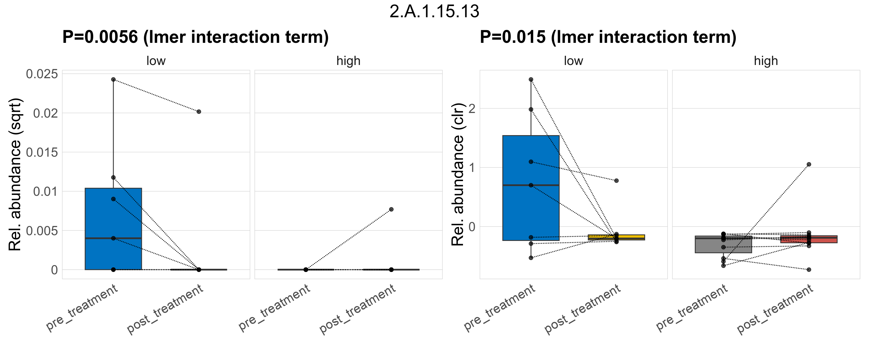 P lmer treatment effect (interaction) (sqrt): Differentially abundant functions were identified by linear mixed effect regression without confounders. Random effects: Participant (intercept). Fixed effects: Fibre_Intake, Treatment, Fibre_Intake vs Treatment. Effect tested: Fibre_Intake vs Treatment.