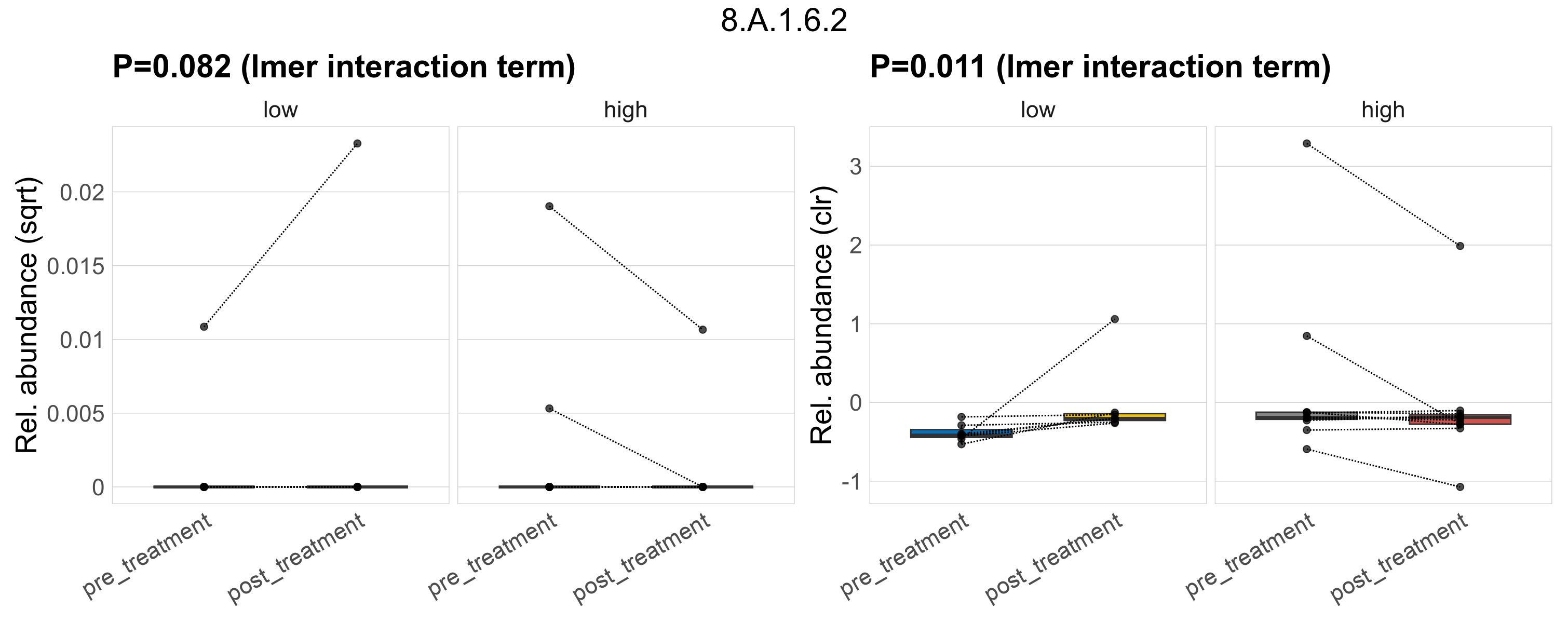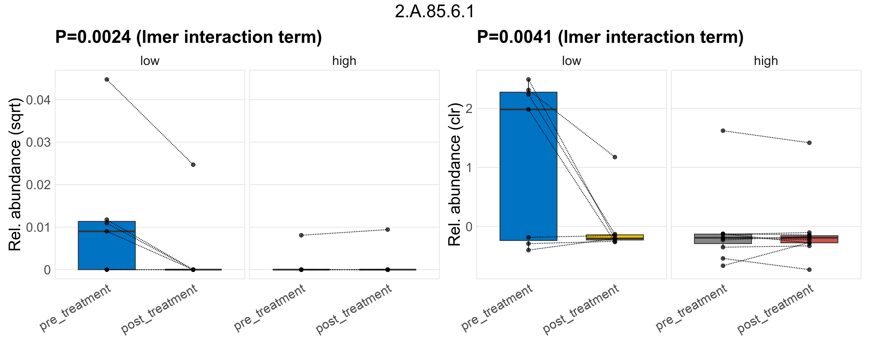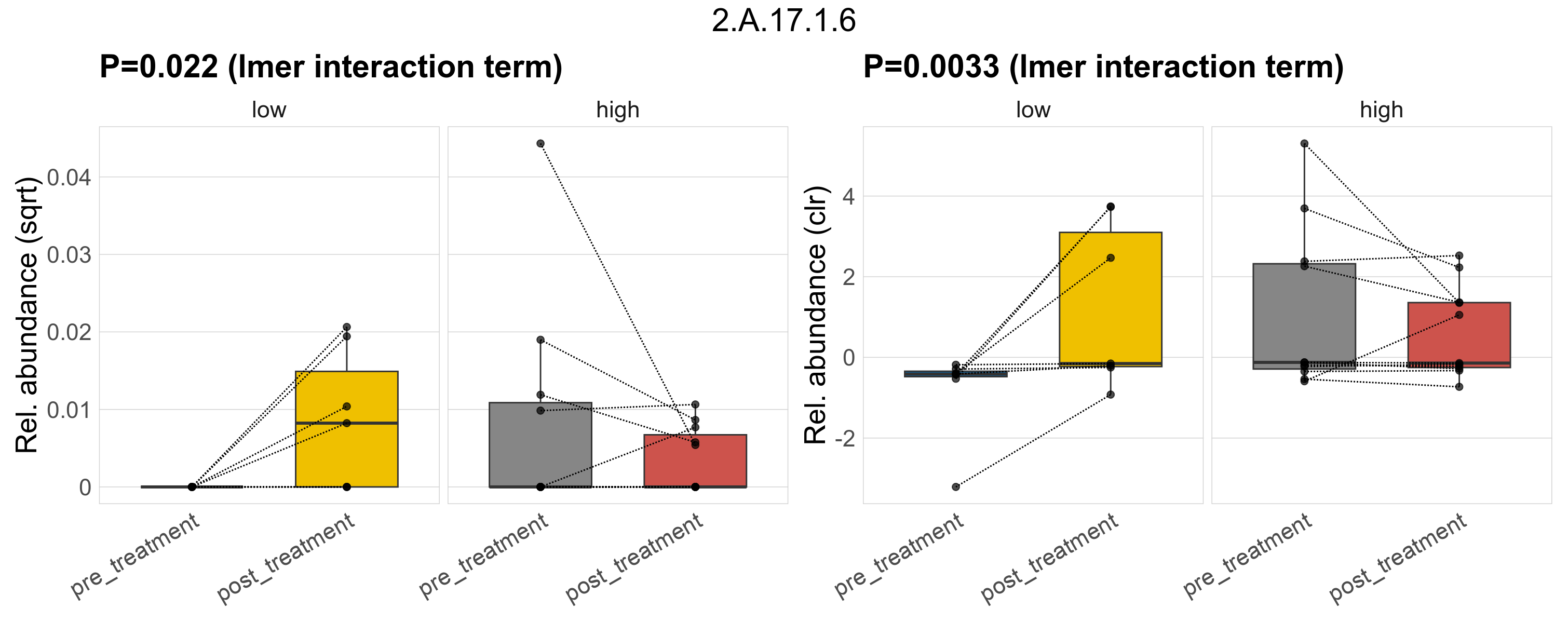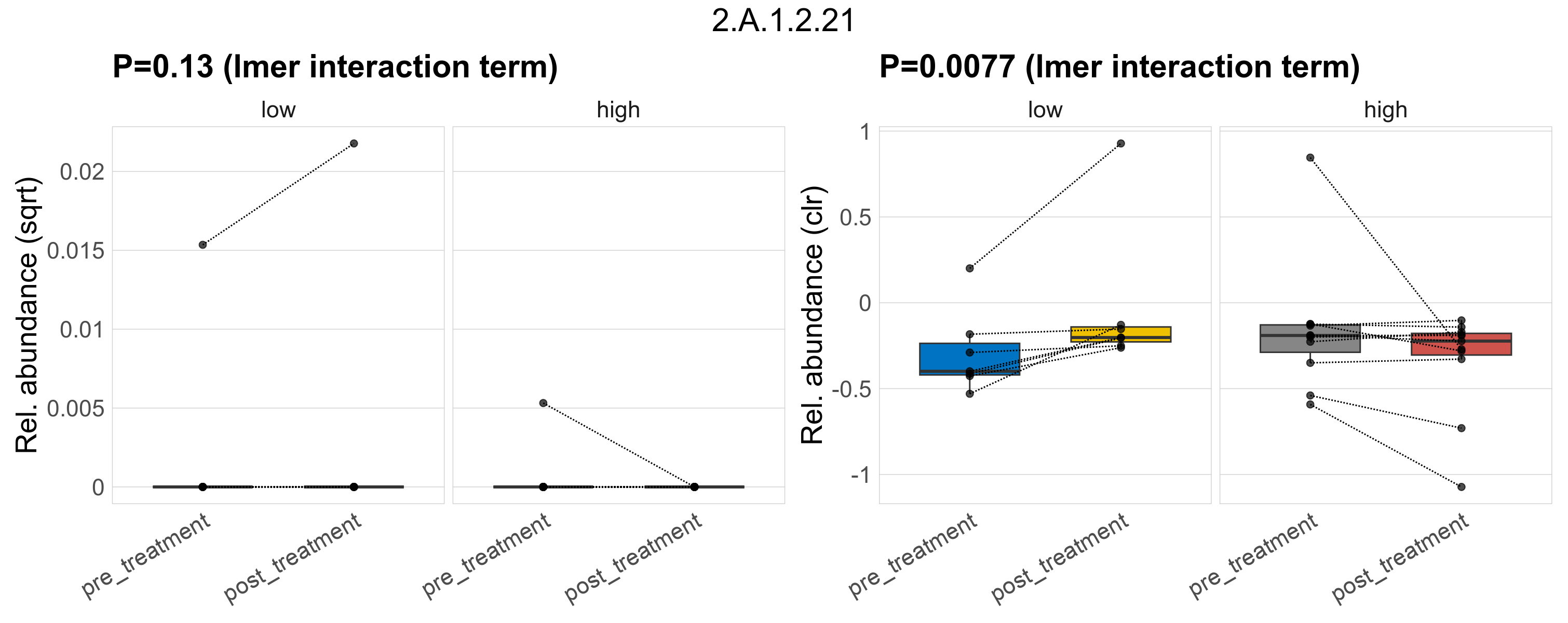 P lmer treatment effect (interaction) (sqrt): Differentially abundant functions were identified by linear mixed effect regression without confounders. Random effects: Participant (intercept). Fixed effects: Fibre_Intake, Treatment, Fibre_Intake vs Treatment. Effect tested: Fibre_Intake vs Treatment.