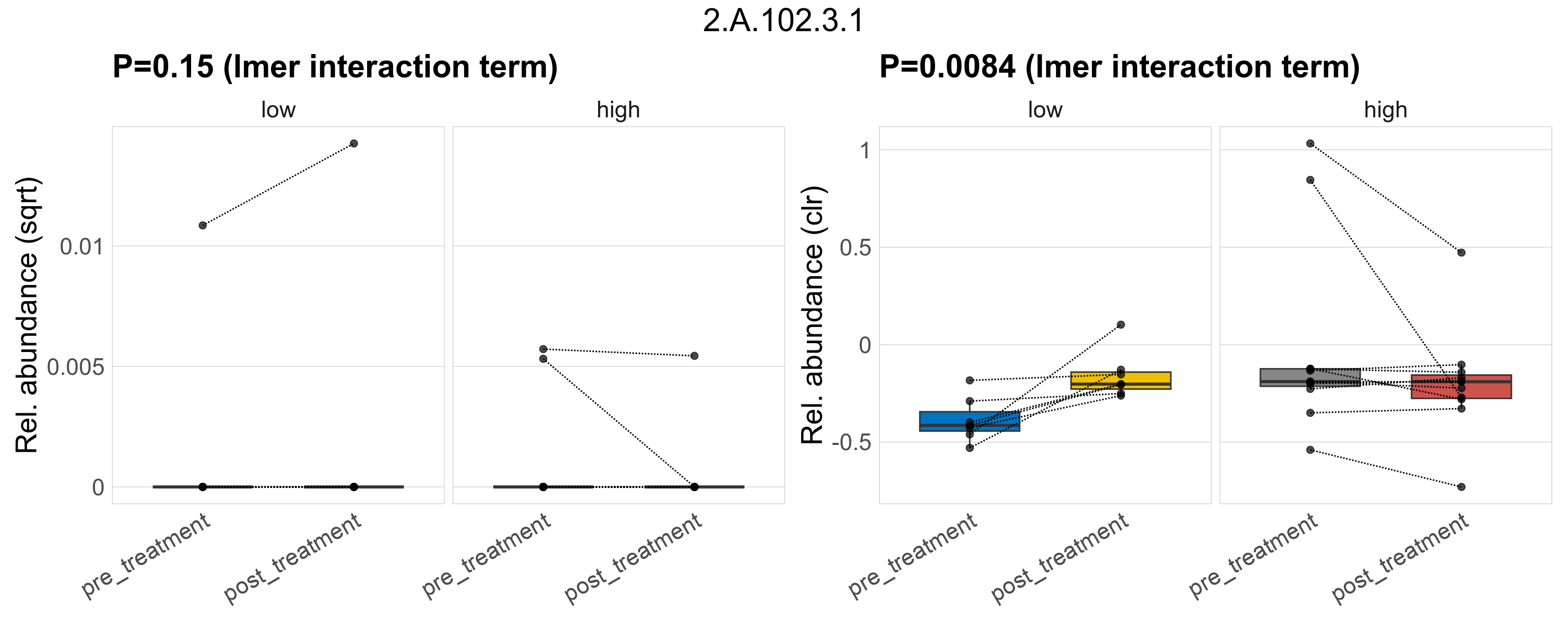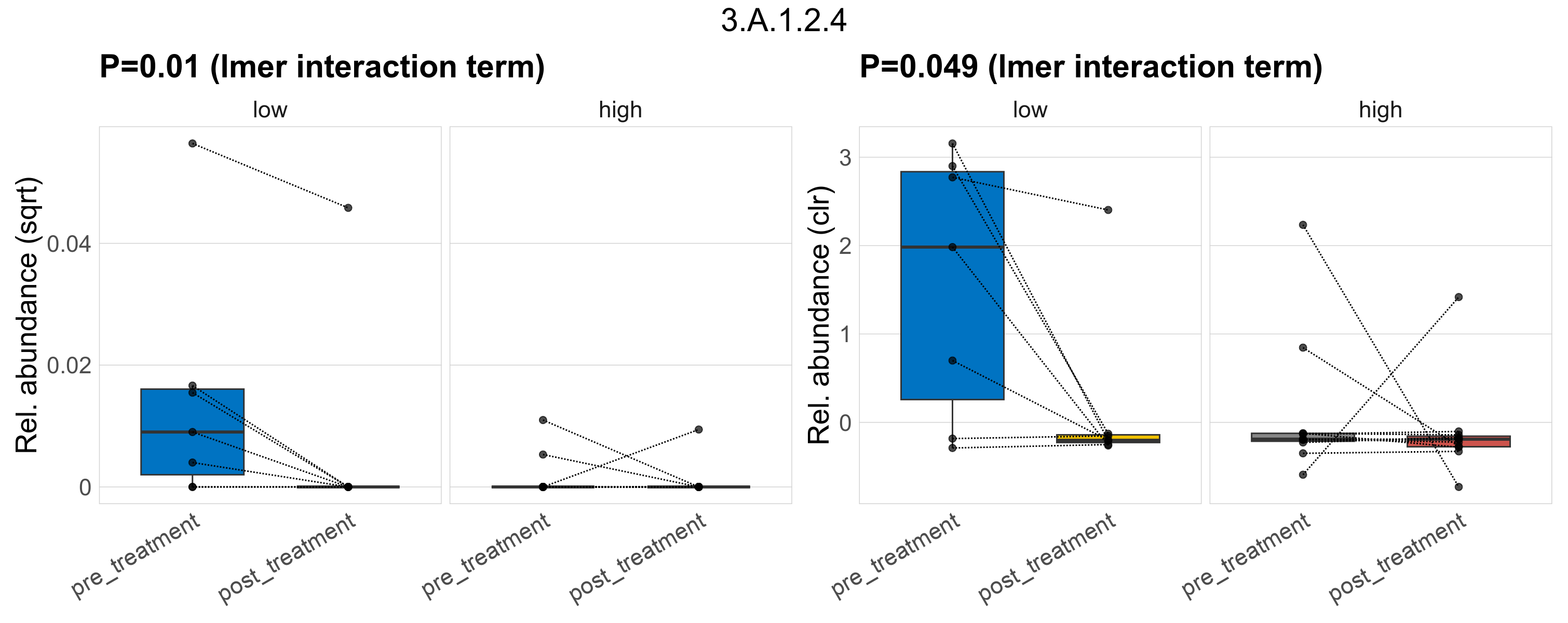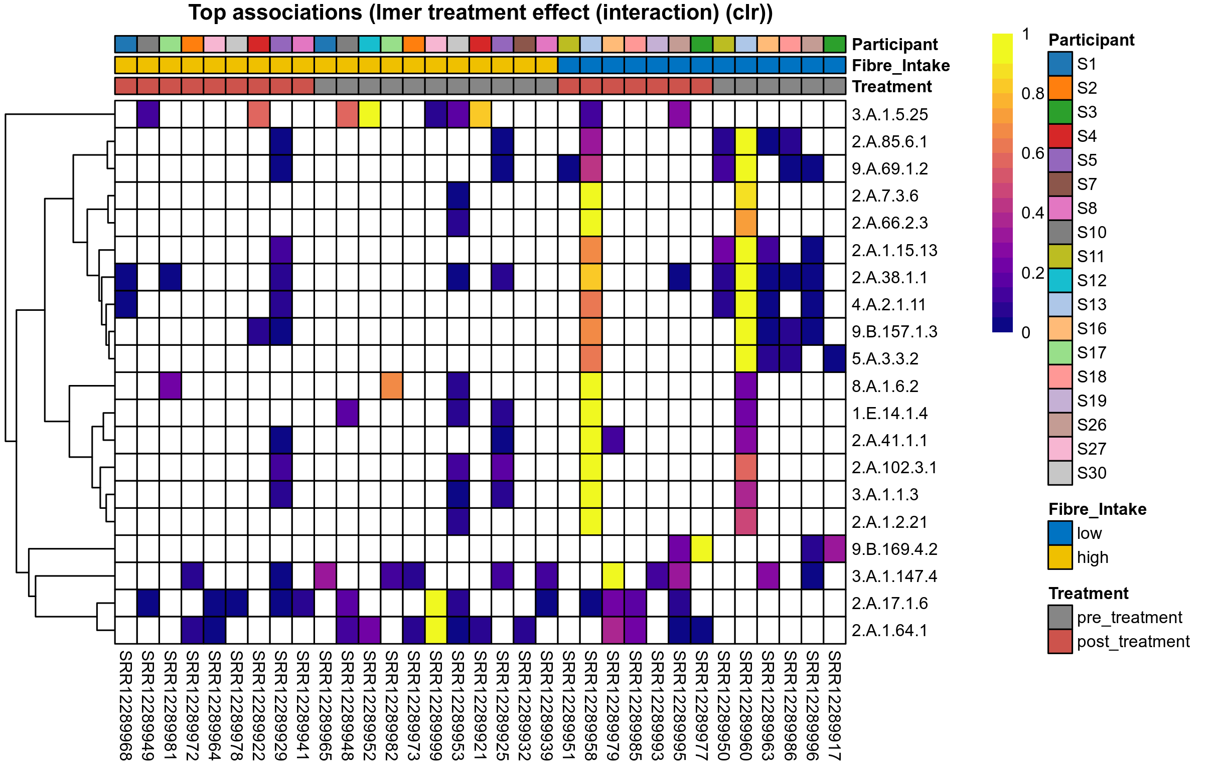 P lmer treatment effect (interaction) (clr): Differentially abundant functions were identified by linear mixed effect regression without confounders. Random effects: Participant (intercept). Fixed effects: Fibre_Intake, Treatment, Fibre_Intake vs Treatment. Effect tested: Fibre_Intake vs Treatment.