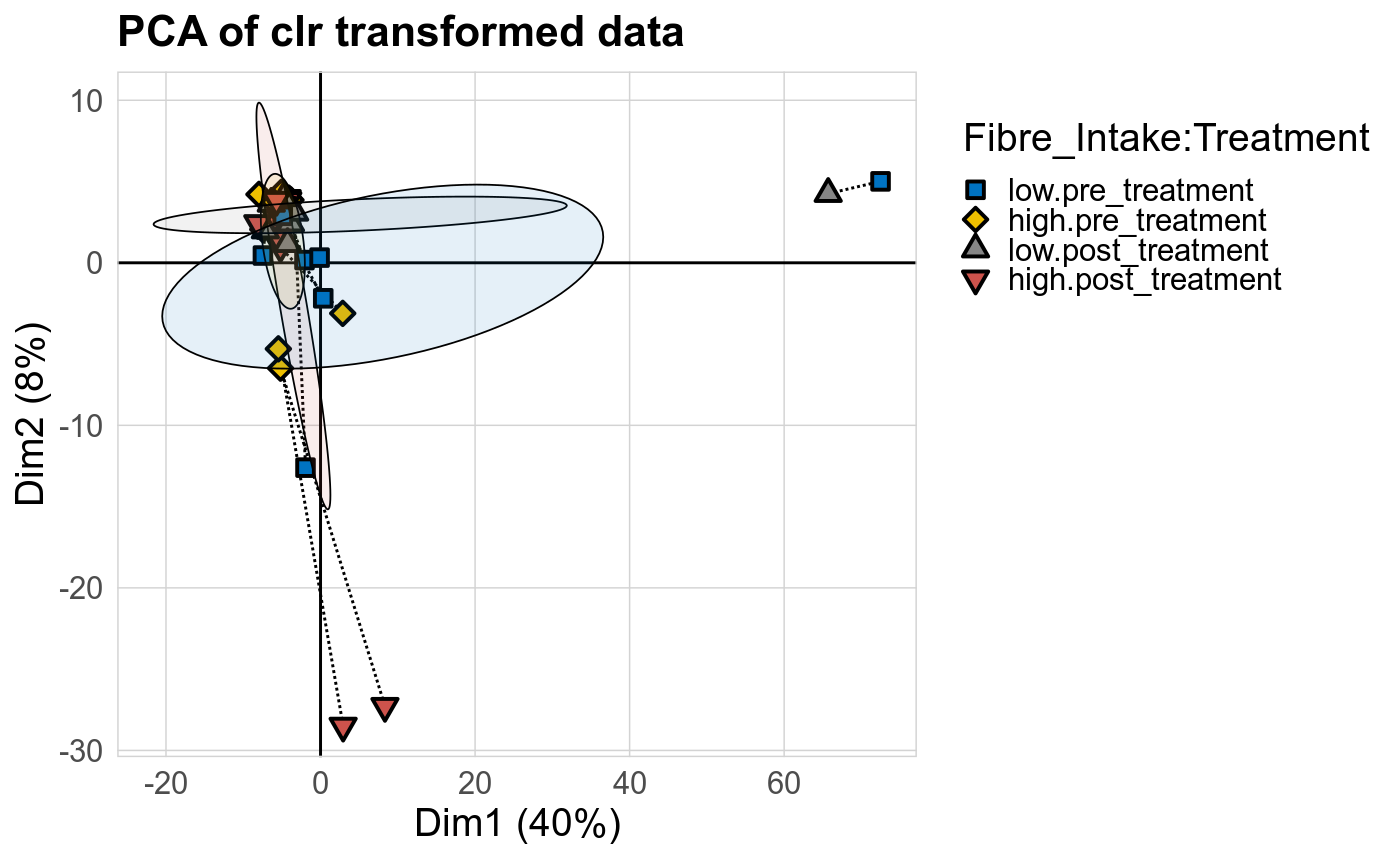 P lmer study group effect (clr): Differentially abundant functions were identified by linear mixed effect regression without confounders. Random effects: Participant (intercept). Fixed effects: Fibre_Intake, Treatment, Fibre_Intake vs Treatment. Effect tested: Fibre_Intake.