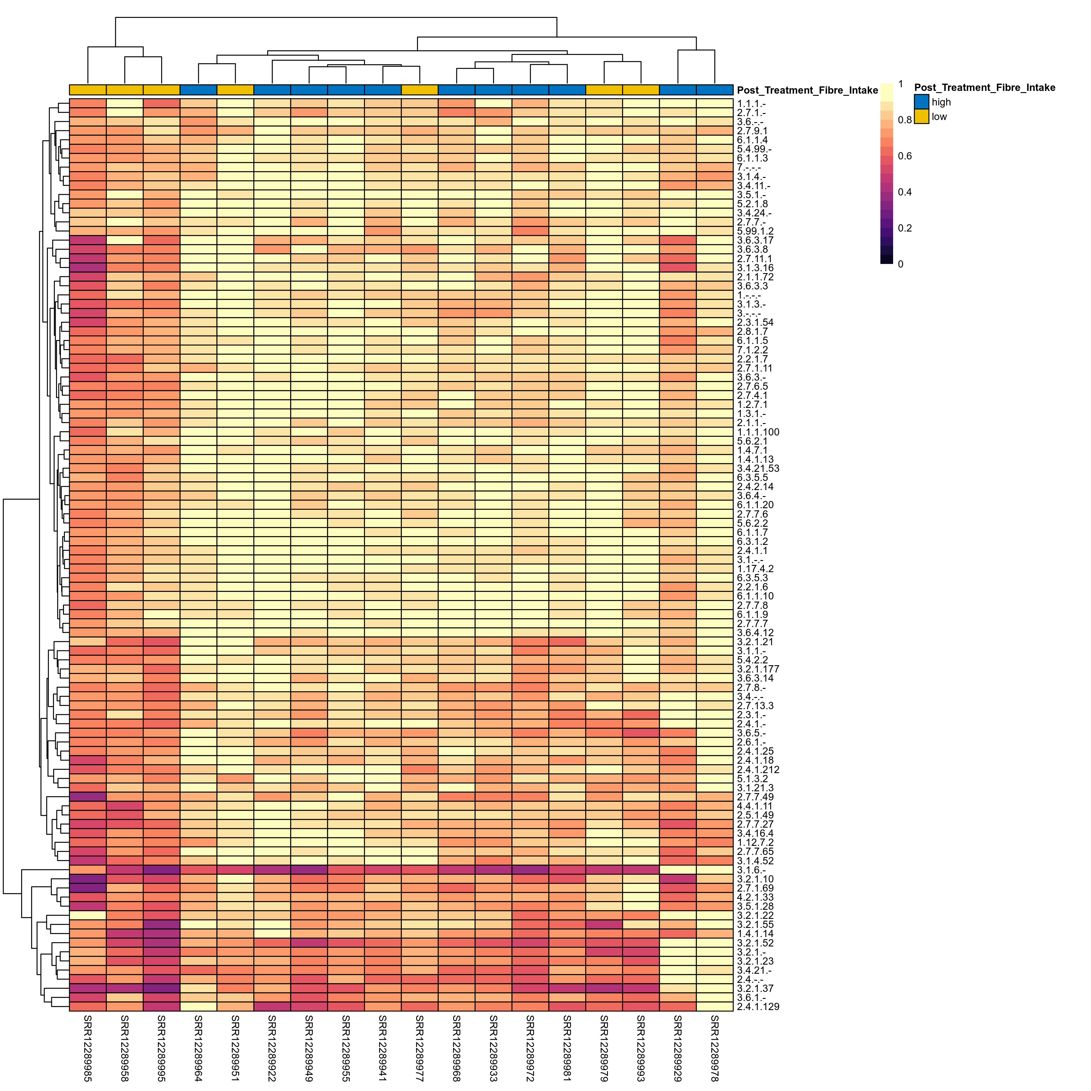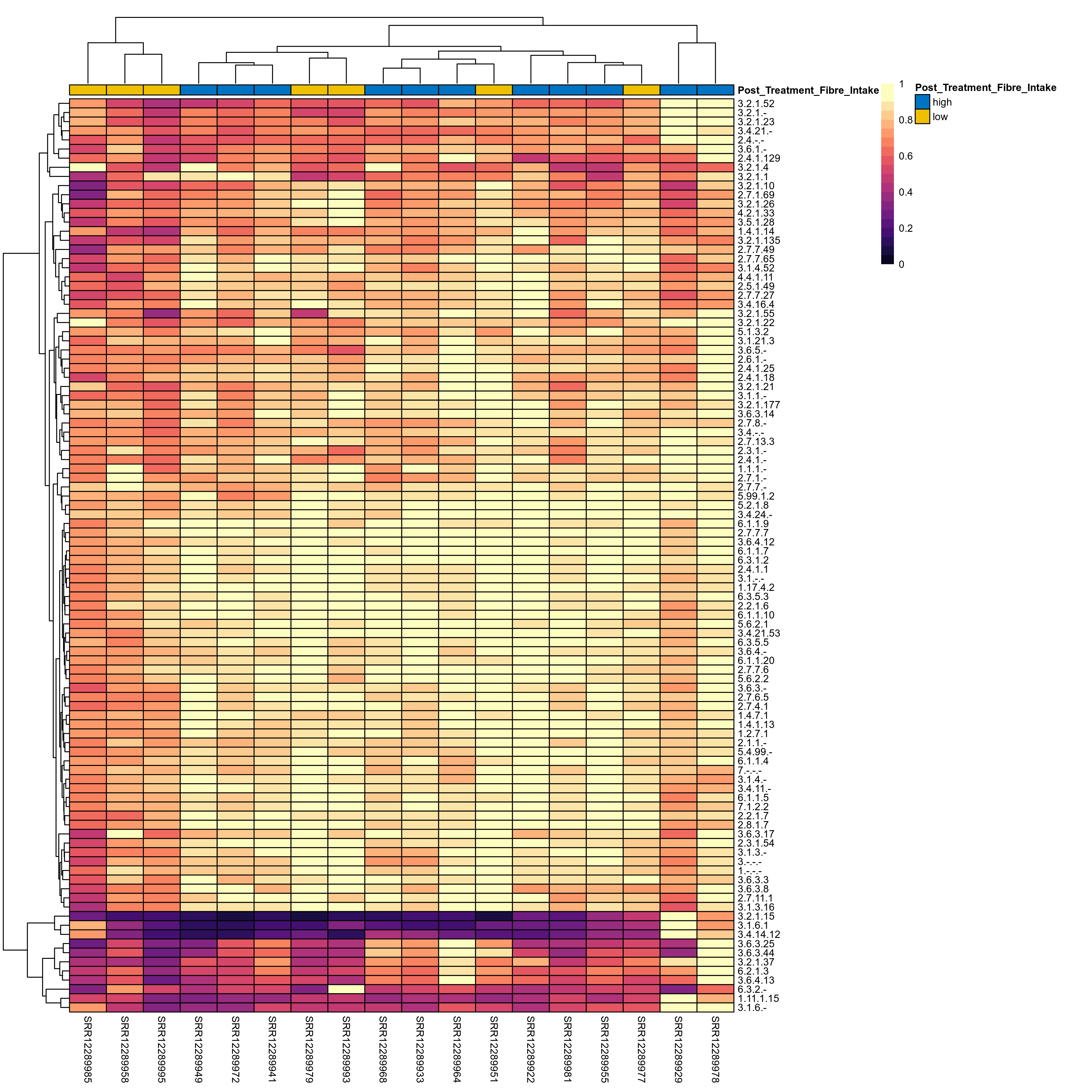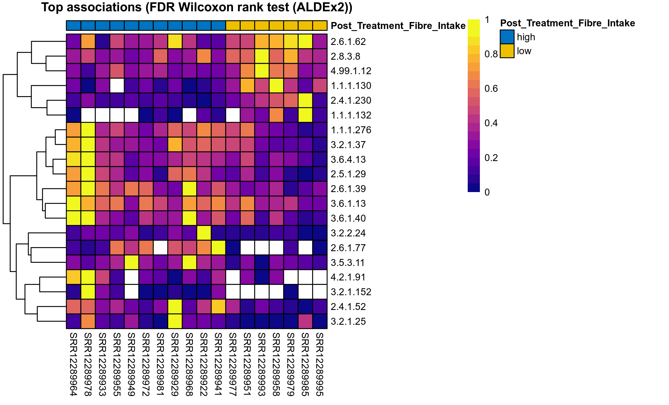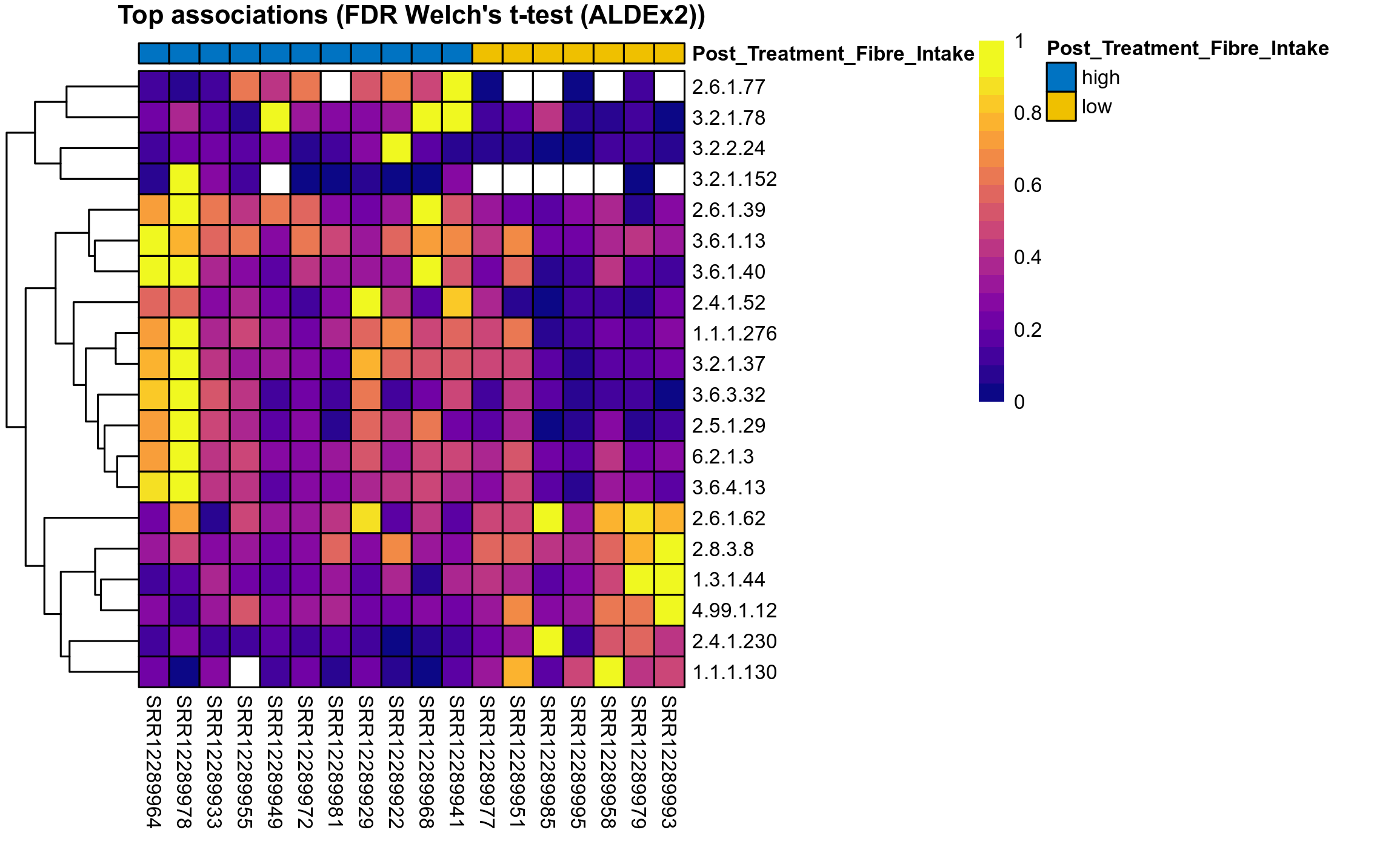 | Function | Annotation | P Welch's t-test (sqrt) | FDR Welch's t-test (sqrt) | Pbonf Welch's t-test (sqrt) | Cohen's d Welch's t-test (sqrt) | P Welch's t-test (clr) | FDR Welch's t-test (clr) | Pbonf Welch's t-test (clr) | Cohen's d Welch's t-test (clr) | P Fisher's exact test | FDR Fisher's exact test | Pbonf Fisher's exact test | P Welch's t-test (ALDEx2) | FDR Welch's t-test (ALDEx2) | P Wilcoxon rank test (ALDEx2) | FDR Wilcoxon rank test (ALDEx2) | Mean Pos | Mean Abundance | Median Abundance | Mean Post_Treatment_Fibre_Intakehigh | Median Post_Treatment_Fibre_Intakehigh | SD Post_Treatment_Fibre_Intakehigh | Mean Post_Treatment_Fibre_Intakelow | Median Post_Treatment_Fibre_Intakelow | SD Post_Treatment_Fibre_Intakelow | Fold Change Log2(Post_Treatment_Fibre_Intakelow/Post_Treatment_Fibre_Intakehigh) | Positive samples | Positive Post_Treatment_Fibre_Intakehigh | Positive Post_Treatment_Fibre_Intakelow | Positive_Post_Treatment_Fibre_Intakehigh_percent | Positive_Post_Treatment_Fibre_Intakelow_percent |