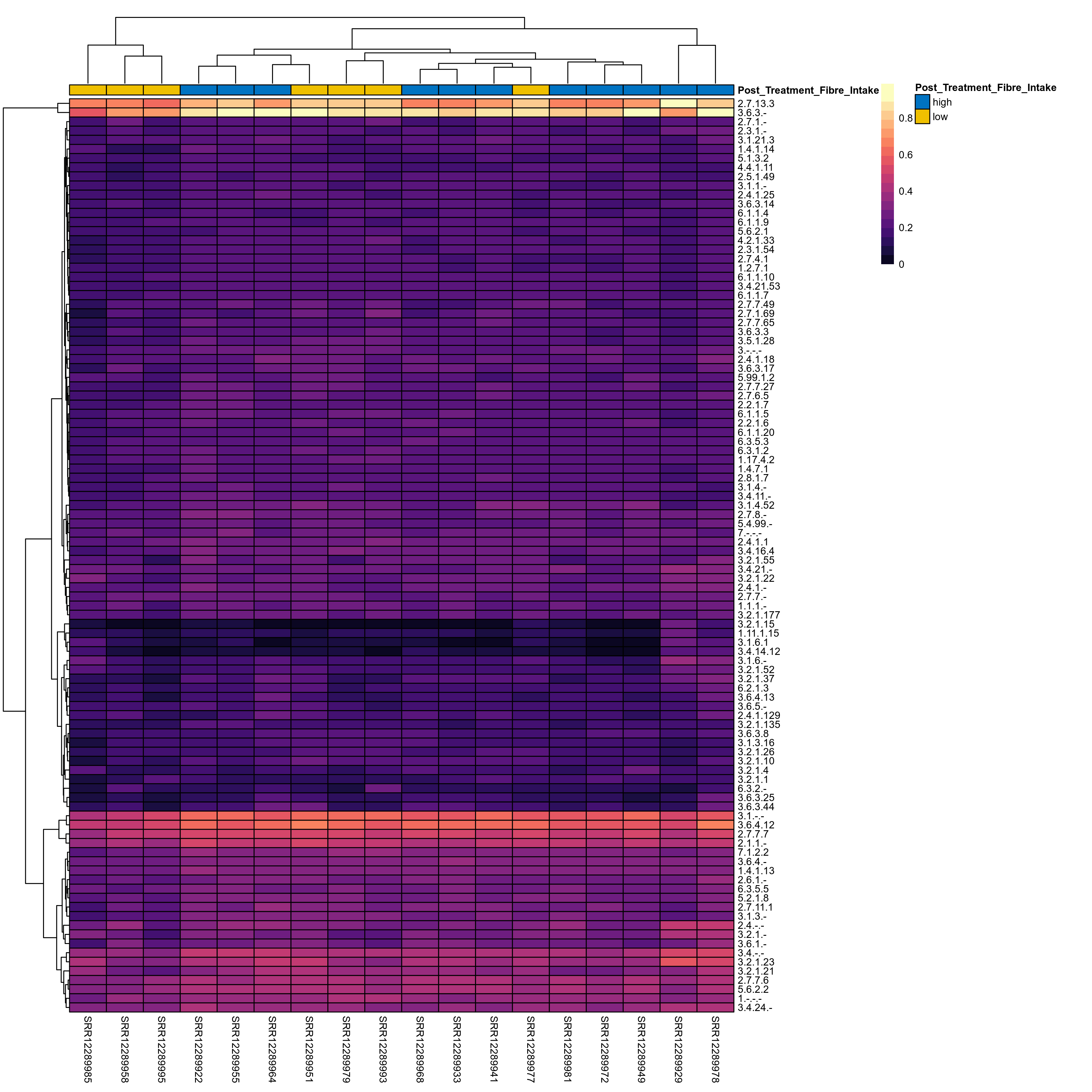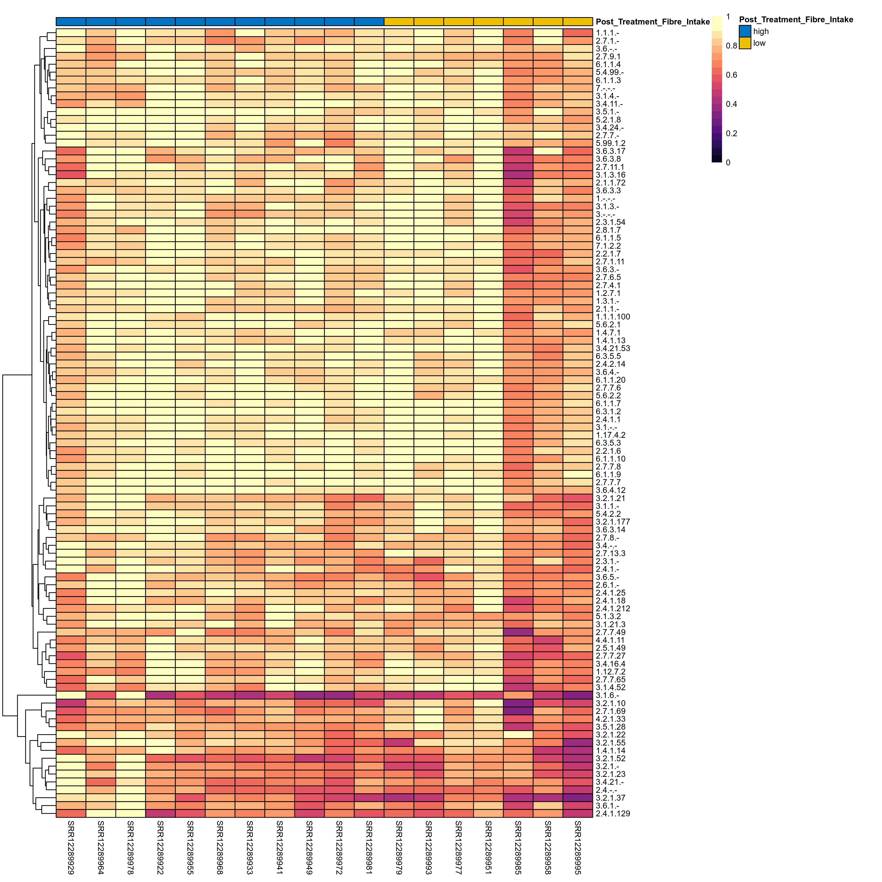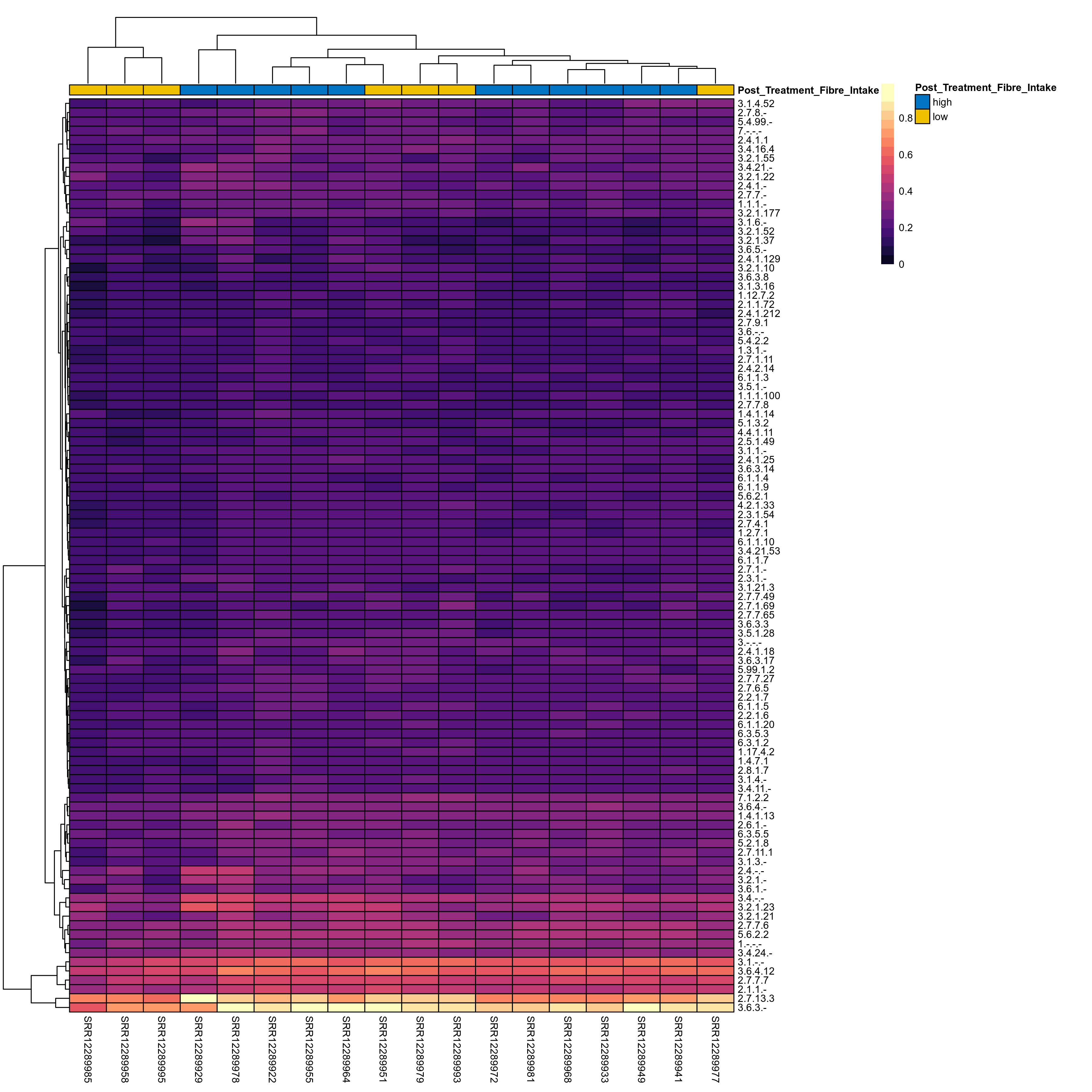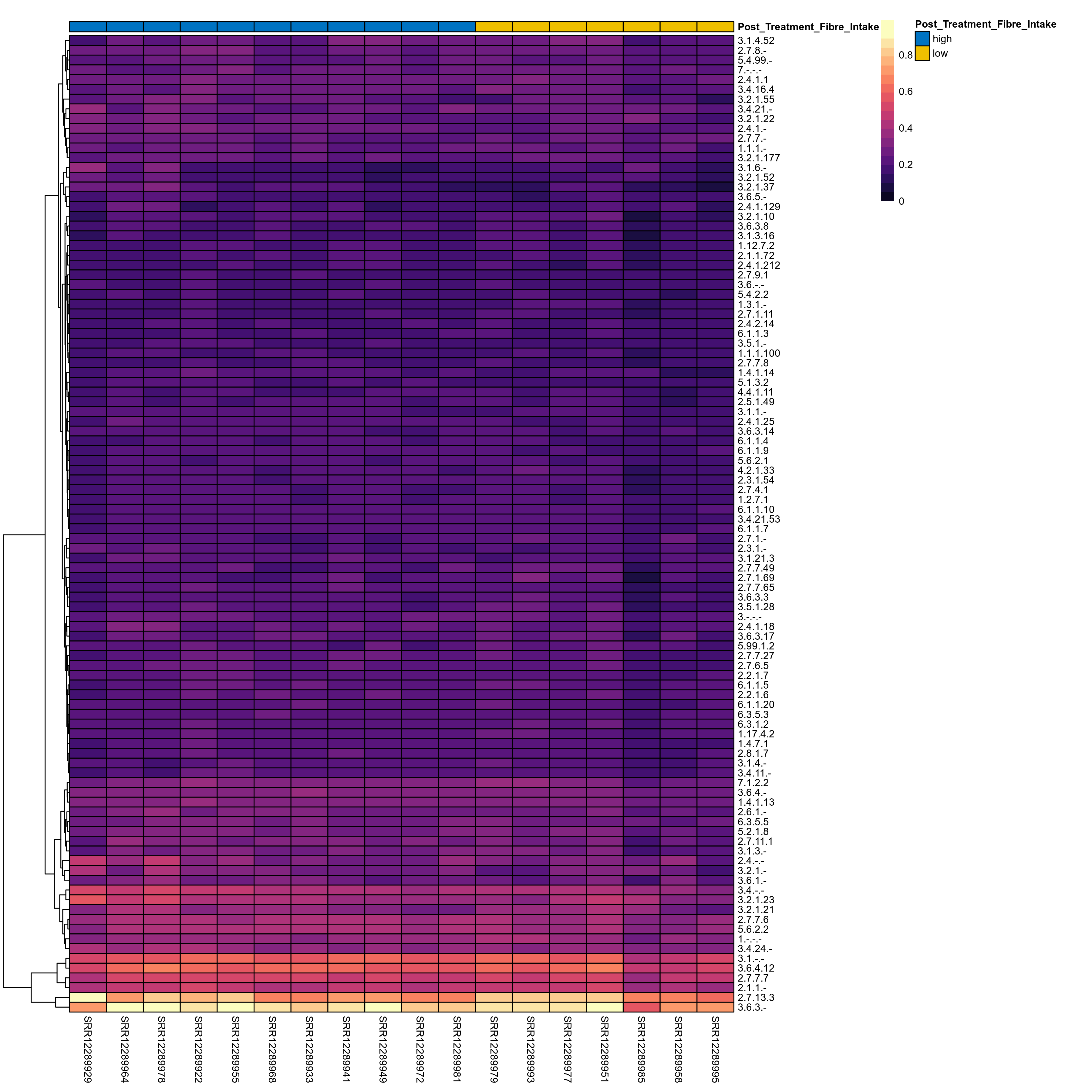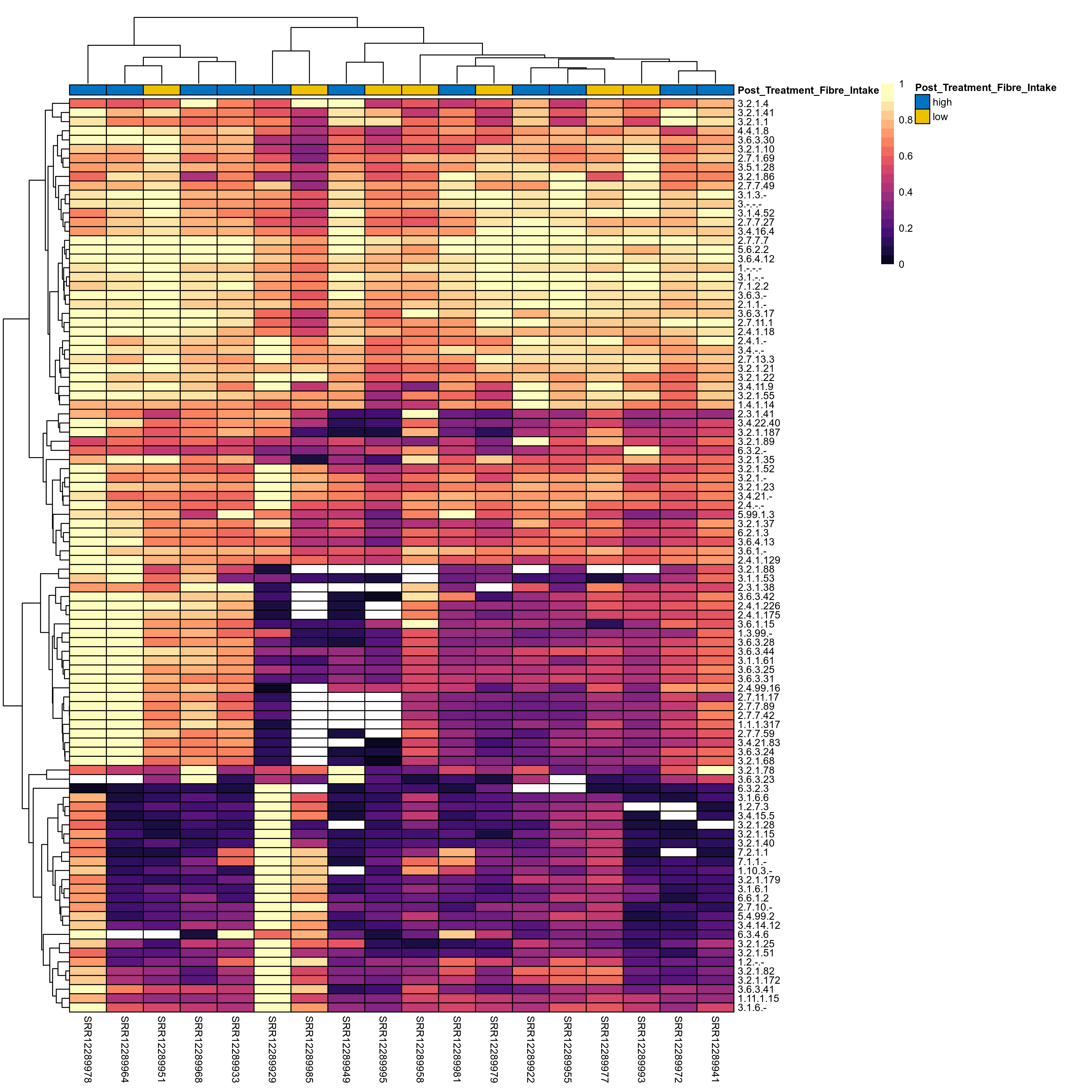 | Function | Annotation | P Welch's t-test (sqrt) | FDR Welch's t-test (sqrt) | Pbonf Welch's t-test (sqrt) | Cohen's d Welch's t-test (sqrt) | P Welch's t-test (clr) | FDR Welch's t-test (clr) | Pbonf Welch's t-test (clr) | Cohen's d Welch's t-test (clr) | P Fisher's exact test | FDR Fisher's exact test | Pbonf Fisher's exact test | P Welch's t-test (ALDEx2) | FDR Welch's t-test (ALDEx2) | P Wilcoxon rank test (ALDEx2) | FDR Wilcoxon rank test (ALDEx2) | Mean Pos | Mean Abundance | Median Abundance | Mean Post_Treatment_Fibre_Intakehigh | Median Post_Treatment_Fibre_Intakehigh | SD Post_Treatment_Fibre_Intakehigh | Mean Post_Treatment_Fibre_Intakelow | Median Post_Treatment_Fibre_Intakelow | SD Post_Treatment_Fibre_Intakelow | Fold Change Log2(Post_Treatment_Fibre_Intakelow/Post_Treatment_Fibre_Intakehigh) | Positive samples | Positive Post_Treatment_Fibre_Intakehigh | Positive Post_Treatment_Fibre_Intakelow | Positive_Post_Treatment_Fibre_Intakehigh_percent | Positive_Post_Treatment_Fibre_Intakelow_percent |