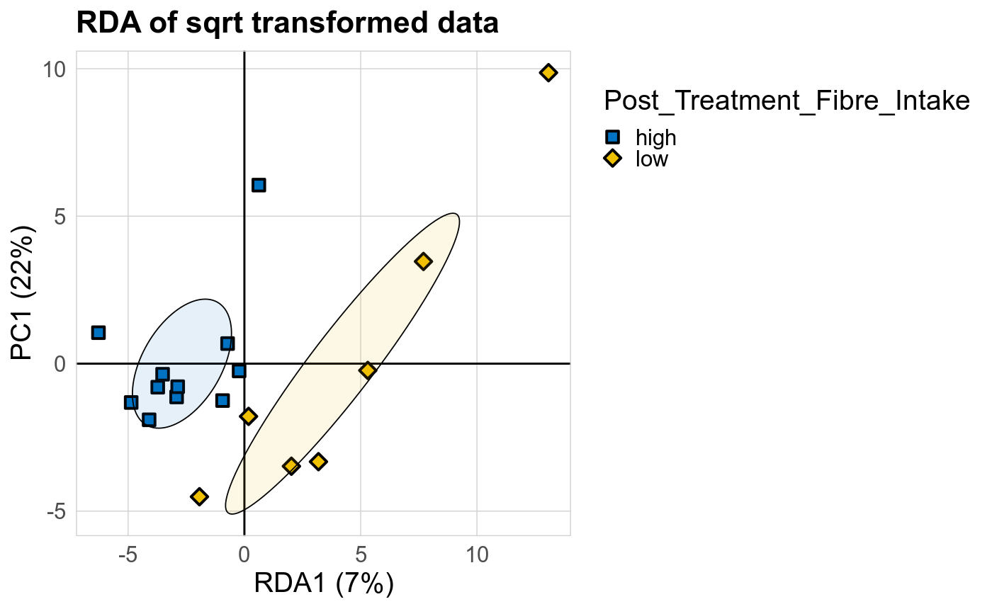 Microbial functions were analyzed using supervised and unsupervised multivariate techniques. Functional profiles were ordinated using the unsupervised methods Principal Coordinates Analysis (PCoA), Non-Metric Multidimensional Scaling (NMDS) and Principal Component Analysis (PCA). The supervised methods Adonis and Redundancy analysis (RDA) were used to assess if variance in the functional profiles was significantly associated with the study condition. A guide explaining these methods can be found here. Sparse Partial Least Square Discriminant Analysis (sPLS-DA) from the MixMc package was additionaly used to extract features associated with the condition of interest.