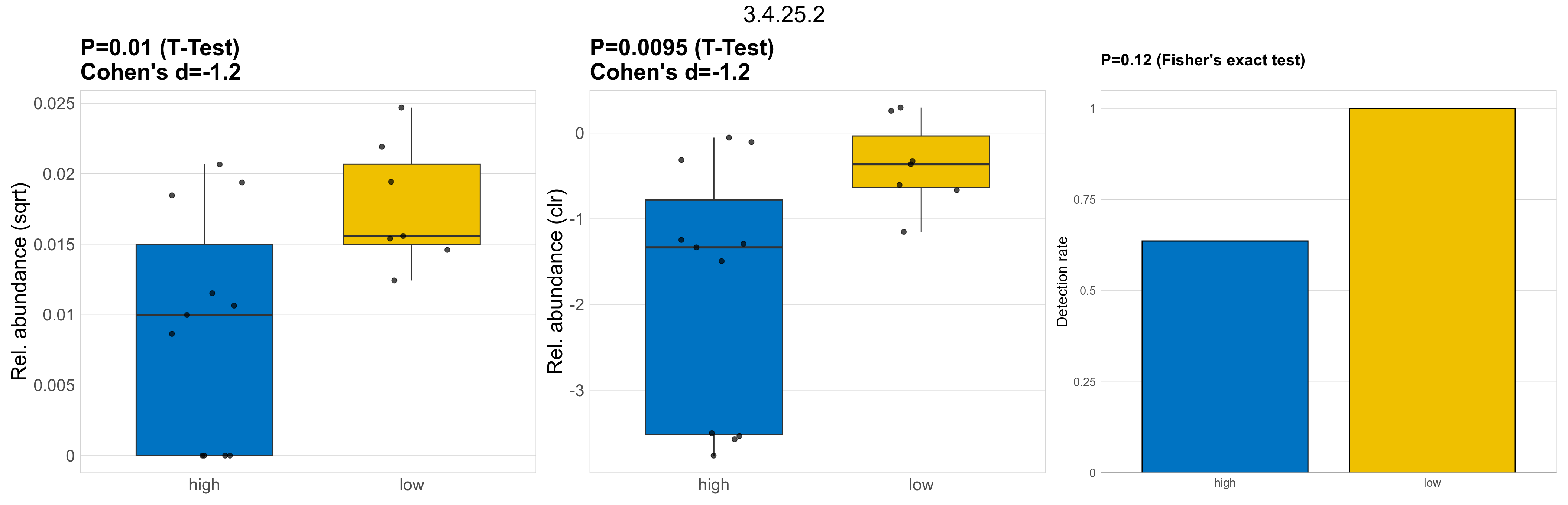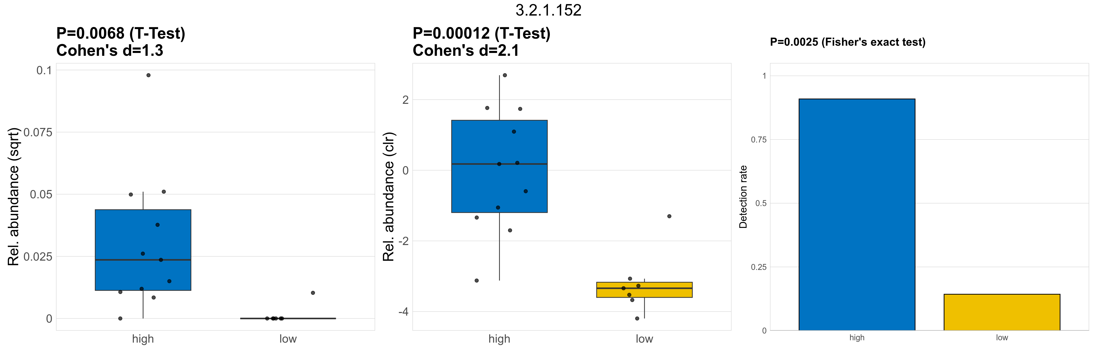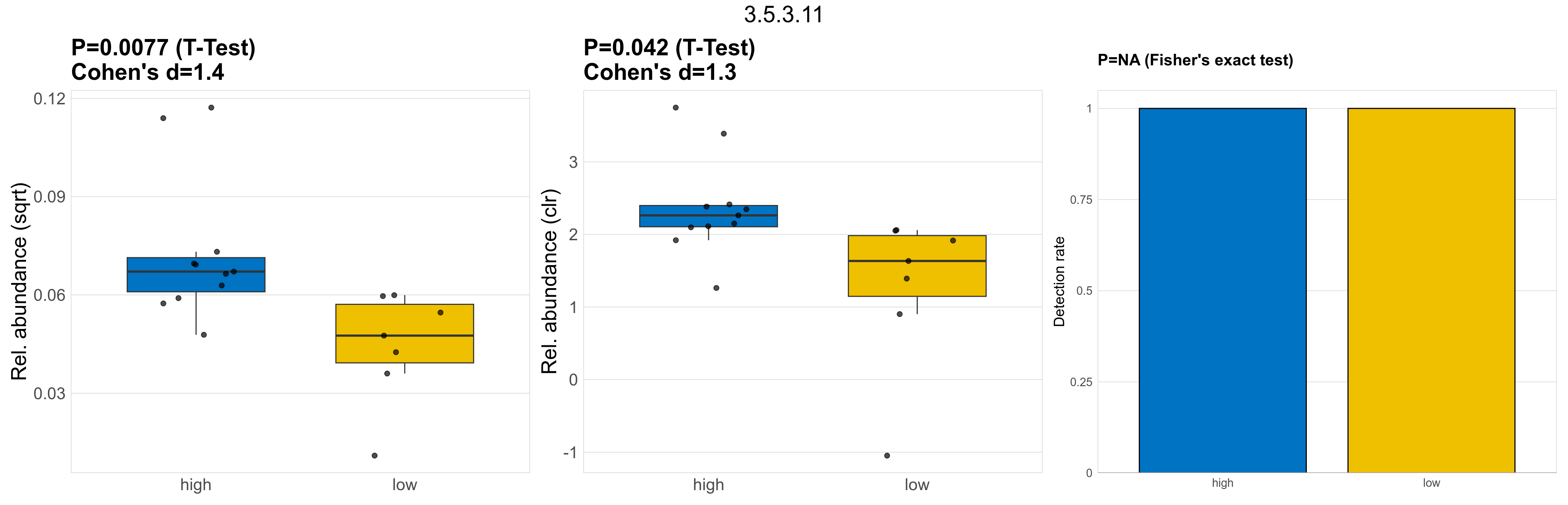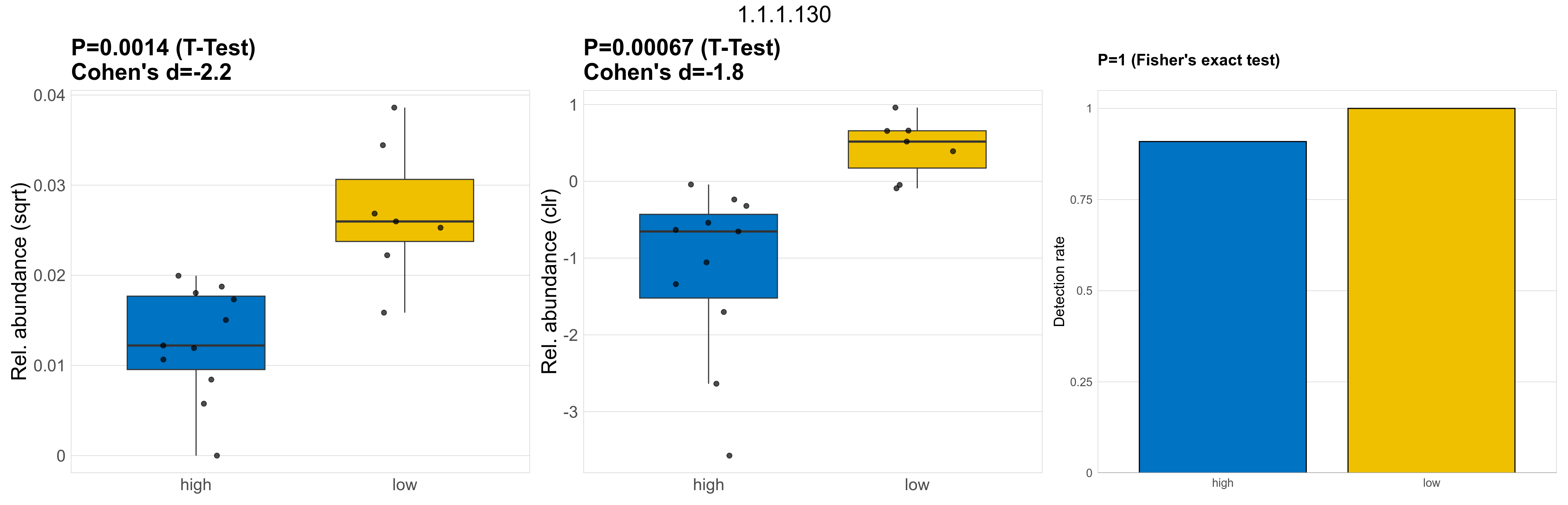 Differentially abundant microbial functions were identified using the univariate methods ANOVA or LMER (linear mixed effect regression) on clr transformed relative abundance data, Fisher's exact test, and Aldex2 (ANOVA-like Differential Expression). Aldex2 was run on read count data. Fisher's exact test was used to test for diffrerences in the presence and absence (detection rate) of microbial functions across study groups.