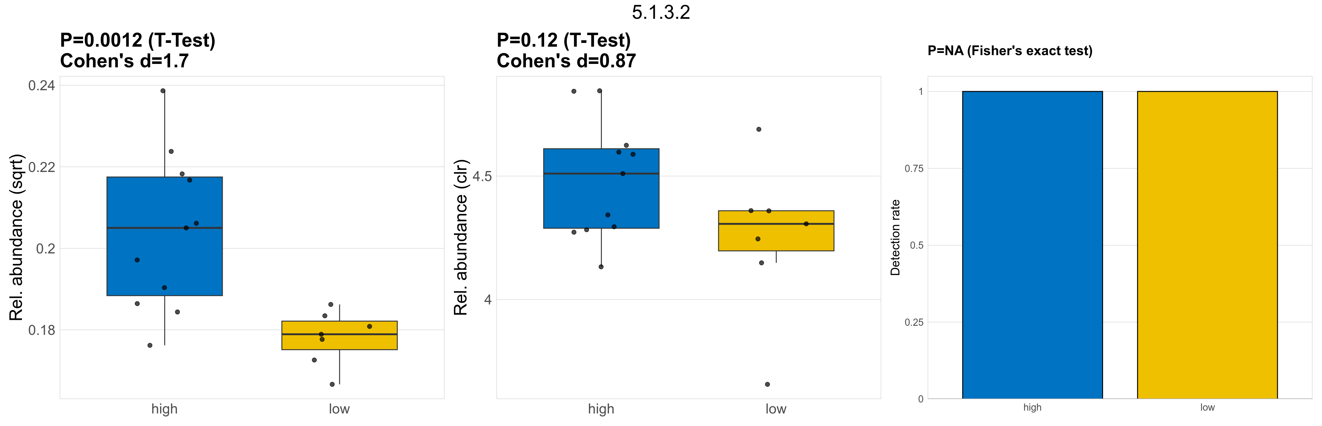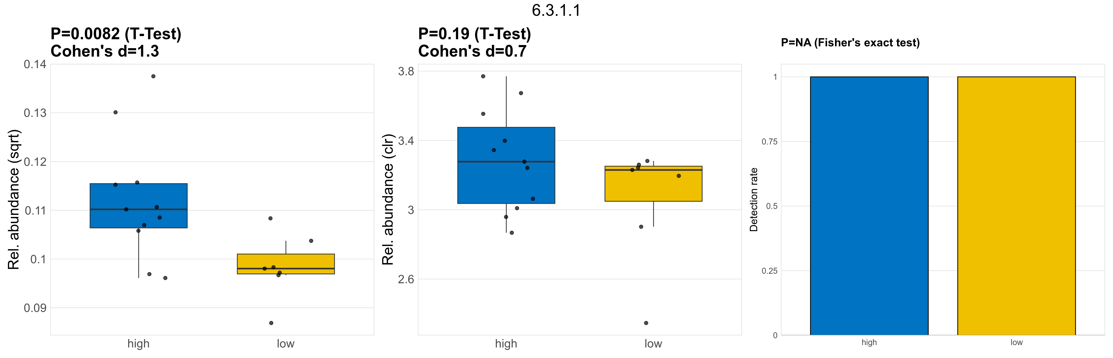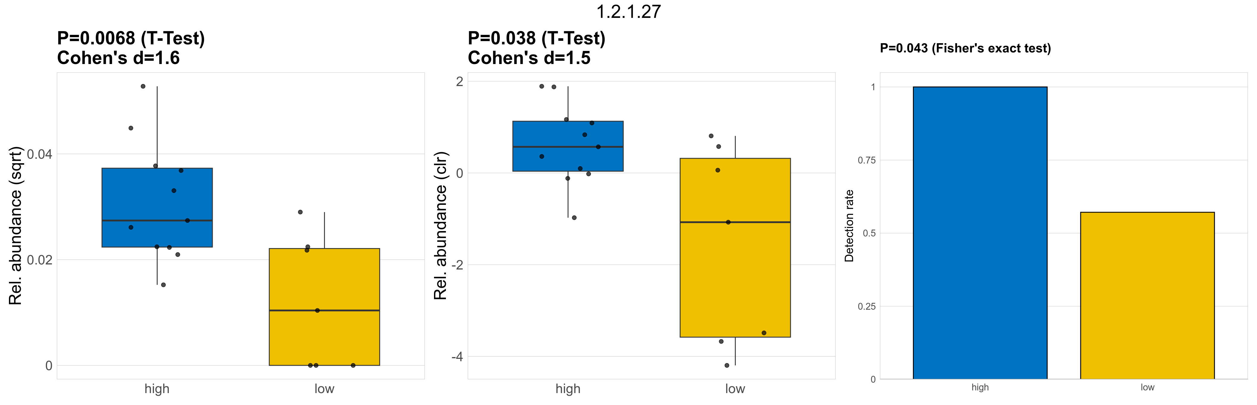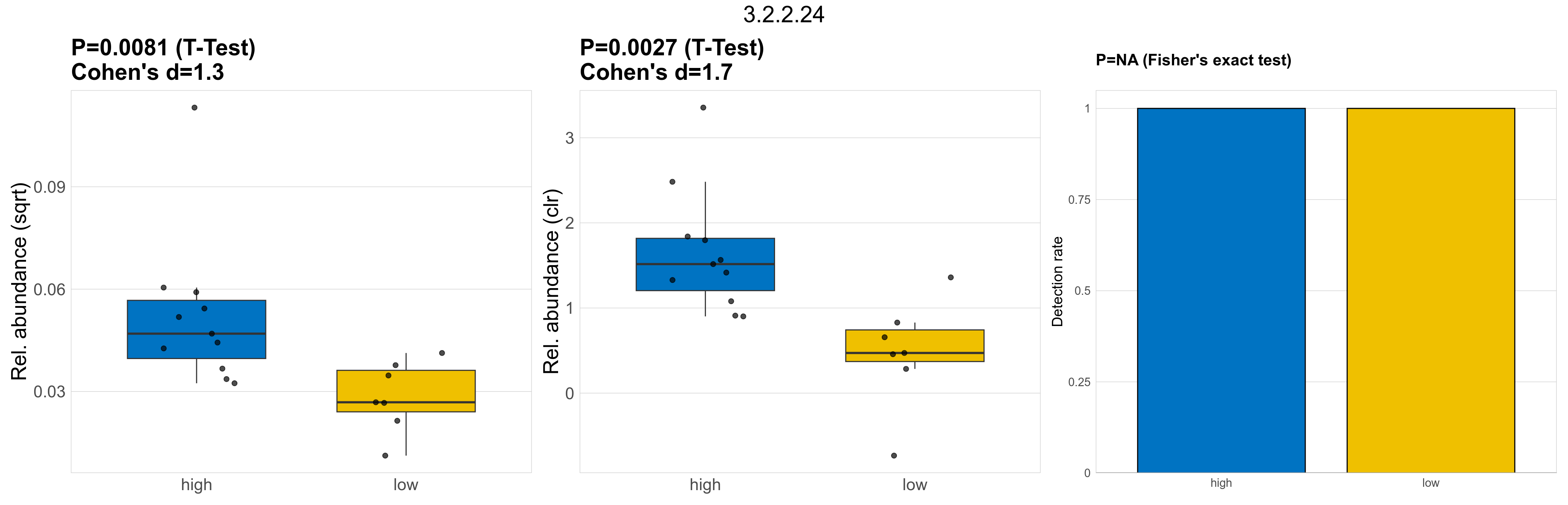Differentially abundant microbial functions were identified using the univariate methods ANOVA or LMER (linear mixed effect regression) on clr transformed relative abundance data, Fisher's exact test, and Aldex2 (ANOVA-like Differential Expression). Aldex2 was run on read count data. Fisher's exact test was used to test for diffrerences in the presence and absence (detection rate) of microbial functions across study groups.