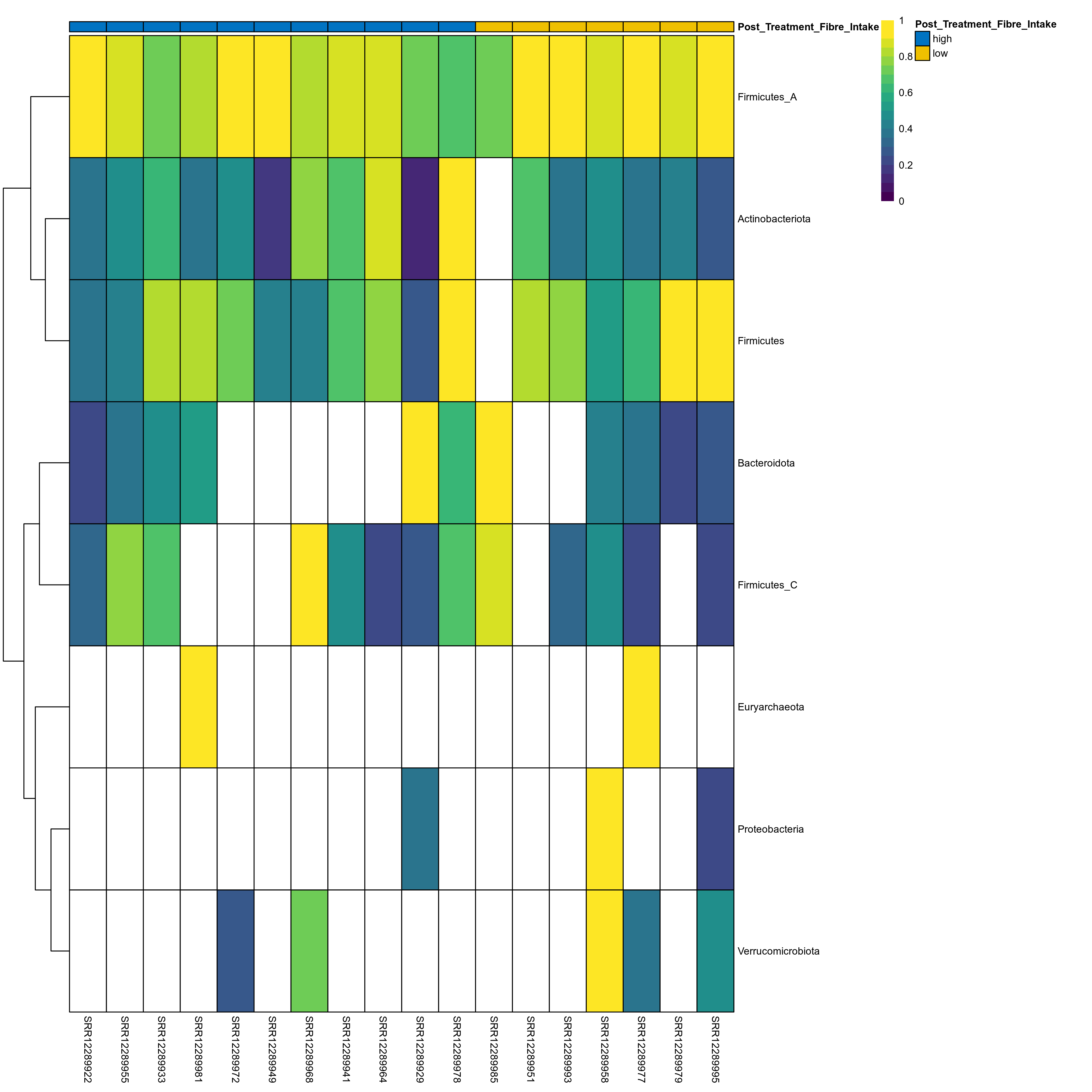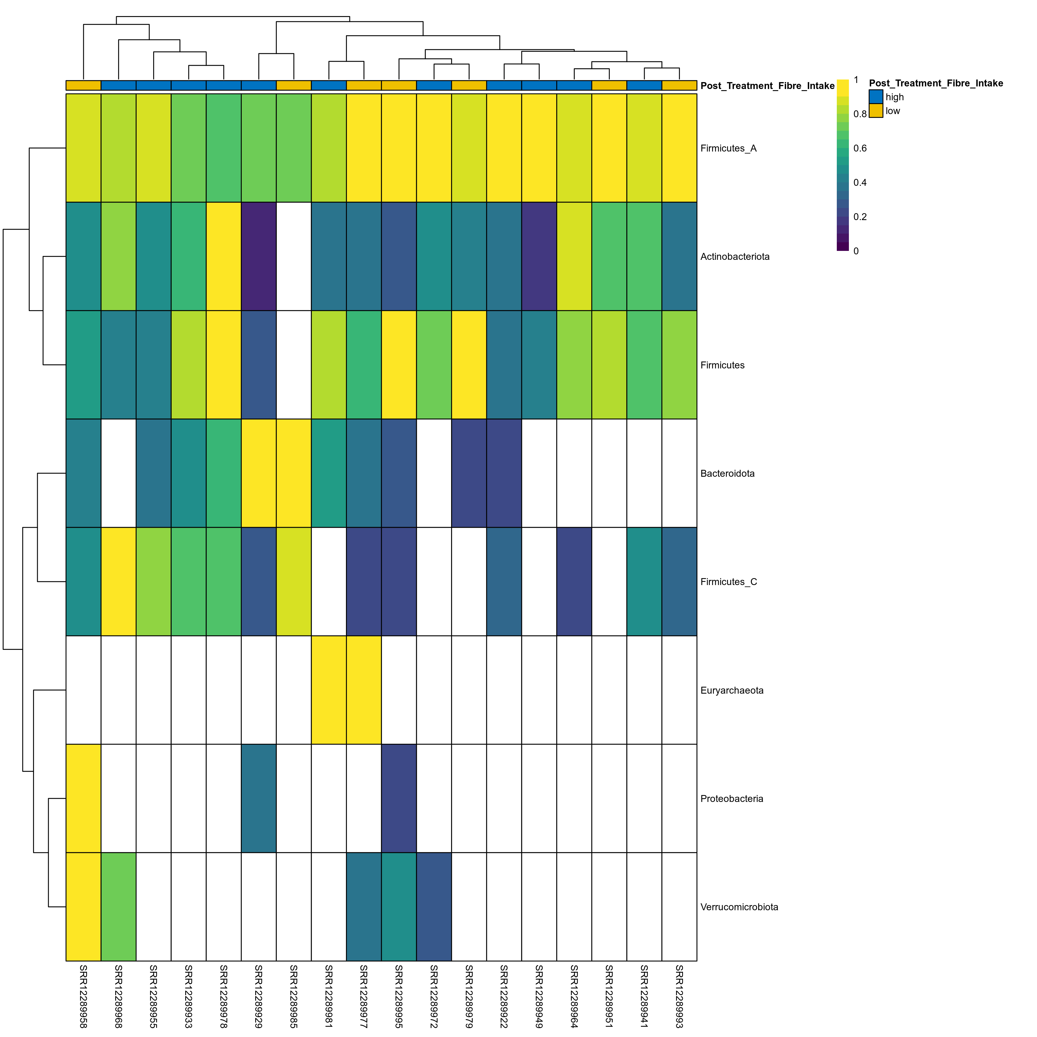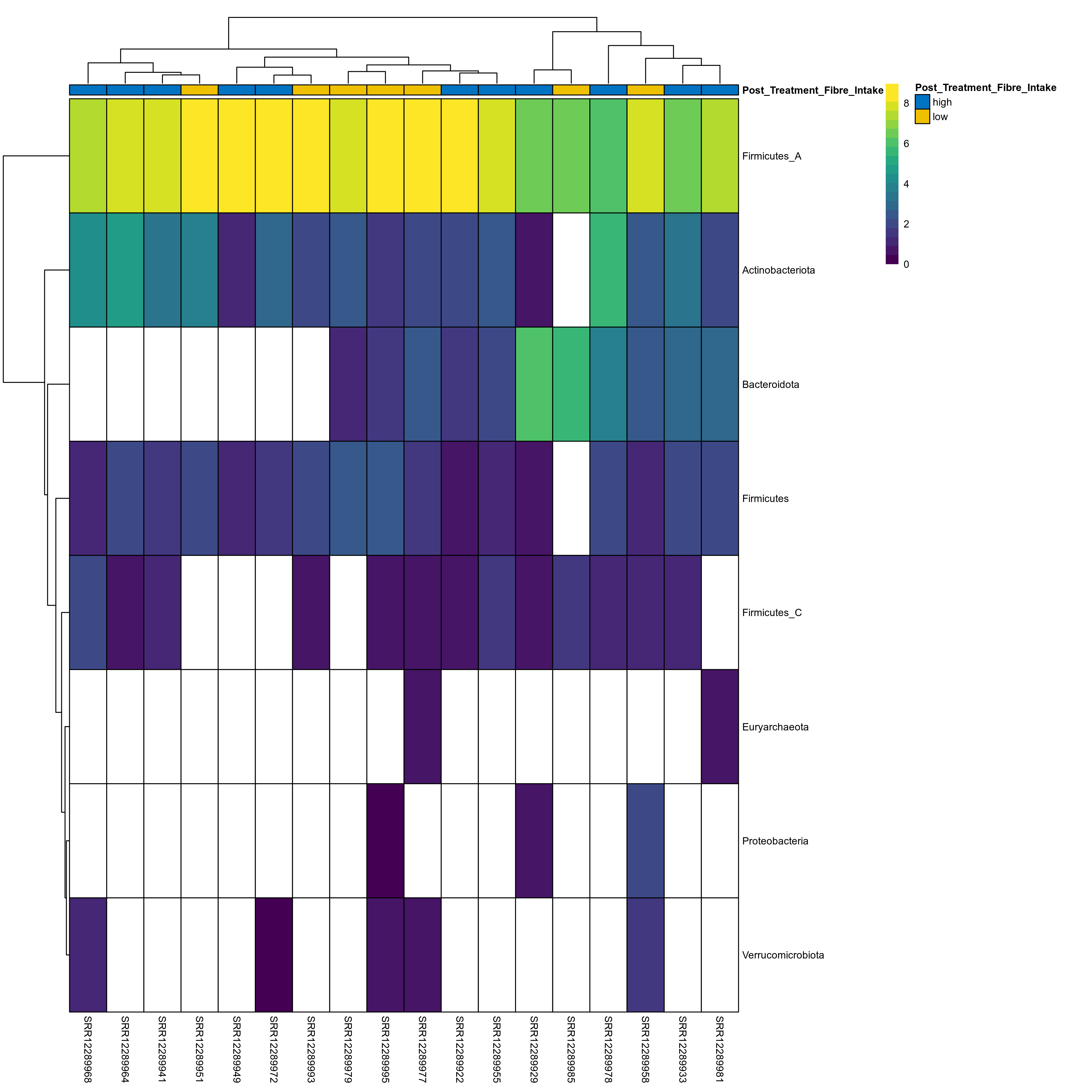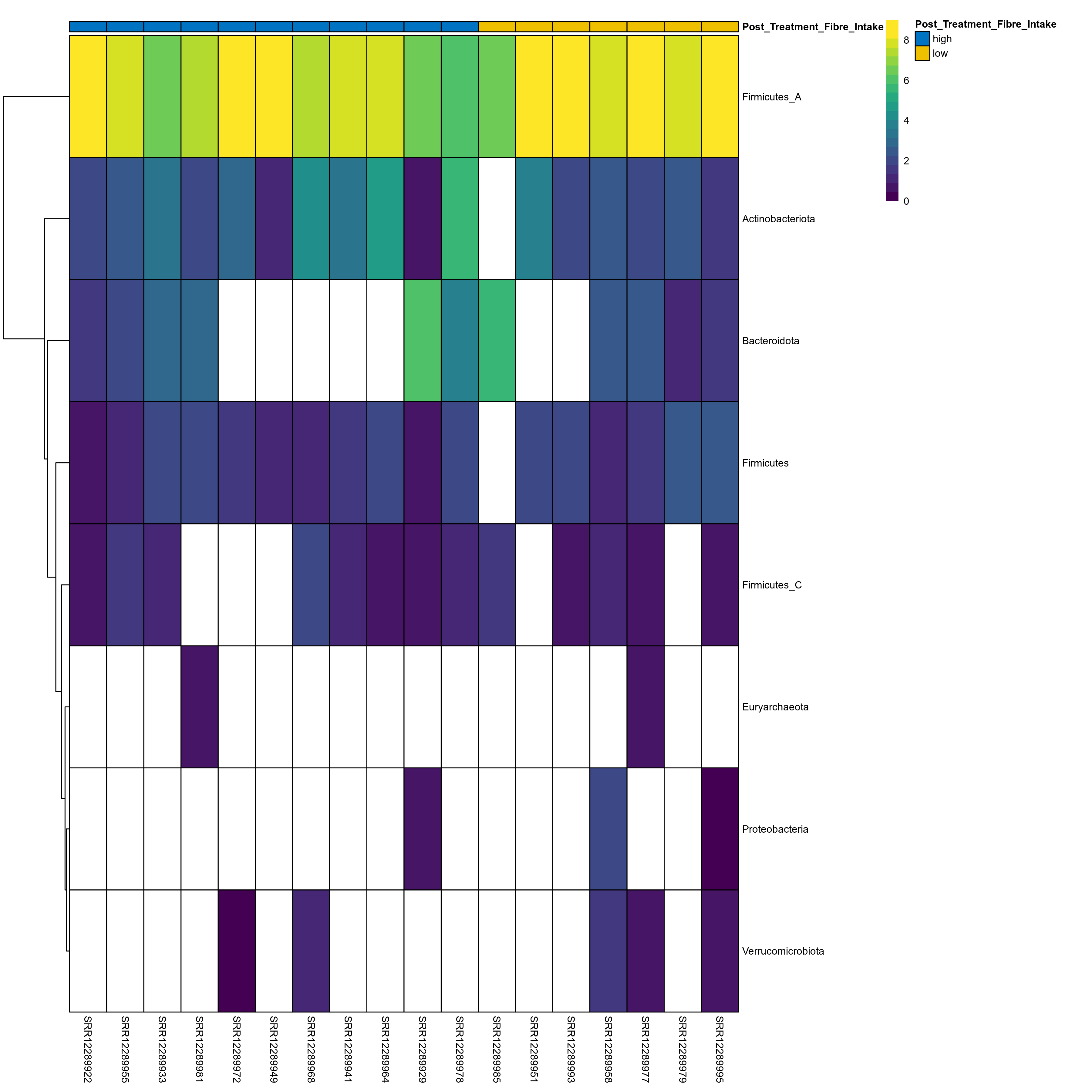 | Index | rarefiedTo | P Welch's t-test | Mean Pos | Mean Abundance | Median Abundance | Mean Post_Treatment_Fibre_Intakehigh | Median Post_Treatment_Fibre_Intakehigh | SD Post_Treatment_Fibre_Intakehigh | Mean Post_Treatment_Fibre_Intakelow | Median Post_Treatment_Fibre_Intakelow | SD Post_Treatment_Fibre_Intakelow | Fold Change Log2(Post_Treatment_Fibre_Intakelow/Post_Treatment_Fibre_Intakehigh) | Positive samples | Positive Post_Treatment_Fibre_Intakehigh | Positive Post_Treatment_Fibre_Intakelow | Positive_Post_Treatment_Fibre_Intakehigh_percent | Positive_Post_Treatment_Fibre_Intakelow_percent |