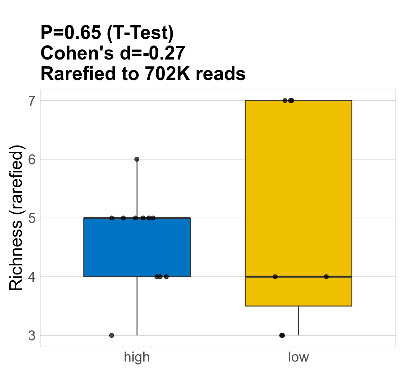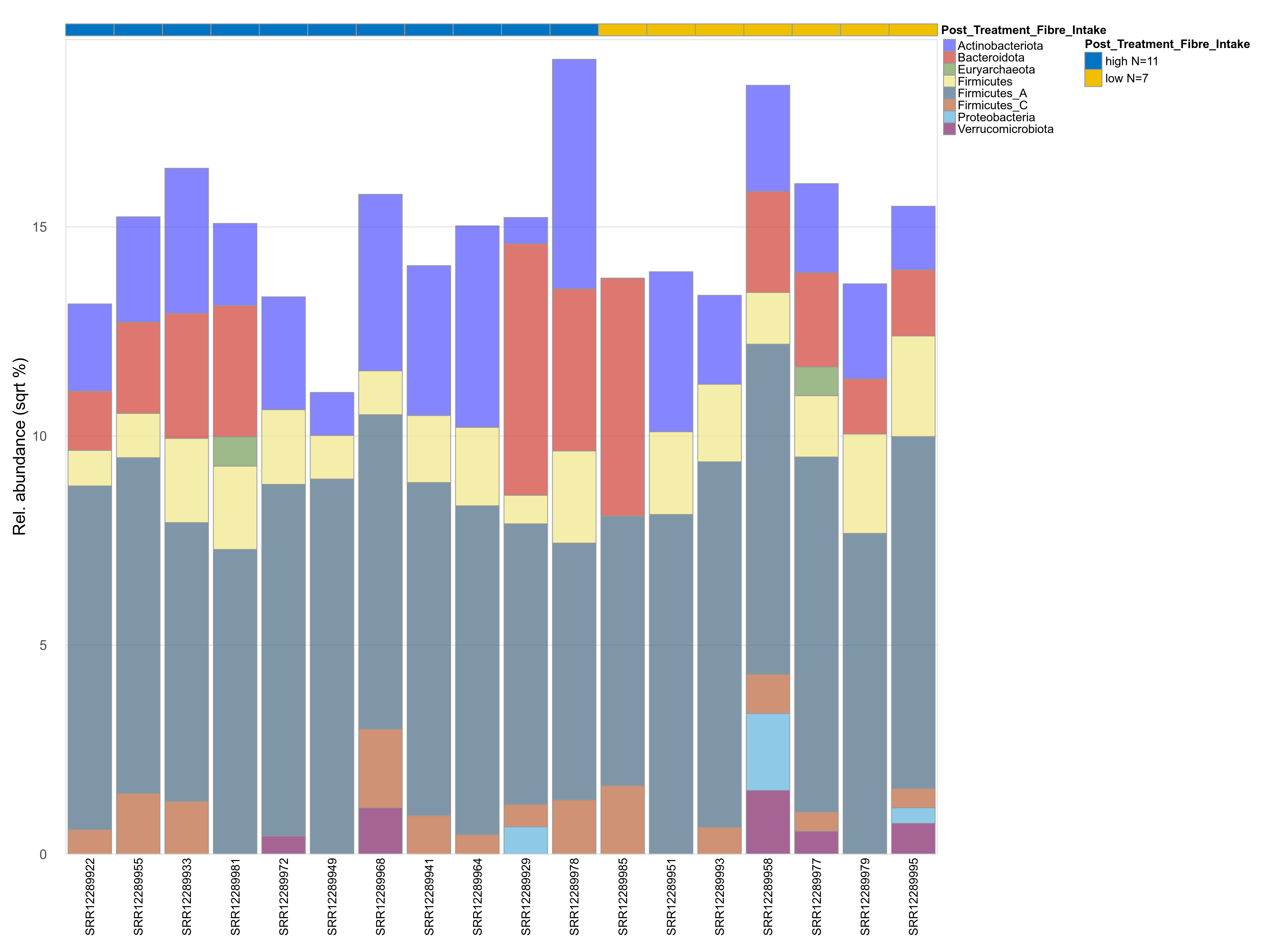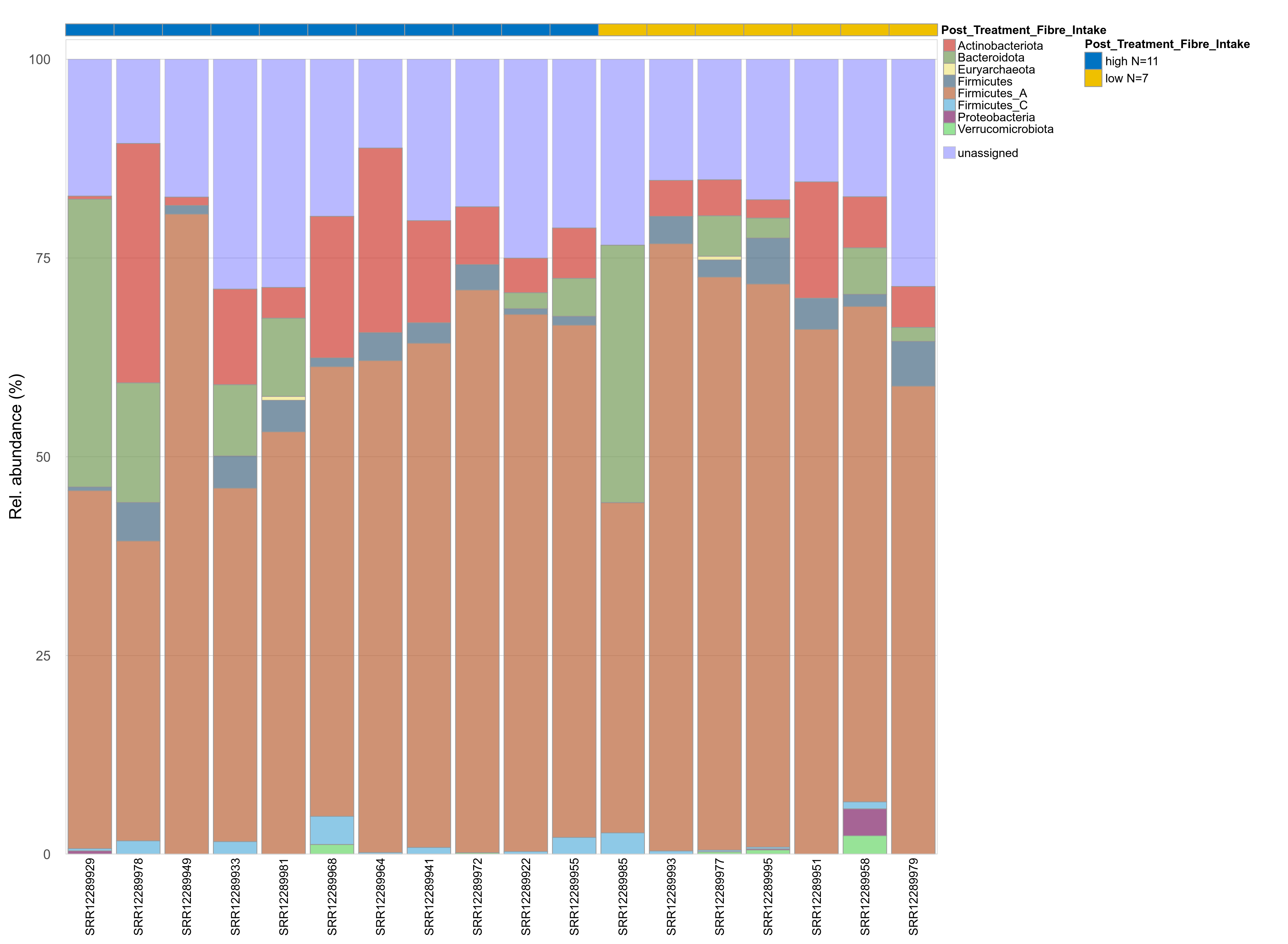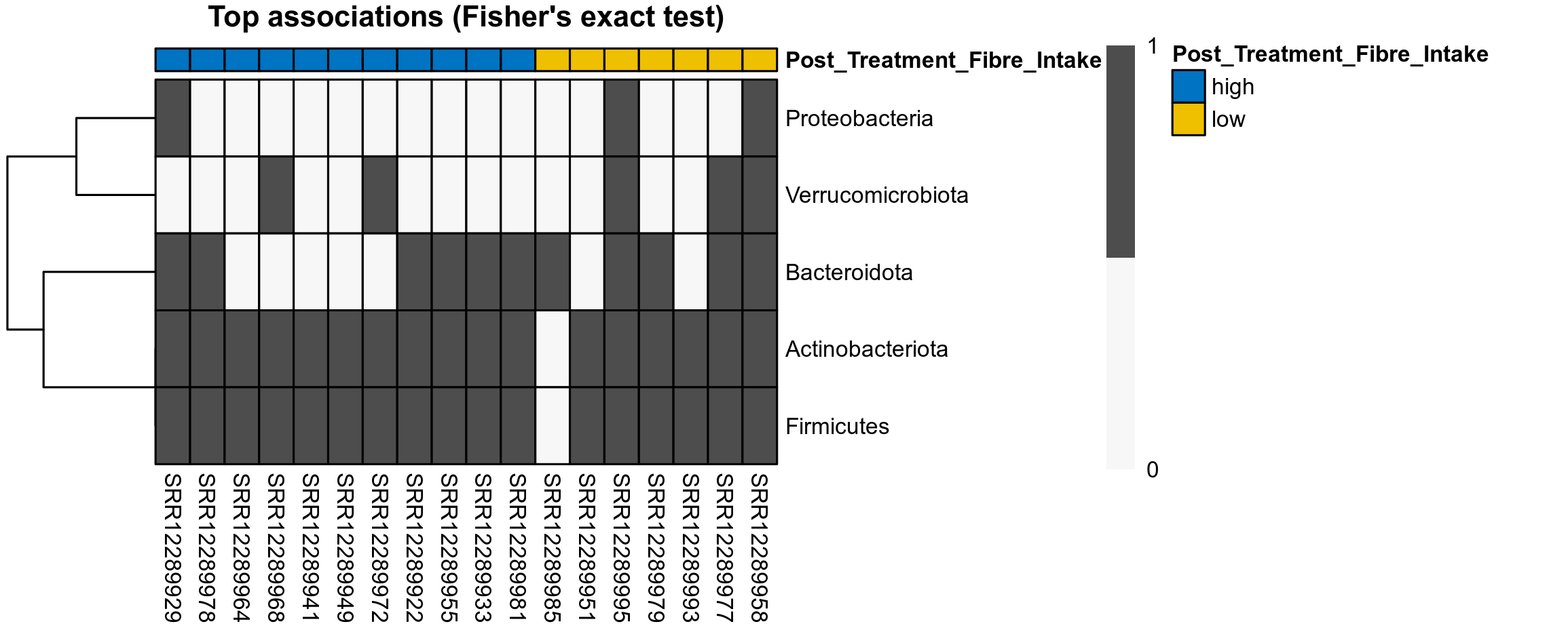 | Index | rarefiedTo | P Welch's t-test | Mean Pos | Mean Abundance | Median Abundance | Mean Post_Treatment_Fibre_Intakehigh | Median Post_Treatment_Fibre_Intakehigh | SD Post_Treatment_Fibre_Intakehigh | Mean Post_Treatment_Fibre_Intakelow | Median Post_Treatment_Fibre_Intakelow | SD Post_Treatment_Fibre_Intakelow | Fold Change Log2(Post_Treatment_Fibre_Intakelow/Post_Treatment_Fibre_Intakehigh) | Positive samples | Positive Post_Treatment_Fibre_Intakehigh | Positive Post_Treatment_Fibre_Intakelow | Positive_Post_Treatment_Fibre_Intakehigh_percent | Positive_Post_Treatment_Fibre_Intakelow_percent |