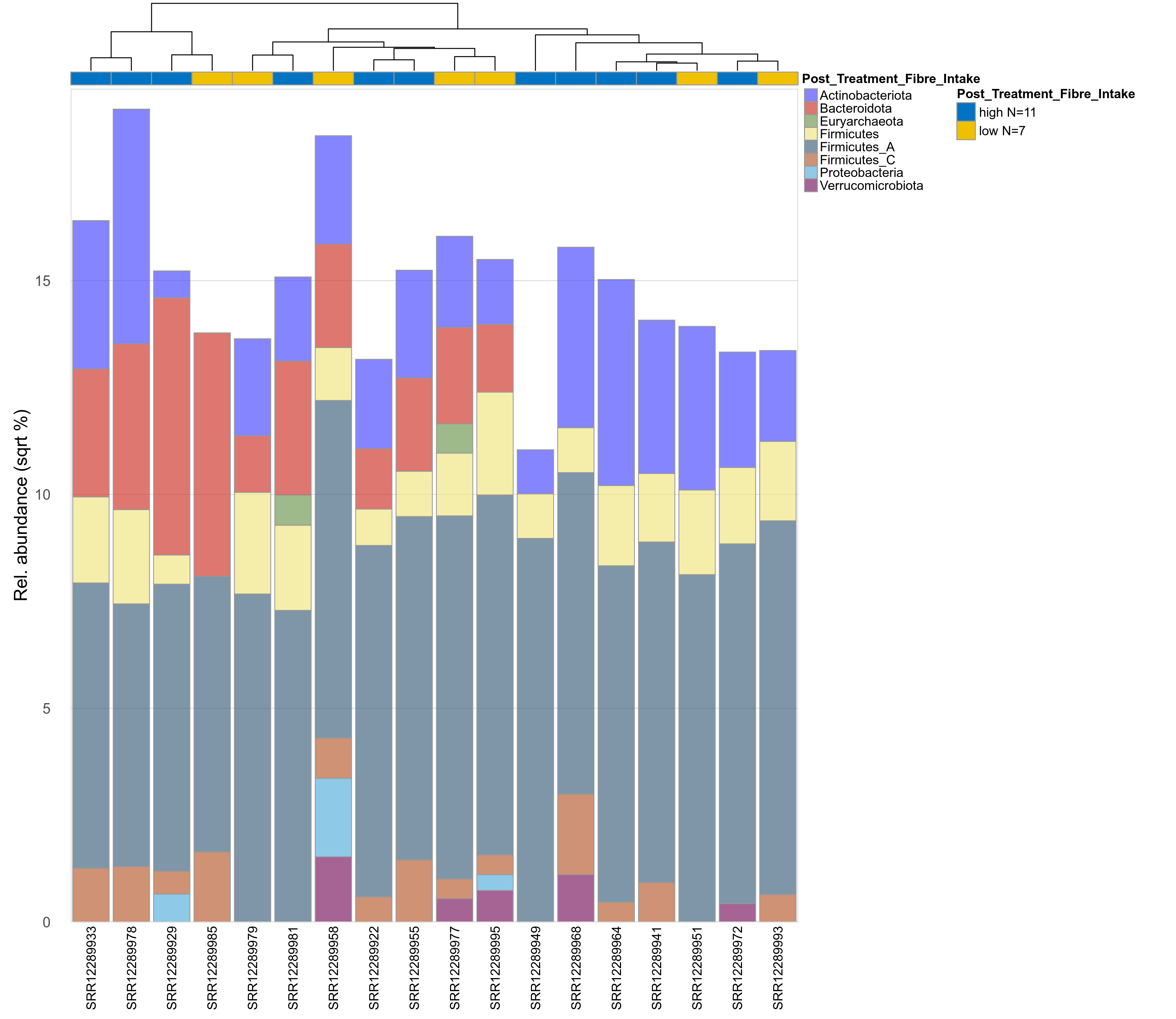 | Taxon | GTDB taxonomy | P Welch's t-test (sqrt) | FDR Welch's t-test (sqrt) | Pbonf Welch's t-test (sqrt) | Cohen's d Welch's t-test (sqrt) | P Welch's t-test (clr) | FDR Welch's t-test (clr) | Pbonf Welch's t-test (clr) | Cohen's d Welch's t-test (clr) | P Fisher's exact test | FDR Fisher's exact test | Pbonf Fisher's exact test | P Welch's t-test (ALDEx2) | FDR Welch's t-test (ALDEx2) | P Wilcoxon rank test (ALDEx2) | FDR Wilcoxon rank test (ALDEx2) | Mean Pos | Mean Abundance | Median Abundance | Mean Post_Treatment_Fibre_Intakehigh | Median Post_Treatment_Fibre_Intakehigh | SD Post_Treatment_Fibre_Intakehigh | Mean Post_Treatment_Fibre_Intakelow | Median Post_Treatment_Fibre_Intakelow | SD Post_Treatment_Fibre_Intakelow | Fold Change Log2(Post_Treatment_Fibre_Intakelow/Post_Treatment_Fibre_Intakehigh) | Positive samples | Positive Post_Treatment_Fibre_Intakehigh | Positive Post_Treatment_Fibre_Intakelow | Positive_Post_Treatment_Fibre_Intakehigh_percent | Positive_Post_Treatment_Fibre_Intakelow_percent |