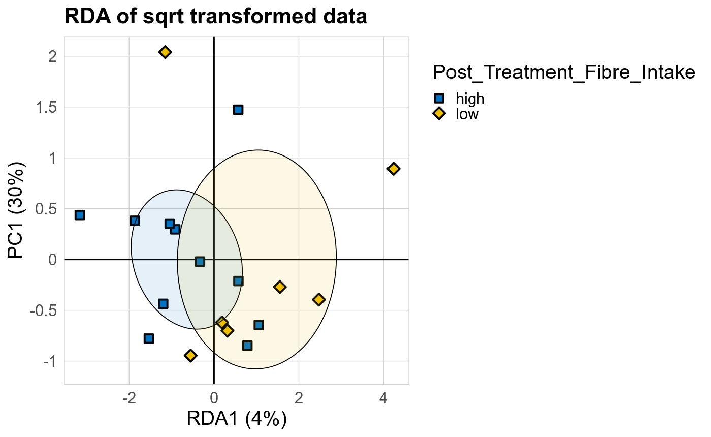 The supervised methods Adonis and Redundancy analysis (RDA) were used to assess if variance in microbial community composition can be attributed to the study condition. NMDS, PCoA and Adonis were run on Bray-Curtis dissimilarities. A short introduction of the used methods can be found at the GUide to STatistical Analysis in Microbial Ecology (GUSTA ME). Sparse Partial Least Square Discriminant Analysis (sPLS-DA) from the MixMc package was additionaly used to extract features associated with the study condition.