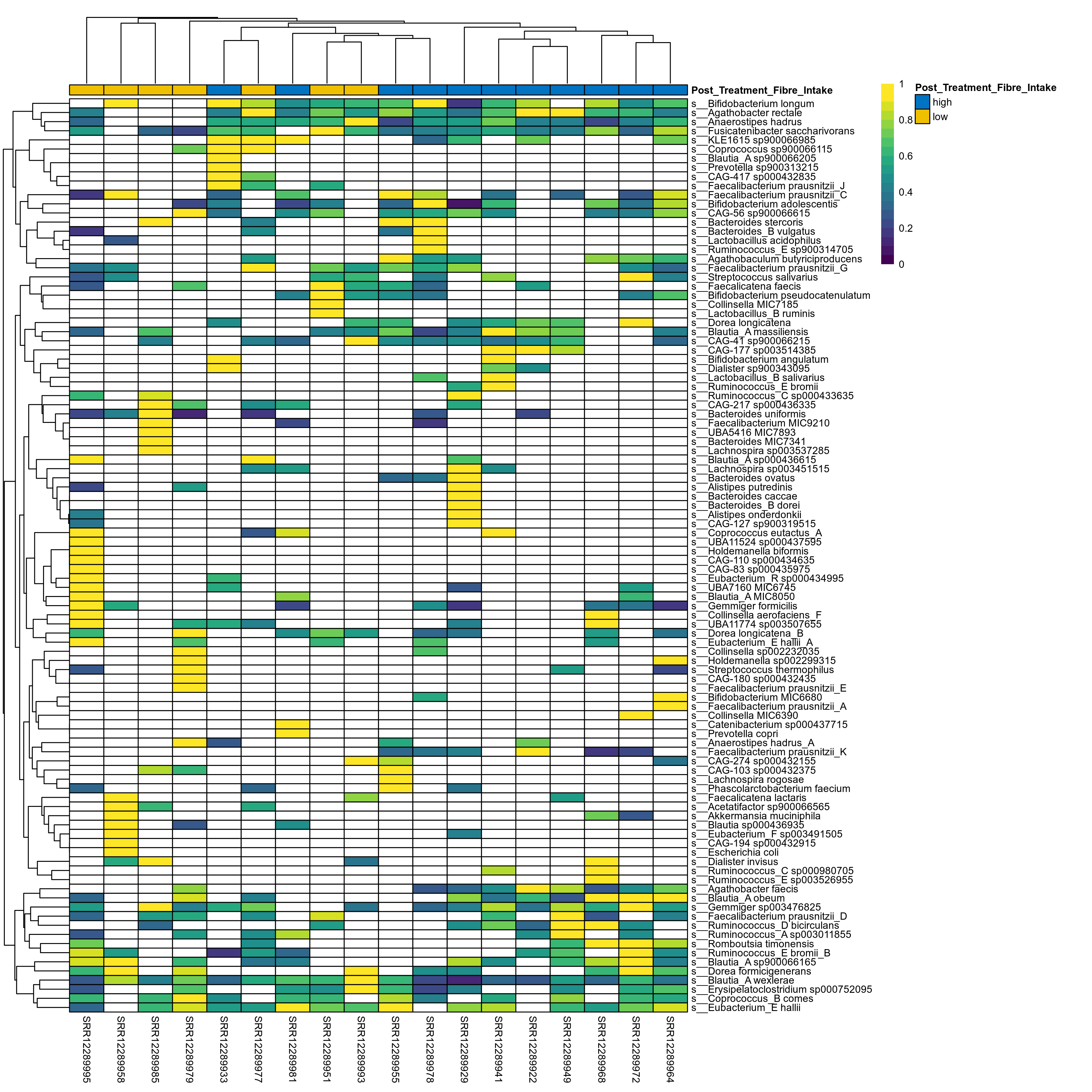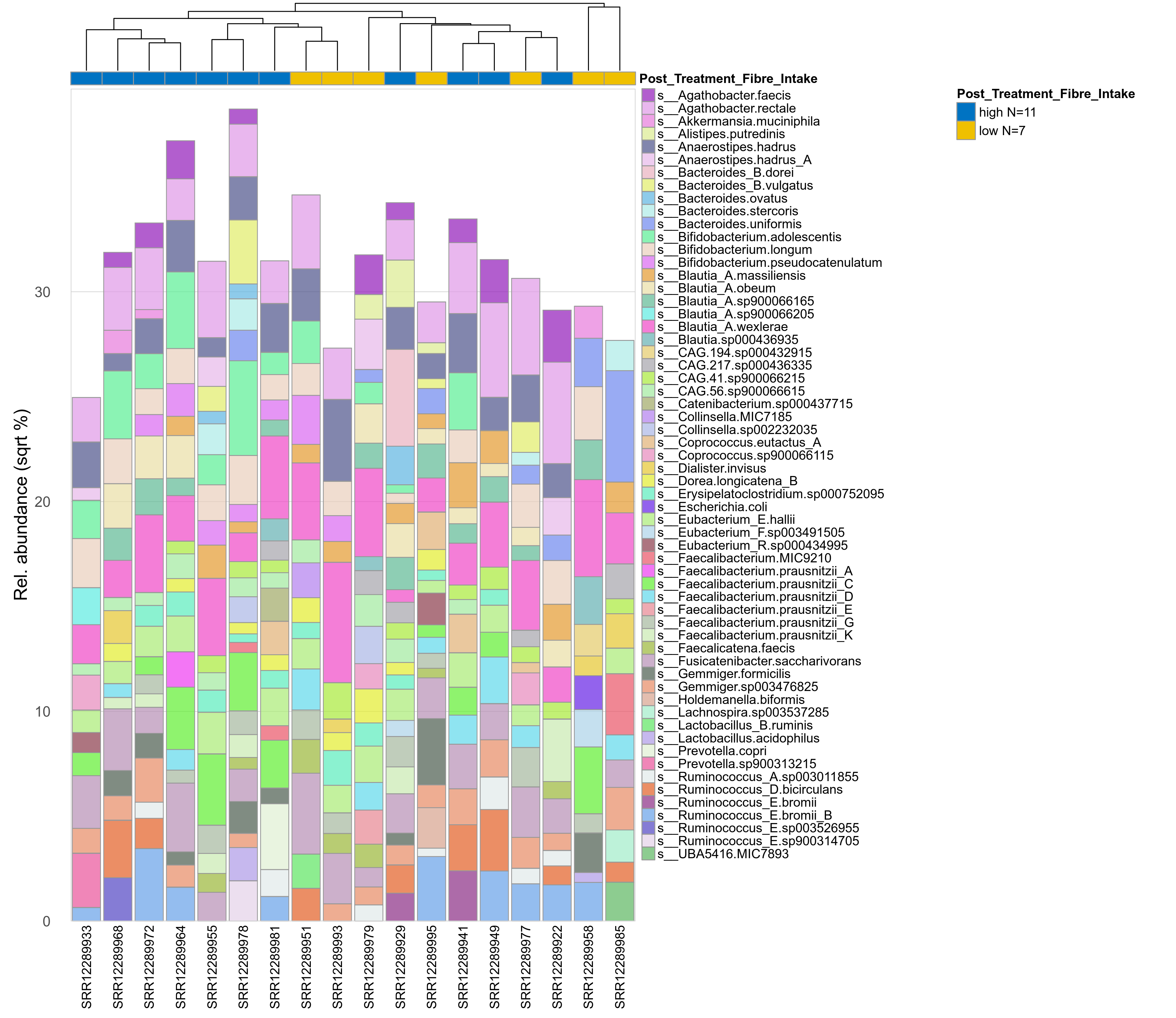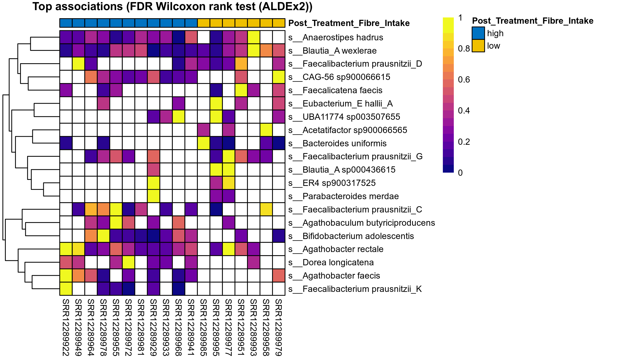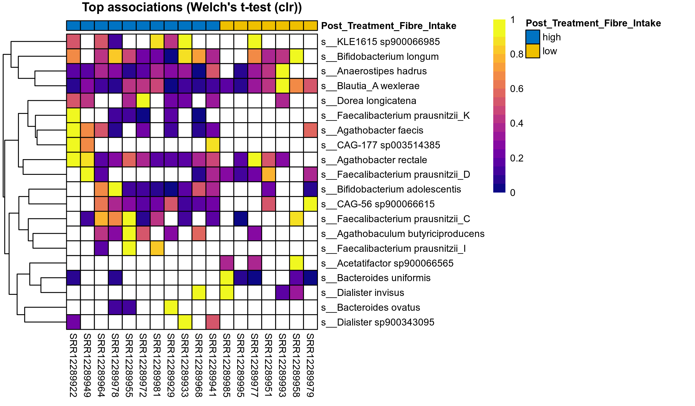 | Taxon | GTDB taxonomy | P Welch's t-test (sqrt) | FDR Welch's t-test (sqrt) | Pbonf Welch's t-test (sqrt) | Cohen's d Welch's t-test (sqrt) | P Welch's t-test (clr) | FDR Welch's t-test (clr) | Pbonf Welch's t-test (clr) | Cohen's d Welch's t-test (clr) | P Fisher's exact test | FDR Fisher's exact test | Pbonf Fisher's exact test | P Welch's t-test (ALDEx2) | FDR Welch's t-test (ALDEx2) | P Wilcoxon rank test (ALDEx2) | FDR Wilcoxon rank test (ALDEx2) | Mean Pos | Mean Abundance | Median Abundance | Mean Post_Treatment_Fibre_Intakehigh | Median Post_Treatment_Fibre_Intakehigh | SD Post_Treatment_Fibre_Intakehigh | Mean Post_Treatment_Fibre_Intakelow | Median Post_Treatment_Fibre_Intakelow | SD Post_Treatment_Fibre_Intakelow | Fold Change Log2(Post_Treatment_Fibre_Intakelow/Post_Treatment_Fibre_Intakehigh) | Positive samples | Positive Post_Treatment_Fibre_Intakehigh | Positive Post_Treatment_Fibre_Intakelow | Positive_Post_Treatment_Fibre_Intakehigh_percent | Positive_Post_Treatment_Fibre_Intakelow_percent |
