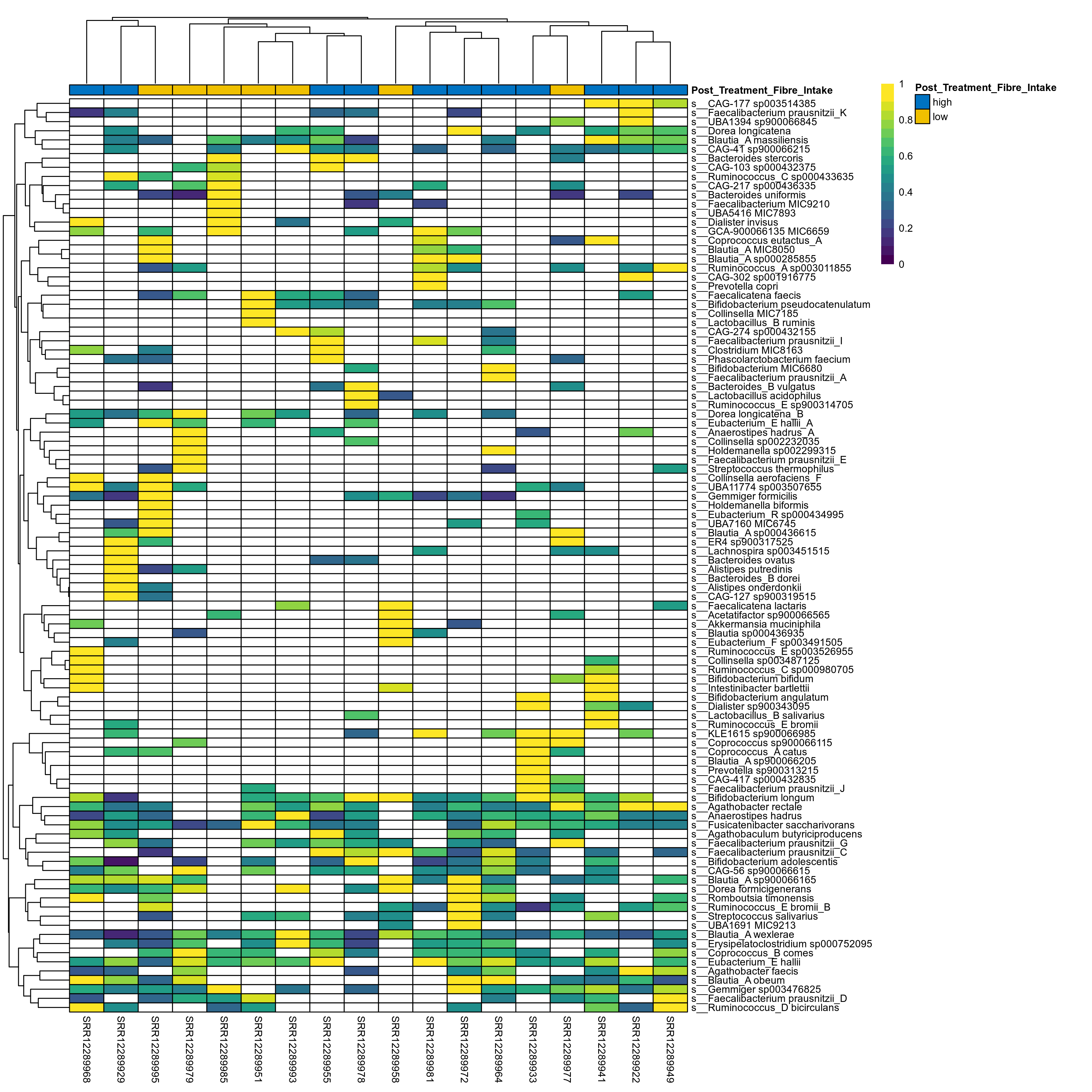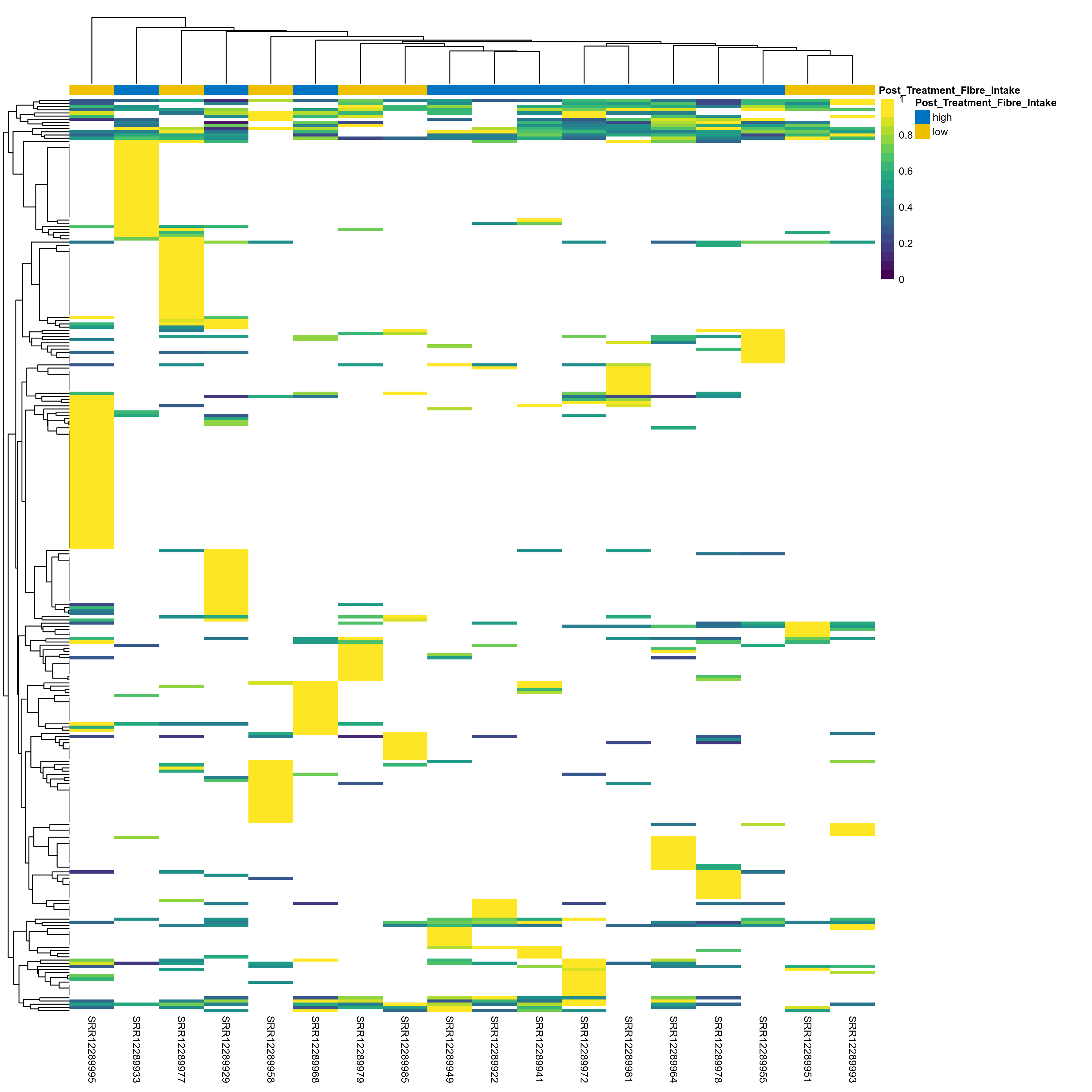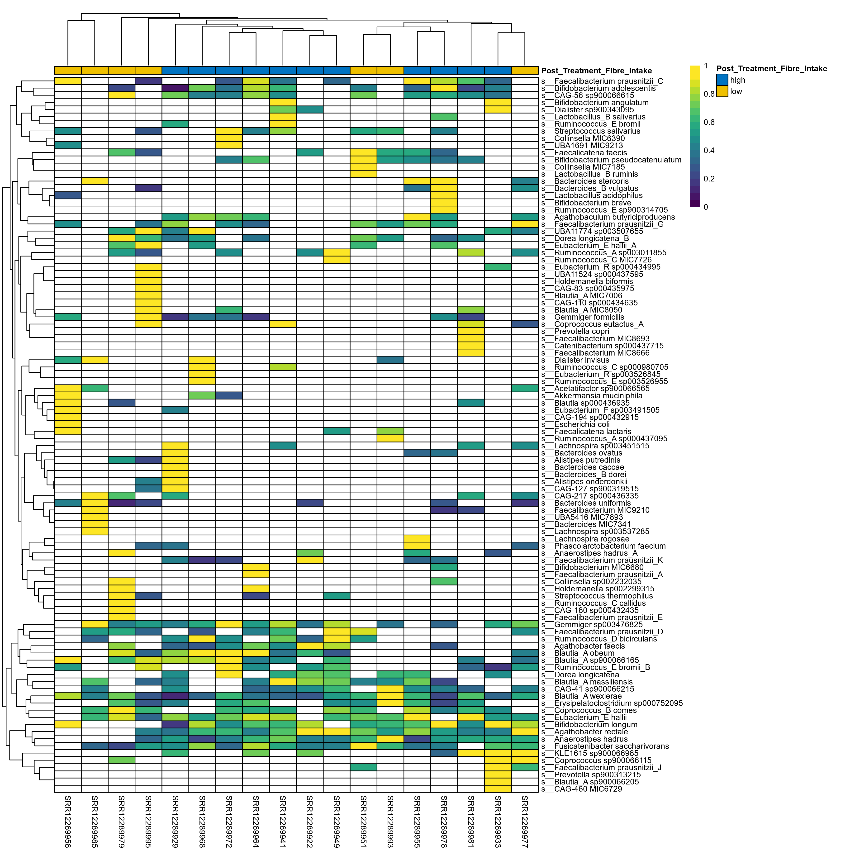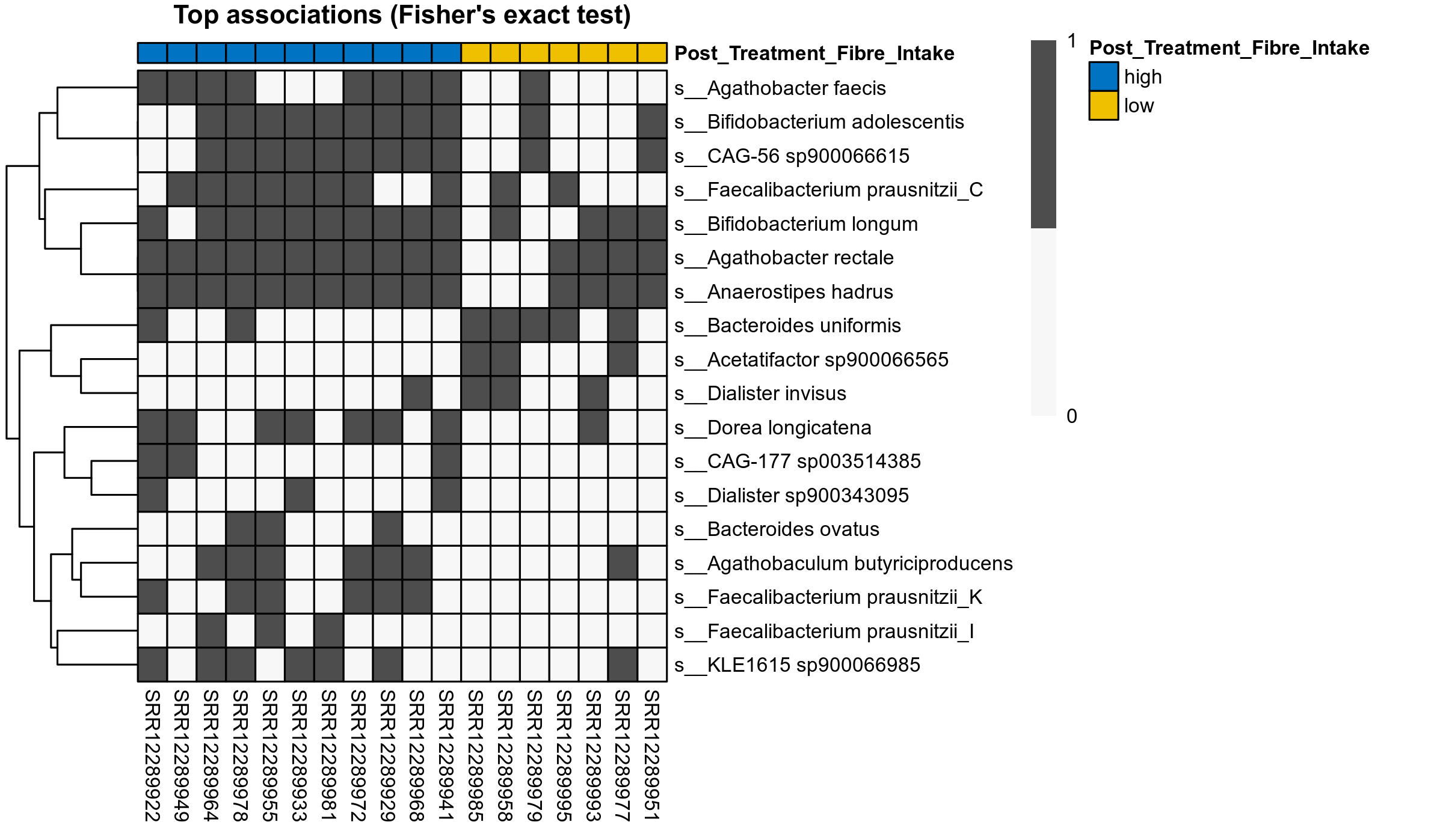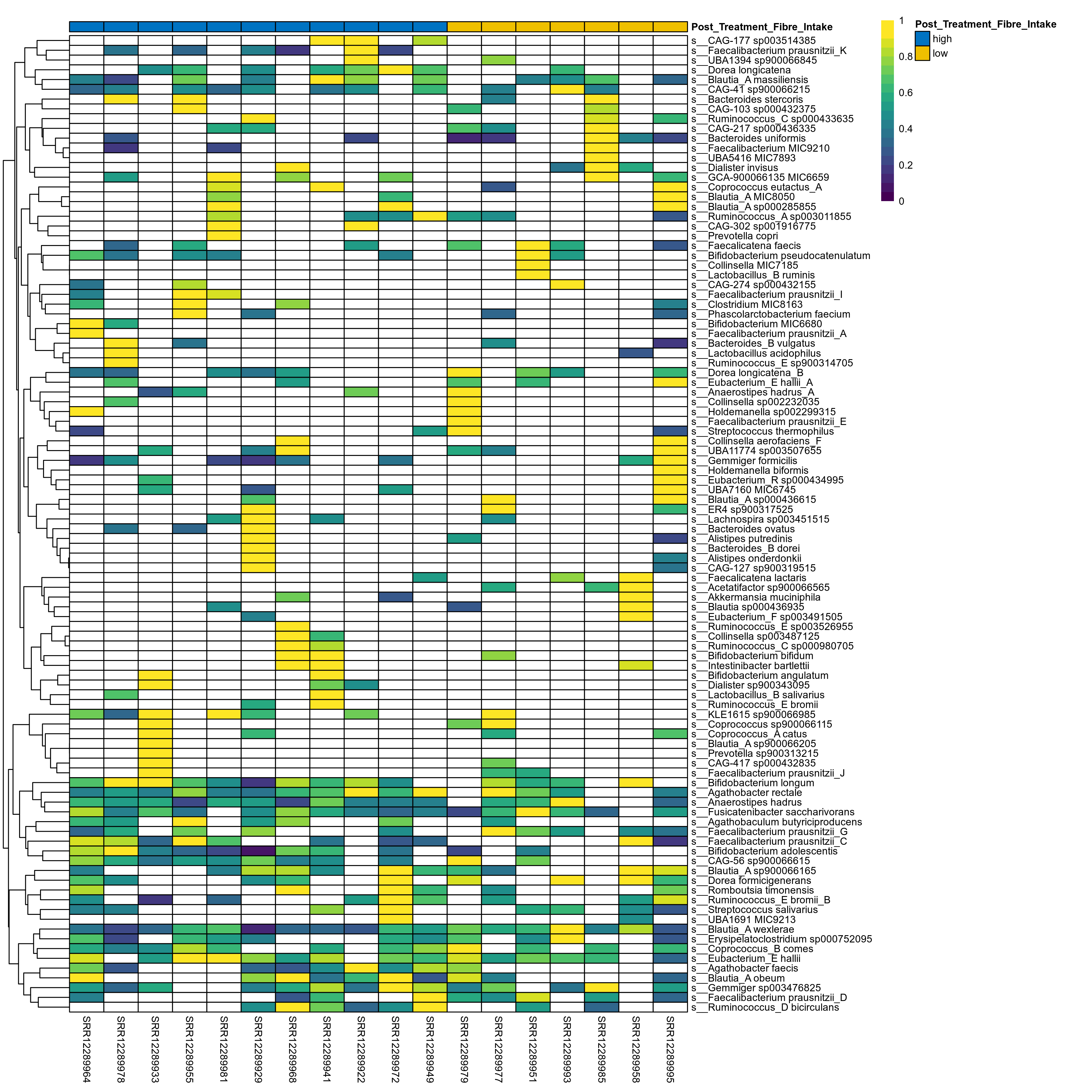 | Taxon | GTDB taxonomy | P Welch's t-test (sqrt) | FDR Welch's t-test (sqrt) | Pbonf Welch's t-test (sqrt) | Cohen's d Welch's t-test (sqrt) | P Welch's t-test (clr) | FDR Welch's t-test (clr) | Pbonf Welch's t-test (clr) | Cohen's d Welch's t-test (clr) | P Fisher's exact test | FDR Fisher's exact test | Pbonf Fisher's exact test | P Welch's t-test (ALDEx2) | FDR Welch's t-test (ALDEx2) | P Wilcoxon rank test (ALDEx2) | FDR Wilcoxon rank test (ALDEx2) | Mean Pos | Mean Abundance | Median Abundance | Mean Post_Treatment_Fibre_Intakehigh | Median Post_Treatment_Fibre_Intakehigh | SD Post_Treatment_Fibre_Intakehigh | Mean Post_Treatment_Fibre_Intakelow | Median Post_Treatment_Fibre_Intakelow | SD Post_Treatment_Fibre_Intakelow | Fold Change Log2(Post_Treatment_Fibre_Intakelow/Post_Treatment_Fibre_Intakehigh) | Positive samples | Positive Post_Treatment_Fibre_Intakehigh | Positive Post_Treatment_Fibre_Intakelow | Positive_Post_Treatment_Fibre_Intakehigh_percent | Positive_Post_Treatment_Fibre_Intakelow_percent |