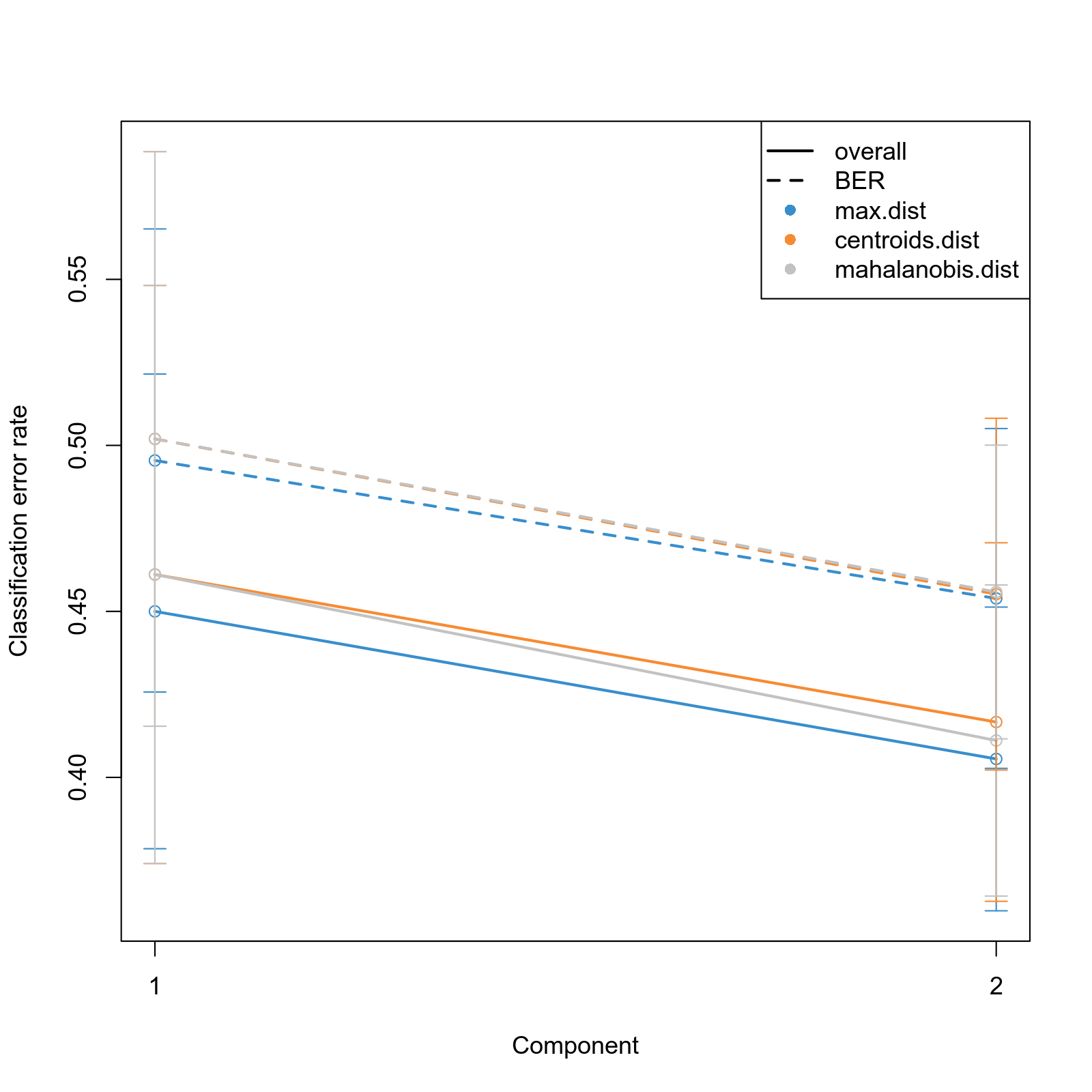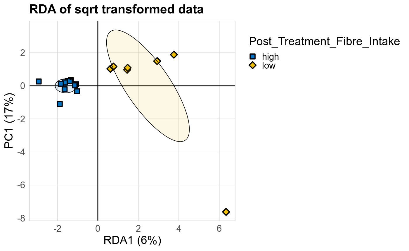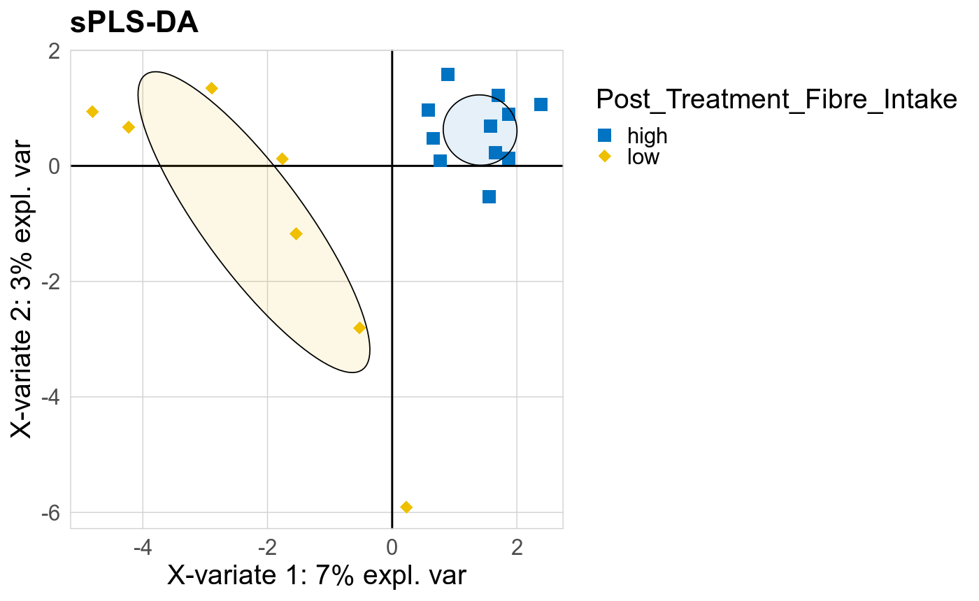 The supervised methods Adonis and Redundancy analysis (RDA) were used to assess if variance in microbial community composition can be attributed to the study condition. NMDS, PCoA and Adonis were run on Bray-Curtis dissimilarities. A short introduction of the used methods can be found at the GUide to STatistical Analysis in Microbial Ecology (GUSTA ME). Sparse Partial Least Square Discriminant Analysis (sPLS-DA) from the MixMc package was additionaly used to extract features associated with the study condition.
