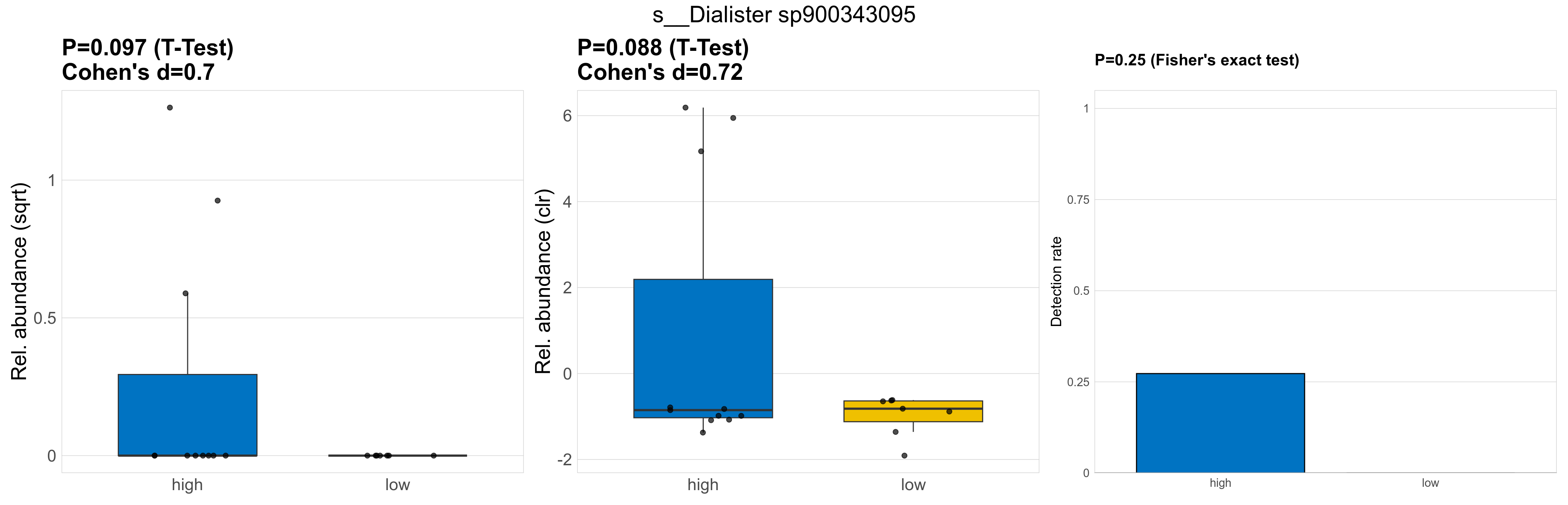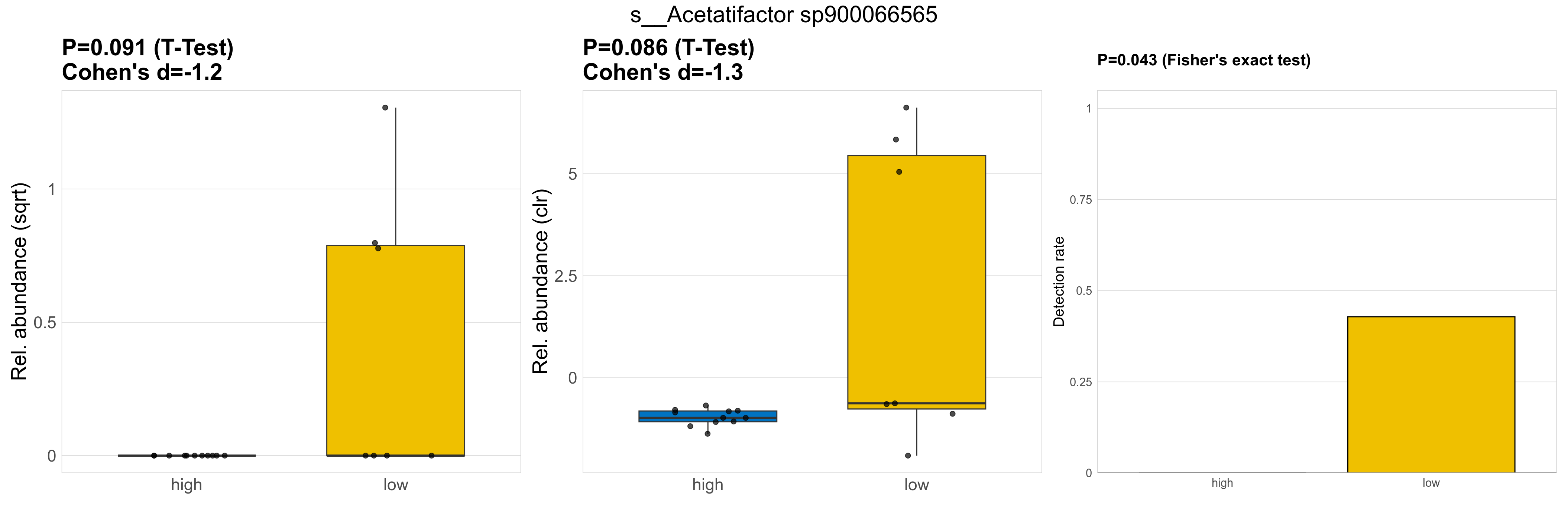 | s__Acetatifactor sp900066565 | d__Bacteria; p__Firmicutes_A; c__Clostridia; o__Lachnospirales; f__Lachnospiraceae; g__Acetatifactor | 0.091 | 0.72 | 1 | -1.2 | 0.086 | 0.45 | 1 | -1.3 | 0.043 | 0.44 | 1 | 0.086 | 0.55 | 0.15 | 0.59 | 0.98 | 0.16 | 0 | 0 | 0 | 0 | 0.42 | 0 | 0.64 | Inf | 3 / 18 (17%) | 0 / 11 (0%) | 3 / 7 (43%) | 0 | 0.429 |