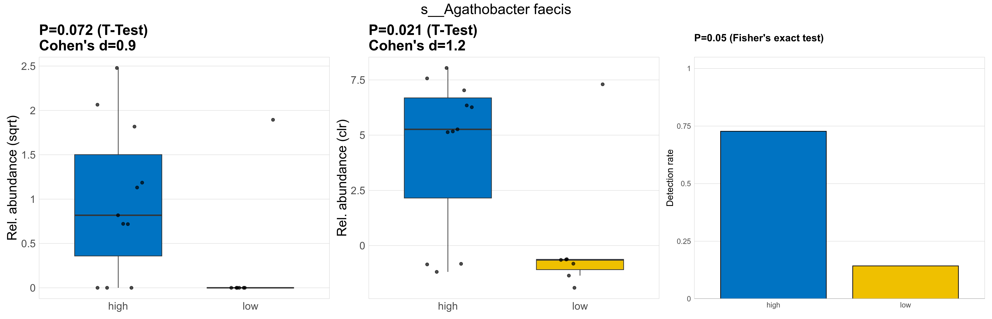 | s__Agathobacter faecis | d__Bacteria; p__Firmicutes_A; c__Clostridia; o__Lachnospirales; f__Lachnospiraceae; g__Agathobacter | 0.072 | 0.72 | 1 | 0.9 | 0.021 | 0.45 | 1 | 1.2 | 0.05 | 0.44 | 1 | 0.027 | 0.5 | 0.08 | 0.57 | 2.4 | 1.2 | 0.26 | 1.6 | 0.67 | 2 | 0.51 | 0 | 1.4 | -1.6 | 9 / 18 (50%) | 8 / 11 (73%) | 1 / 7 (14%) | 0.727 | 0.143 |