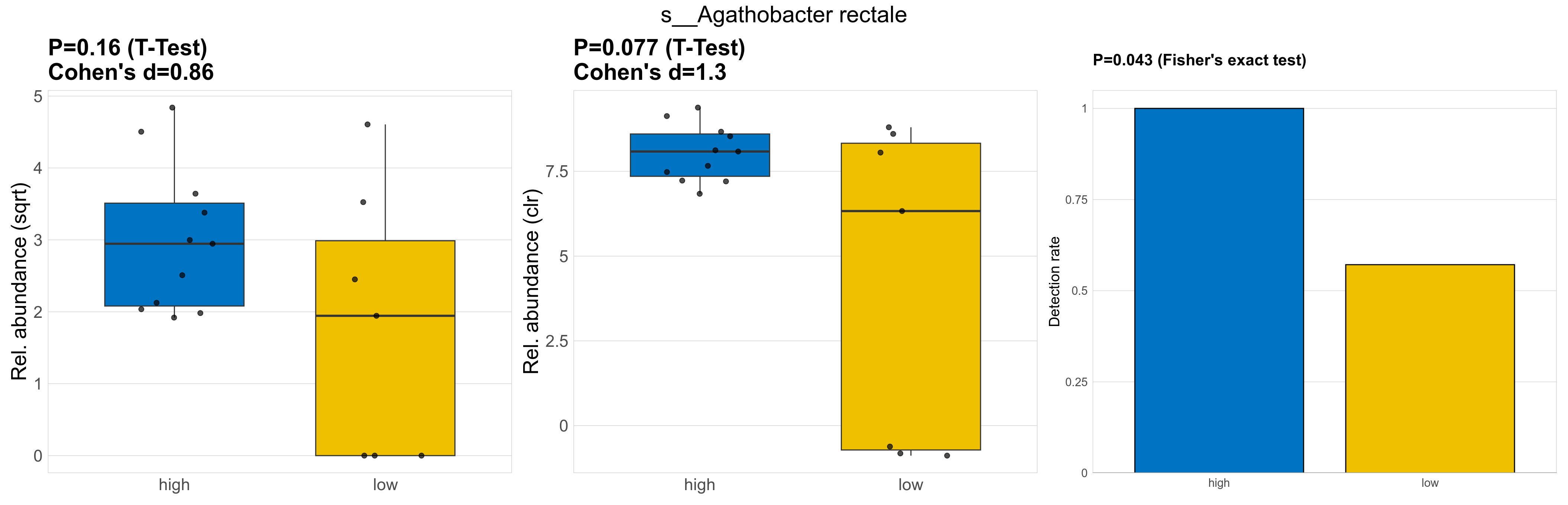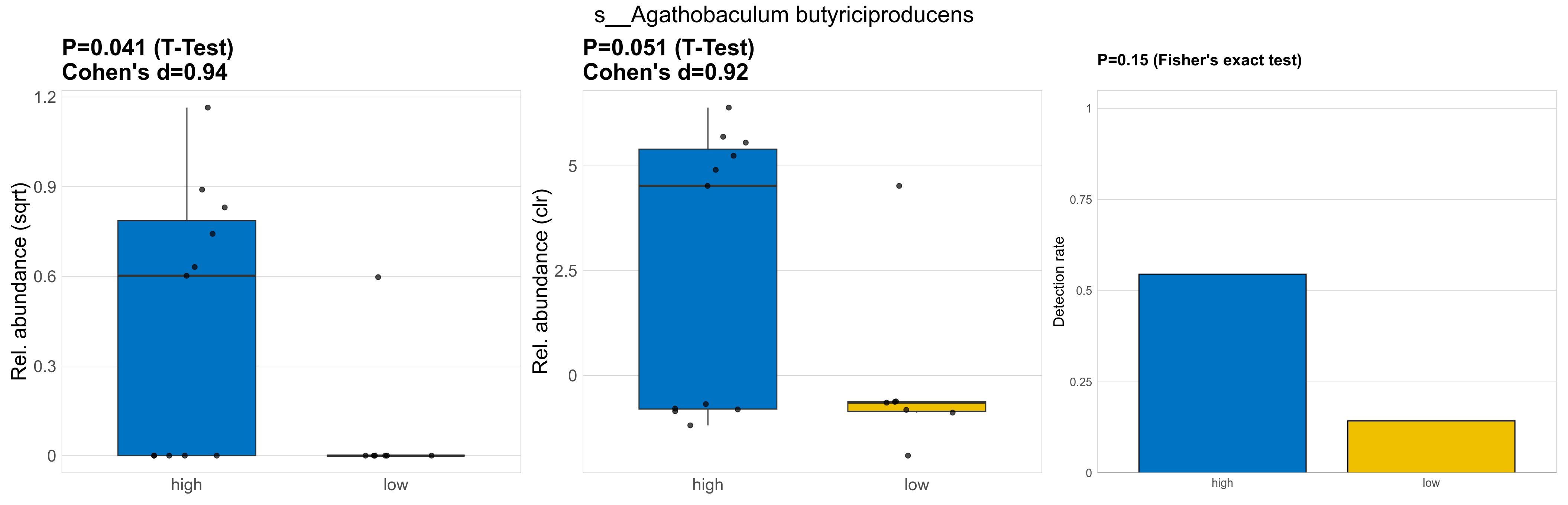 | s__Agathobacter rectale | d__Bacteria; p__Firmicutes_A; c__Clostridia; o__Lachnospirales; f__Lachnospiraceae; g__Agathobacter | 0.16 | 0.75 | 1 | 0.86 | 0.077 | 0.45 | 1 | 1.3 | 0.043 | 0.44 | 1 | 0.088 | 0.55 | 0.27 | 0.71 | 10 | 8.4 | 6.2 | 9.9 | 8.7 | 6.8 | 6.2 | 3.8 | 8 | -0.68 | 15 / 18 (83%) | 11 / 11 (100%) | 4 / 7 (57%) | 1 | 0.571 |