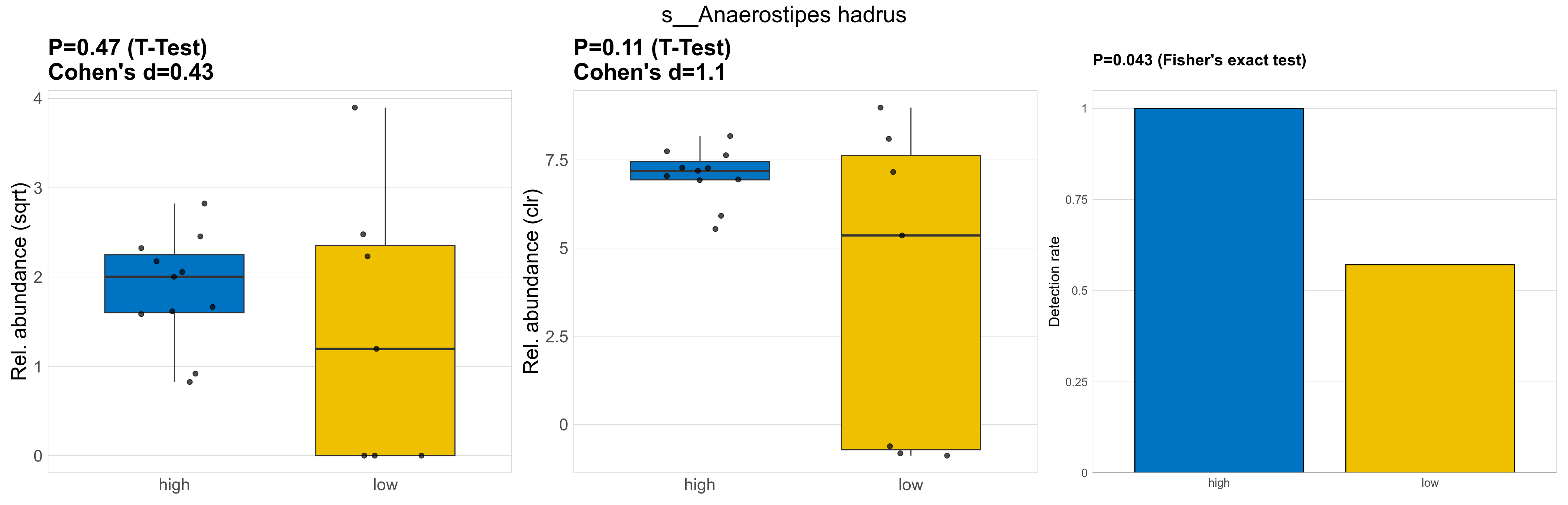 | s__Anaerostipes hadrus_A | d__Bacteria; p__Firmicutes_A; c__Clostridia; o__Lachnospirales; f__Lachnospiraceae; g__Anaerostipes | 1 | 1 | 1 | 0.0014 | 0.66 | 0.92 | 1 | 0.21 | 1 | 1 | 1 | 0.75 | 0.9 | 0.68 | 0.89 | 2.8 | 0.63 | 0 | 0.5 | 0 | 1.1 | 0.82 | 0 | 2.2 | 0.71 | 4 / 18 (22%) | 3 / 11 (27%) | 1 / 7 (14%) | 0.273 | 0.143 |