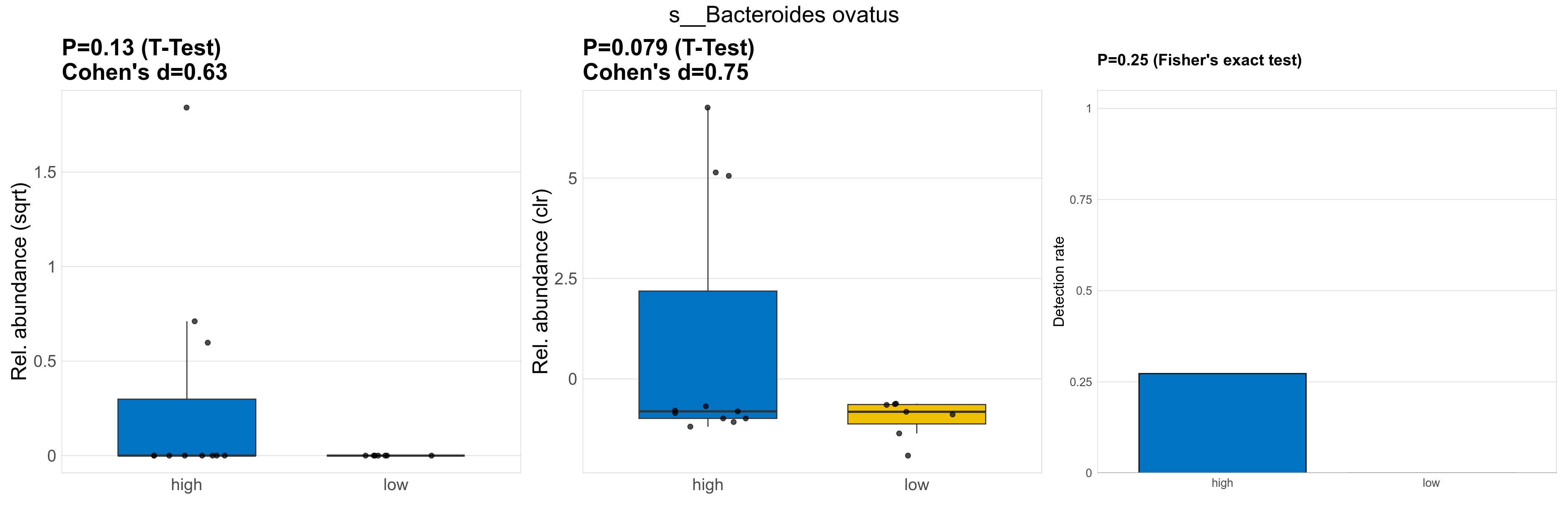 | s__Bacteroides ovatus | d__Bacteria; p__Bacteroidota; c__Bacteroidia; o__Bacteroidales; f__Bacteroidaceae; g__Bacteroides | 0.13 | 0.74 | 1 | 0.63 | 0.079 | 0.45 | 1 | 0.75 | 0.25 | 0.97 | 1 | 0.2 | 0.62 | 0.51 | 0.81 | 1.4 | 0.24 | 0 | 0.39 | 0 | 1 | 0 | 0 | 0 | -Inf | 3 / 18 (17%) | 3 / 11 (27%) | 0 / 7 (0%) | 0.273 | 0 |