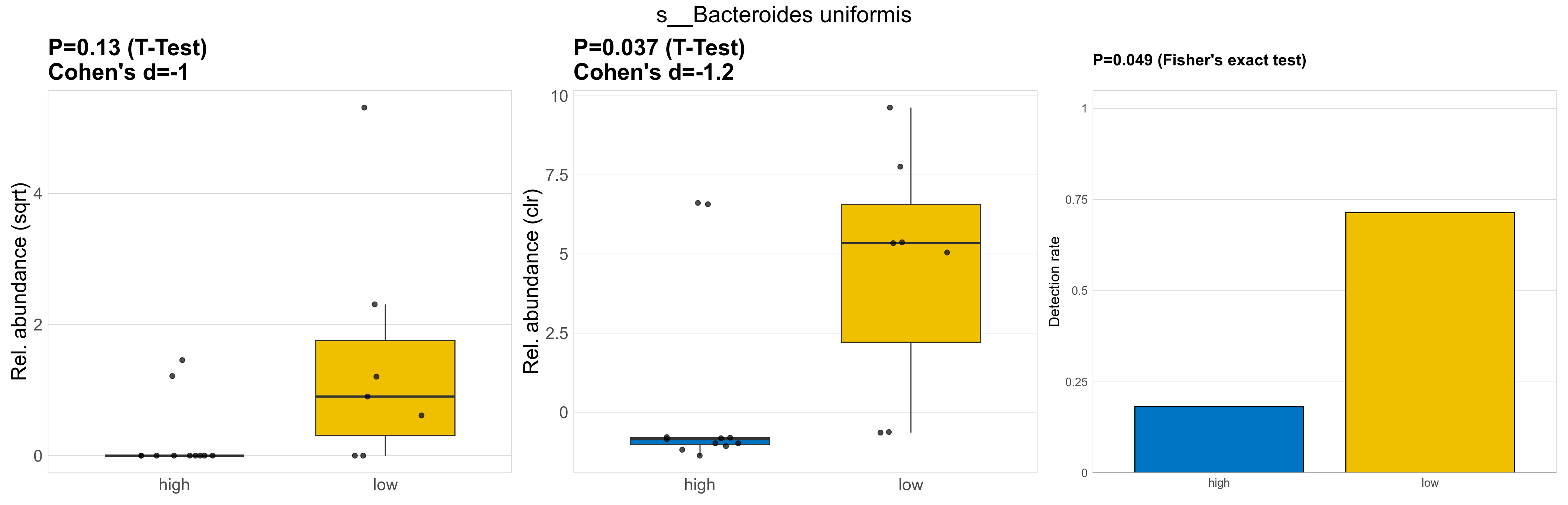 | s__Bacteroides uniformis | d__Bacteria; p__Bacteroidota; c__Bacteroidia; o__Bacteroidales; f__Bacteroidaceae; g__Bacteroides | 0.13 | 0.74 | 1 | -1 | 0.037 | 0.45 | 1 | -1.2 | 0.049 | 0.44 | 1 | 0.031 | 0.49 | 0.055 | 0.54 | 5.7 | 2.2 | 0 | 0.33 | 0 | 0.74 | 5.2 | 0.81 | 10 | 4 | 7 / 18 (39%) | 2 / 11 (18%) | 5 / 7 (71%) | 0.182 | 0.714 |