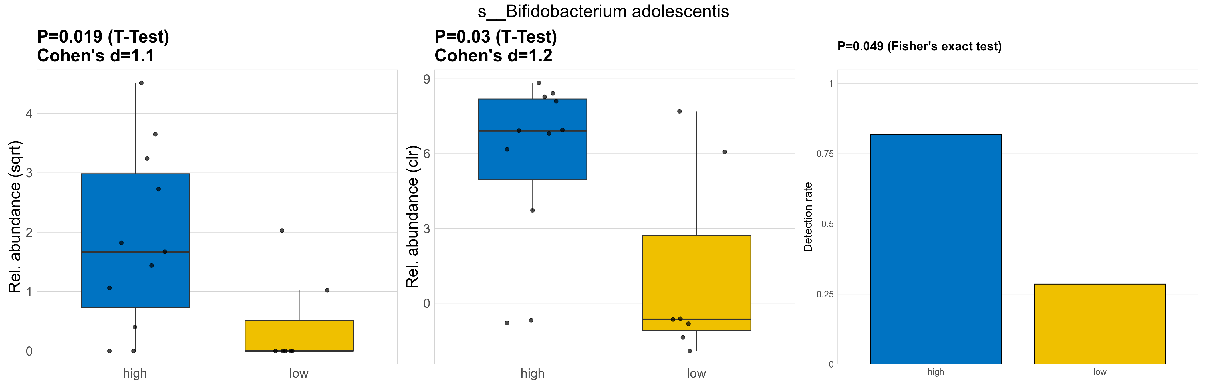 | s__Bifidobacterium adolescentis | d__Bacteria; p__Actinobacteriota; c__Actinobacteria; o__Actinomycetales; f__Bifidobacteriaceae; g__Bifidobacterium | 0.019 | 0.72 | 1 | 1.1 | 0.03 | 0.45 | 1 | 1.2 | 0.049 | 0.44 | 1 | 0.044 | 0.53 | 0.046 | 0.54 | 6 | 3.7 | 1.1 | 5.6 | 2.8 | 6.7 | 0.74 | 0 | 1.5 | -2.9 | 11 / 18 (61%) | 9 / 11 (82%) | 2 / 7 (29%) | 0.818 | 0.286 |
