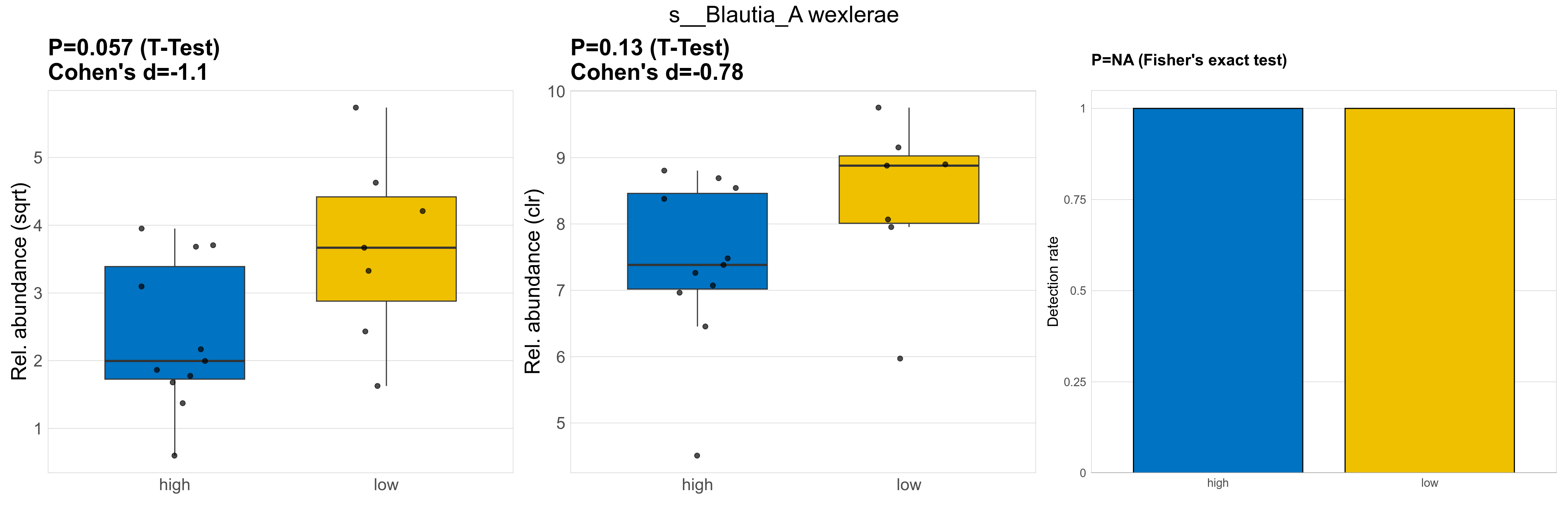 | s__Blautia_A wexlerae | d__Bacteria; p__Firmicutes_A; c__Clostridia; o__Lachnospirales; f__Lachnospiraceae; g__Blautia_A | 0.057 | 0.72 | 1 | -1.1 | 0.13 | 0.54 | 1 | -0.78 | NA | NA | NA | 0.1 | 0.55 | 0.052 | 0.55 | 9.9 | 9.9 | 7.7 | 6.6 | 4 | 5.4 | 15 | 13 | 10 | 1.2 | 18 / 18 (100%) | 11 / 11 (100%) | 7 / 7 (100%) | 1 | 1 |