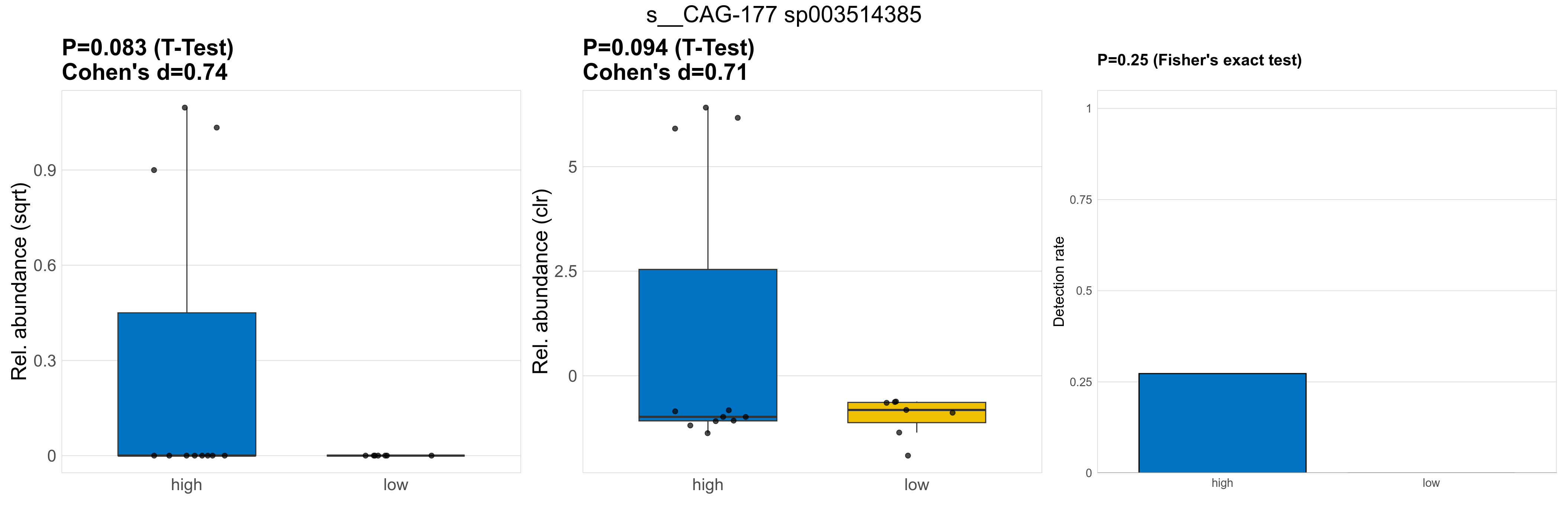 | s__CAG-177 sp003514385 | d__Bacteria; p__Firmicutes_A; c__Clostridia; o__Oscillospirales; f__Acutalibacteraceae; g__CAG-177 | 0.083 | 0.72 | 1 | 0.74 | 0.094 | 0.45 | 1 | 0.71 | 0.25 | 0.97 | 1 | 0.26 | 0.66 | 0.63 | 0.86 | 1 | 0.17 | 0 | 0.28 | 0 | 0.49 | 0 | 0 | 0 | -Inf | 3 / 18 (17%) | 3 / 11 (27%) | 0 / 7 (0%) | 0.273 | 0 |