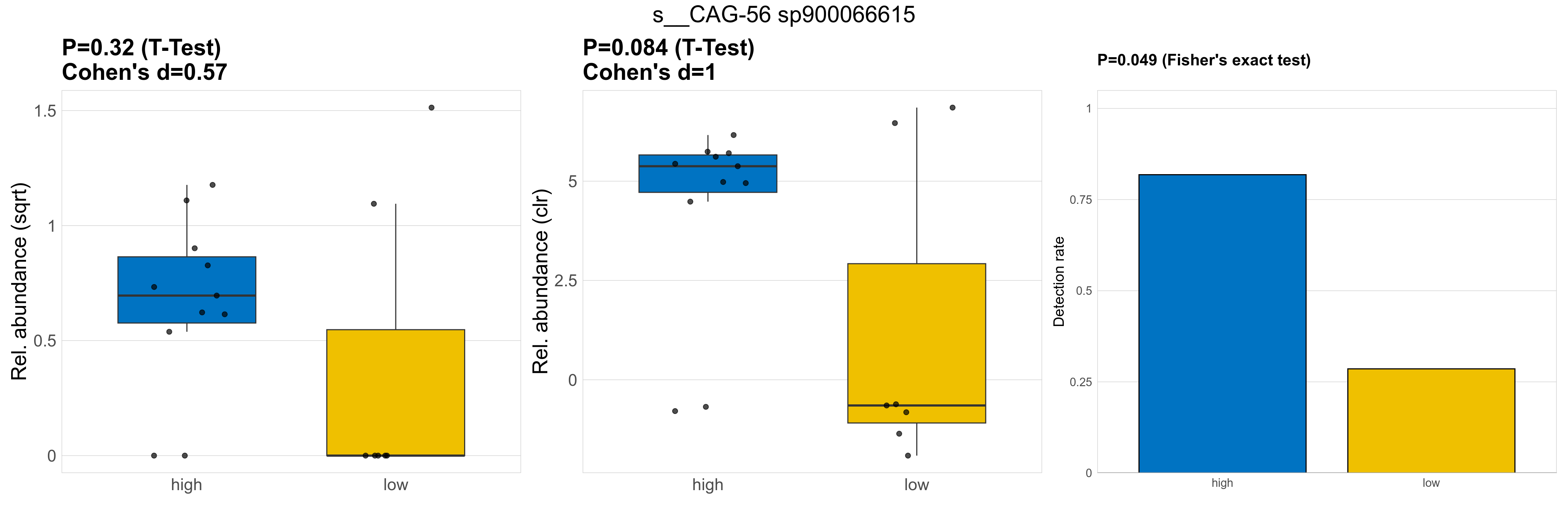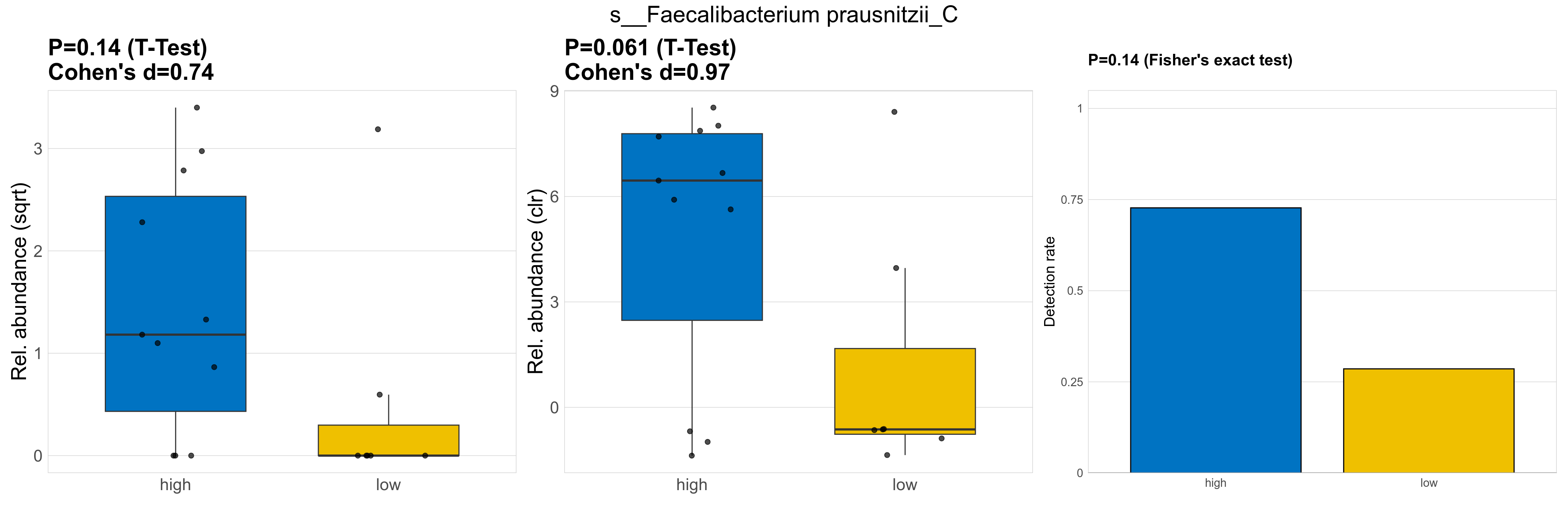 | s__Faecalibacterium prausnitzii_C | d__Bacteria; p__Firmicutes_A; c__Clostridia; o__Oscillospirales; f__Ruminococcaceae; g__Faecalibacterium | 0.14 | 0.74 | 1 | 0.74 | 0.061 | 0.45 | 1 | 0.97 | 0.14 | 0.89 | 1 | 0.12 | 0.56 | 0.19 | 0.66 | 4.9 | 2.7 | 0.55 | 3.5 | 1.4 | 4.1 | 1.5 | 0 | 3.8 | -1.2 | 10 / 18 (56%) | 8 / 11 (73%) | 2 / 7 (29%) | 0.727 | 0.286 |