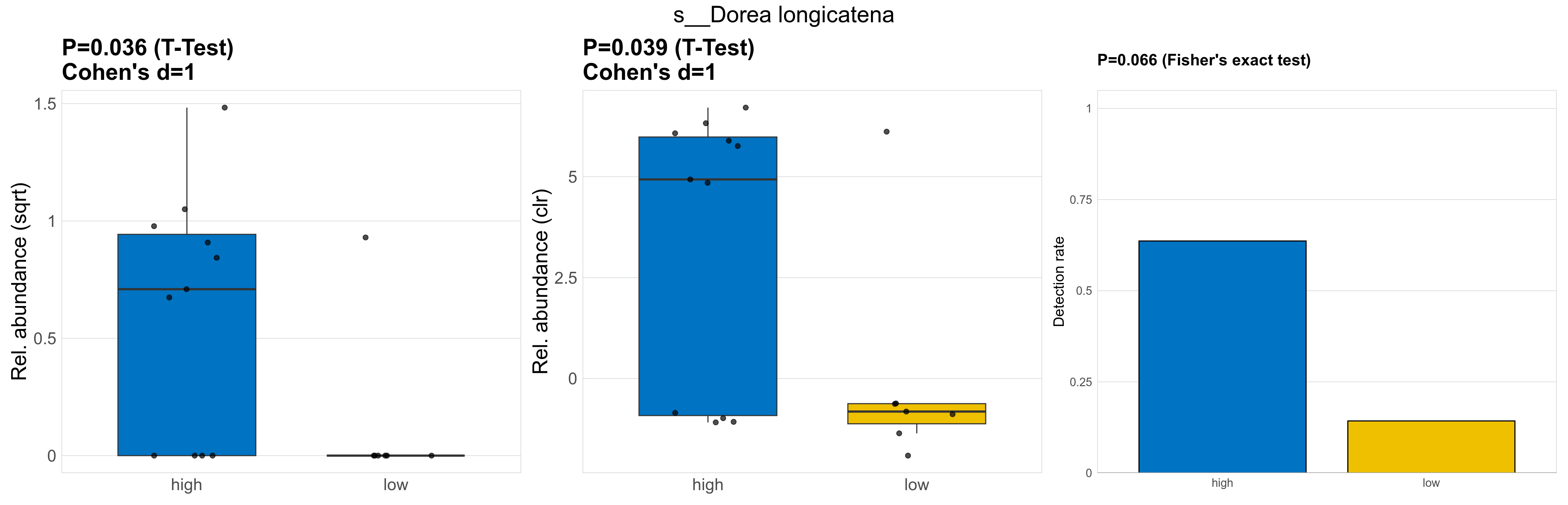 | s__Dorea longicatena | d__Bacteria; p__Firmicutes_A; c__Clostridia; o__Lachnospirales; f__Lachnospiraceae; g__Dorea | 0.036 | 0.72 | 1 | 1 | 0.039 | 0.45 | 1 | 1 | 0.066 | 0.52 | 1 | 0.082 | 0.54 | 0.24 | 0.68 | 0.95 | 0.42 | 0 | 0.61 | 0.5 | 0.67 | 0.12 | 0 | 0.33 | -2.3 | 8 / 18 (44%) | 7 / 11 (64%) | 1 / 7 (14%) | 0.636 | 0.143 |