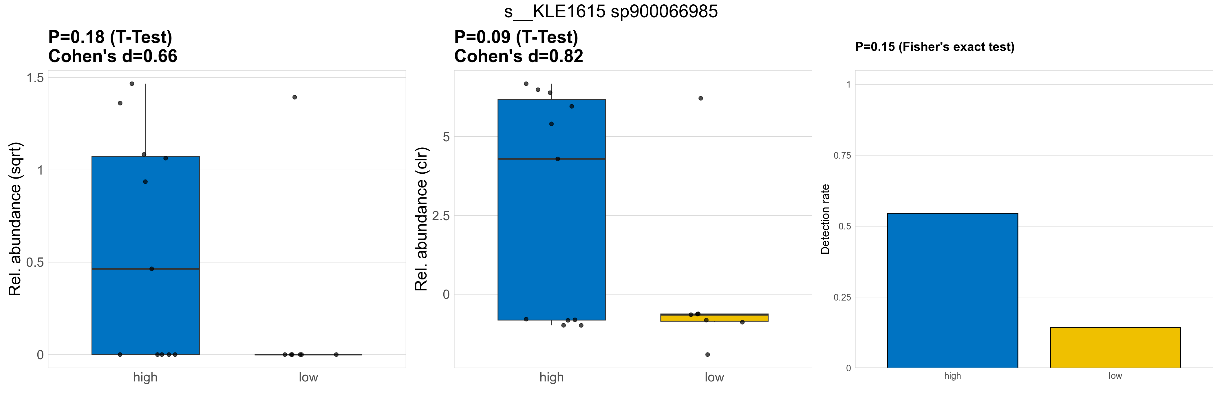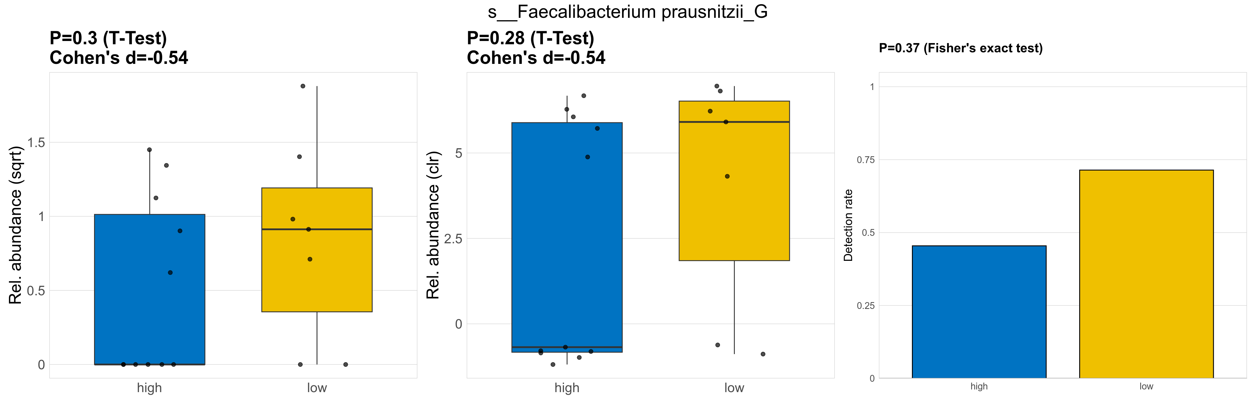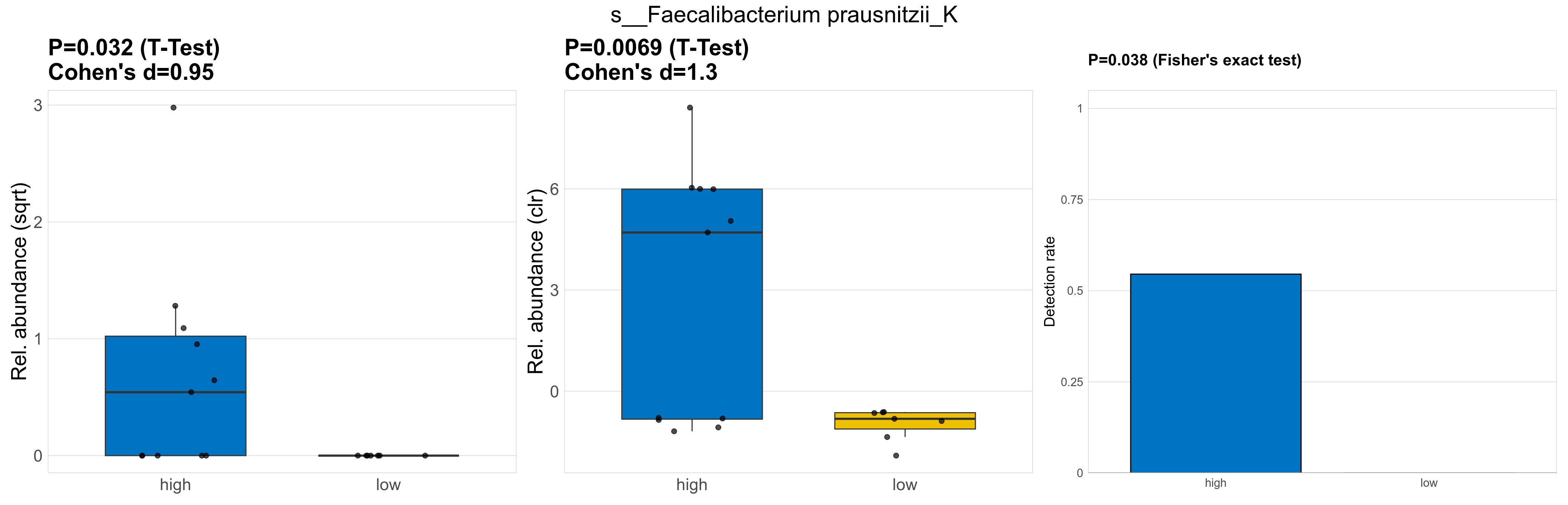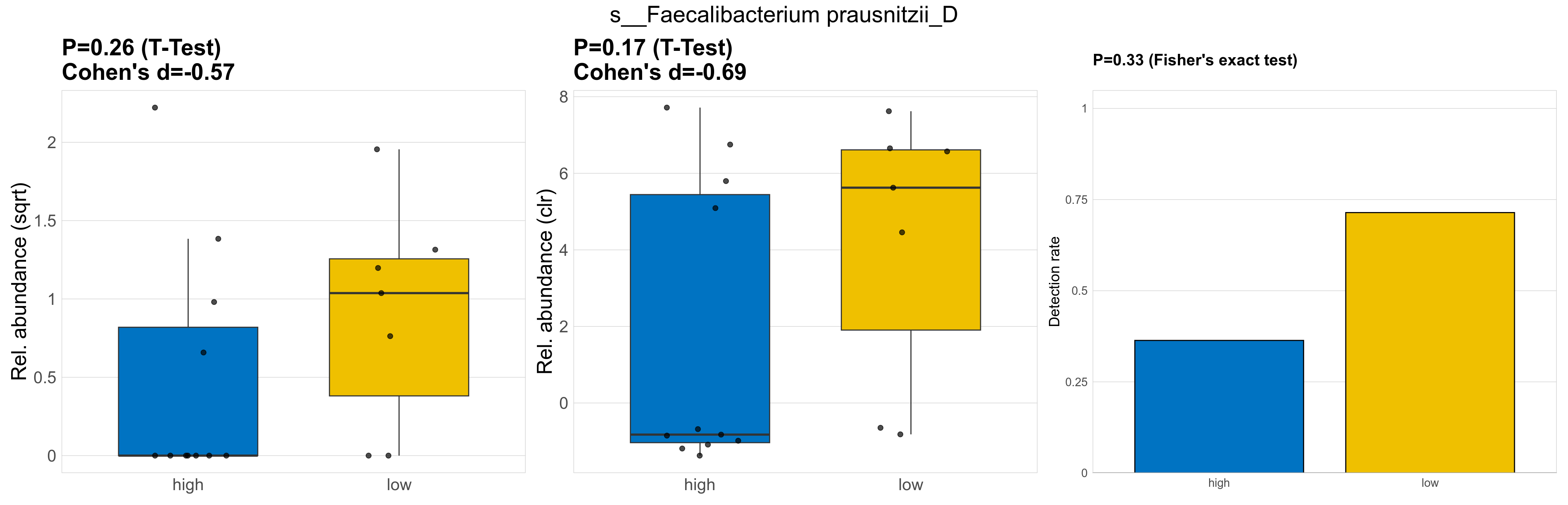 | s__Faecalibacterium prausnitzii_K | d__Bacteria; p__Firmicutes_A; c__Clostridia; o__Oscillospirales; f__Ruminococcaceae; g__Faecalibacterium | 0.032 | 0.72 | 1 | 0.95 | 0.0069 | 0.45 | 0.5 | 1.3 | 0.038 | 0.44 | 1 | 0.02 | 0.43 | 0.1 | 0.57 | 2.2 | 0.74 | 0 | 1.2 | 0.29 | 2.6 | 0 | 0 | 0 | -Inf | 6 / 18 (33%) | 6 / 11 (55%) | 0 / 7 (0%) | 0.545 | 0 |