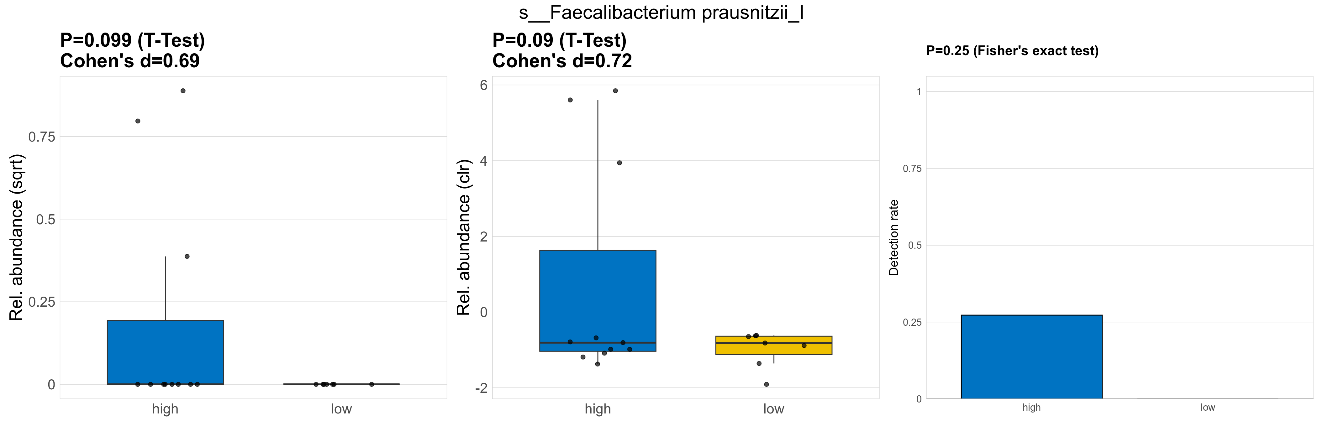 | s__Faecalibacterium prausnitzii_I | d__Bacteria; p__Firmicutes_A; c__Clostridia; o__Oscillospirales; f__Ruminococcaceae; g__Faecalibacterium | 0.099 | 0.72 | 1 | 0.69 | 0.09 | 0.45 | 1 | 0.72 | 0.25 | 0.97 | 1 | 0.26 | 0.66 | 0.54 | 0.82 | 0.52 | 0.087 | 0 | 0.14 | 0 | 0.29 | 0 | 0 | 0 | -Inf | 3 / 18 (17%) | 3 / 11 (27%) | 0 / 7 (0%) | 0.273 | 0 |